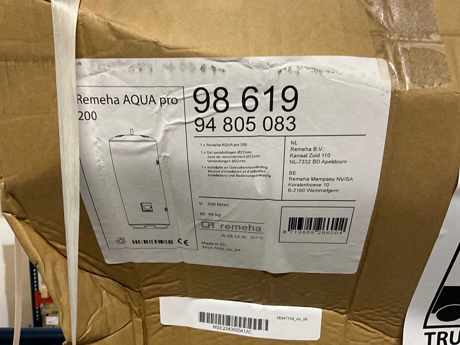 Inhoud 200L; hangende uitvoering; ongebruikt in verpakking; totale afmeting in verpakking 65x60x170 cm Merk: Remeha Model: AQUA Pro 200