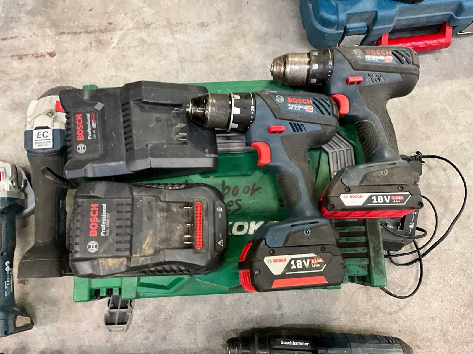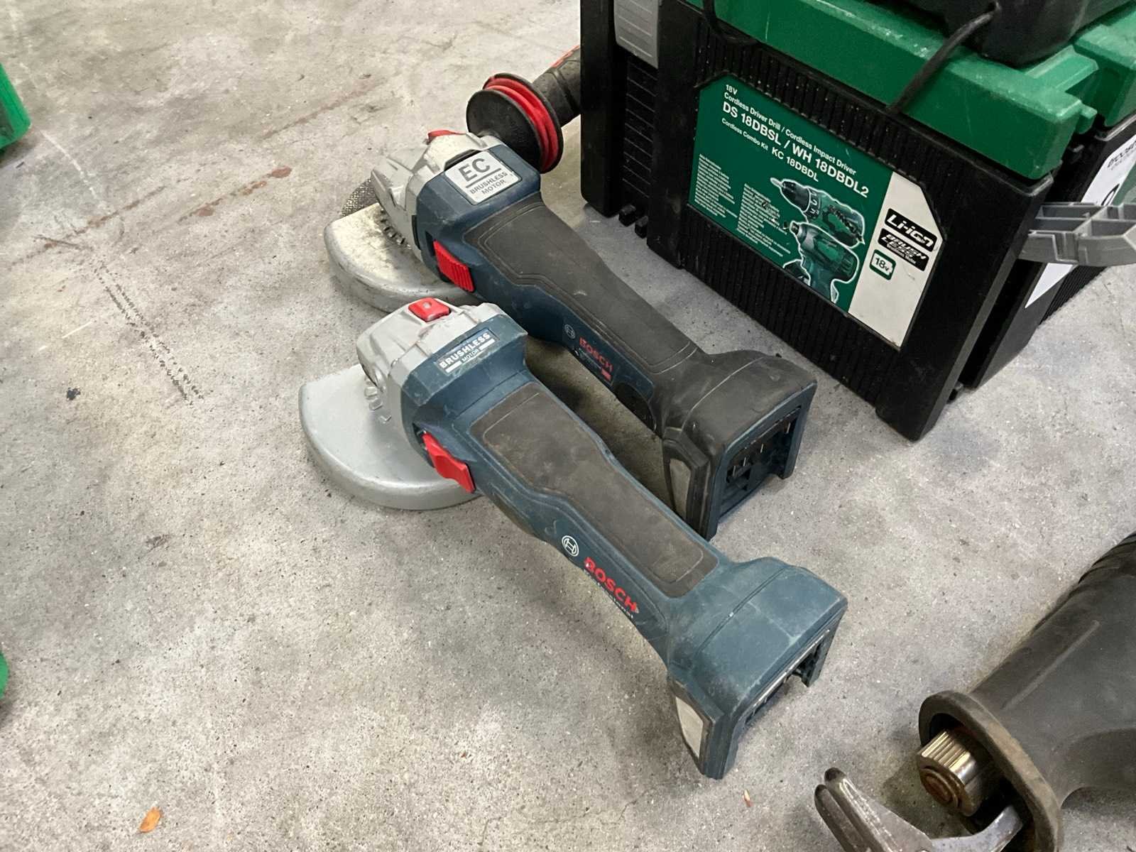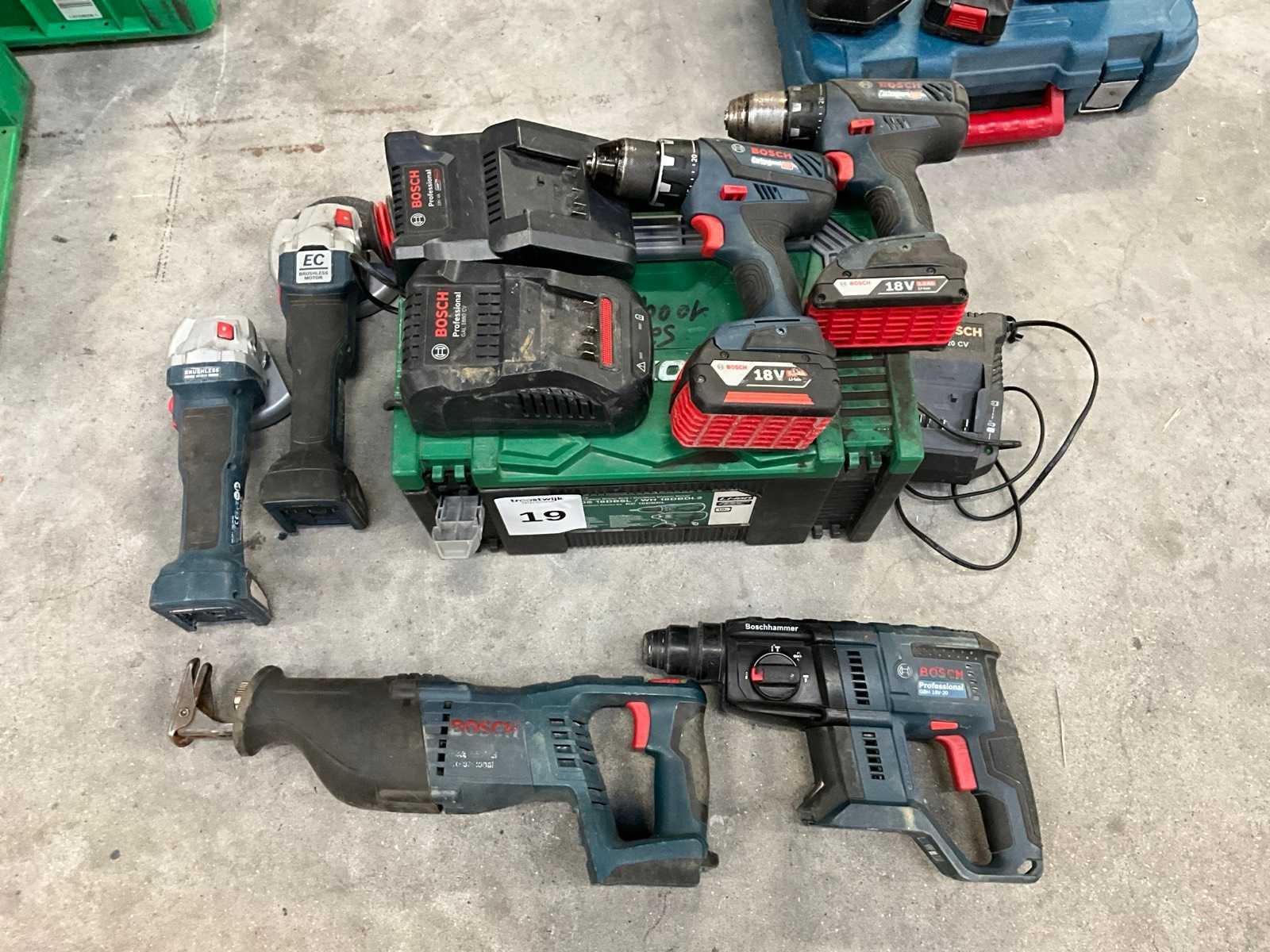 Bestaande uit 2 haakse slijpmachines; 2 schroefboormachines; boormachine en reciprozaag; voorzien van totaal 2 accu’s; 3 acculaders en 1 koffer Merk: Bosch