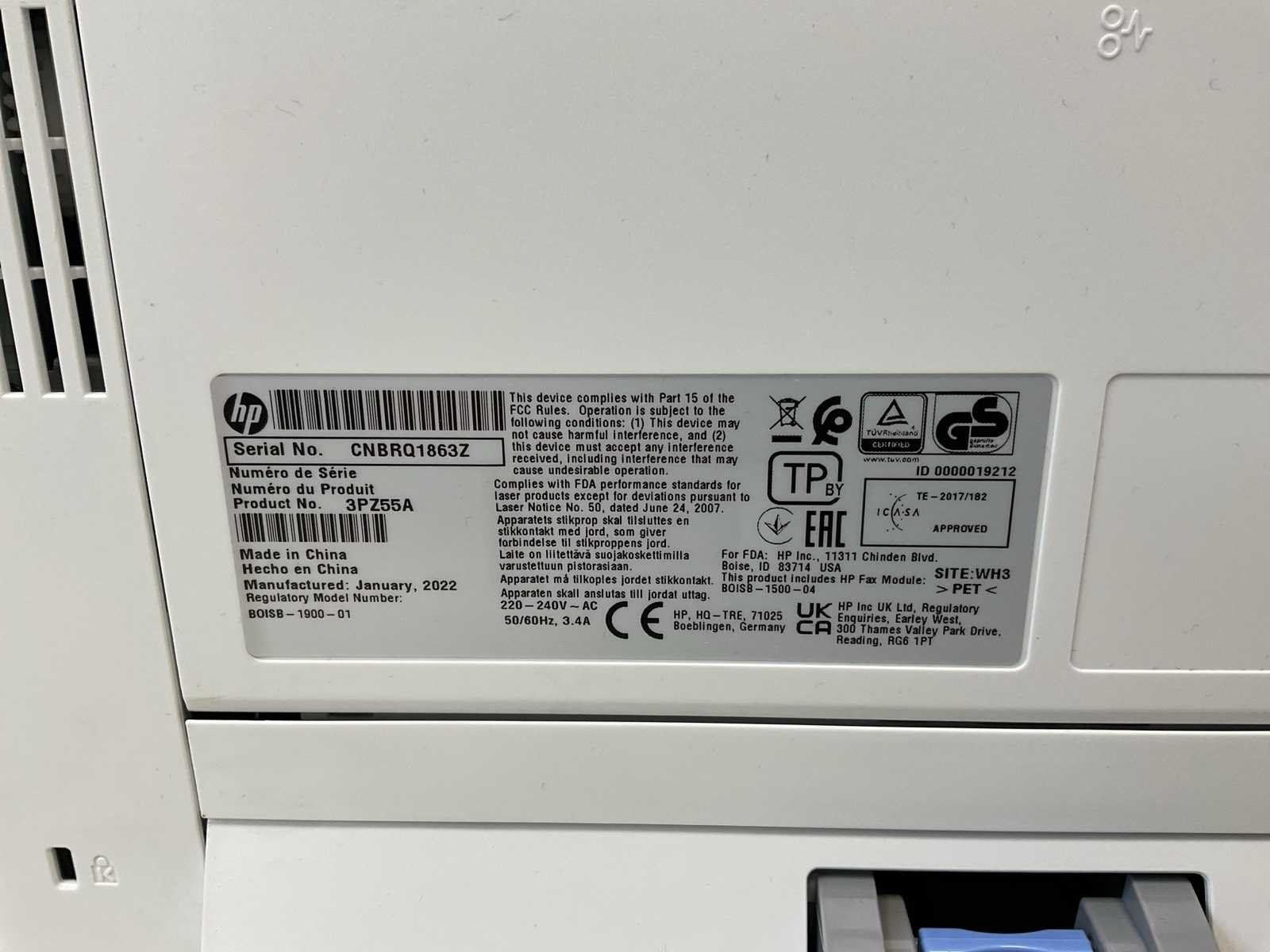 Stroomkabel inbegrepen Merk: HP Model: Laser Jet enterprise Product type: 3PZ55A Kleur: Wit Breedte: 37cm Hoogte: 32cm