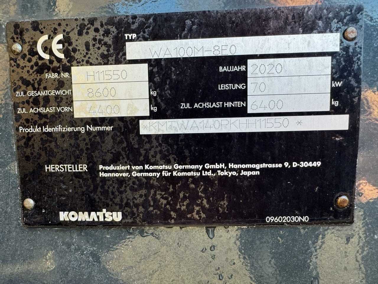 Compacte Komatsu WA100M-8E0 wiellader, bouwjaar 2020, uitgevoerd met gesloten cabine en 0,75 m³ bak. De machine verkeert in goede werkende staat en heeft een afgelezen urenstand van 3.931 uur. Voorzien van vierwielaandrijving, geschikt voor inzet in bouw, terrein- en logistieke toepassingen. Geleverd met Duitse papieren. as is where is Merk: Komatsu Type: WA100M-8E0 Bouwjaar: 2020 Merk motor: Komatsu Motorvermogen (kW): ± 55–65 kWkW Aantal cilinders: 4 Brandstof: Diesel Afgelezen urenstand: 3931 Eigen gewicht: 8.600kg