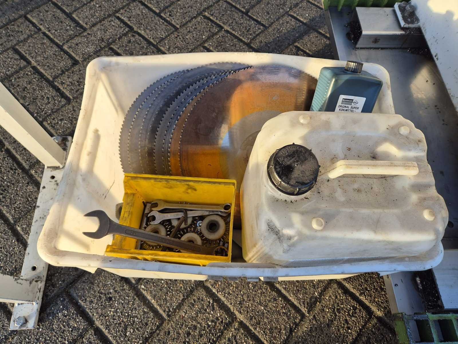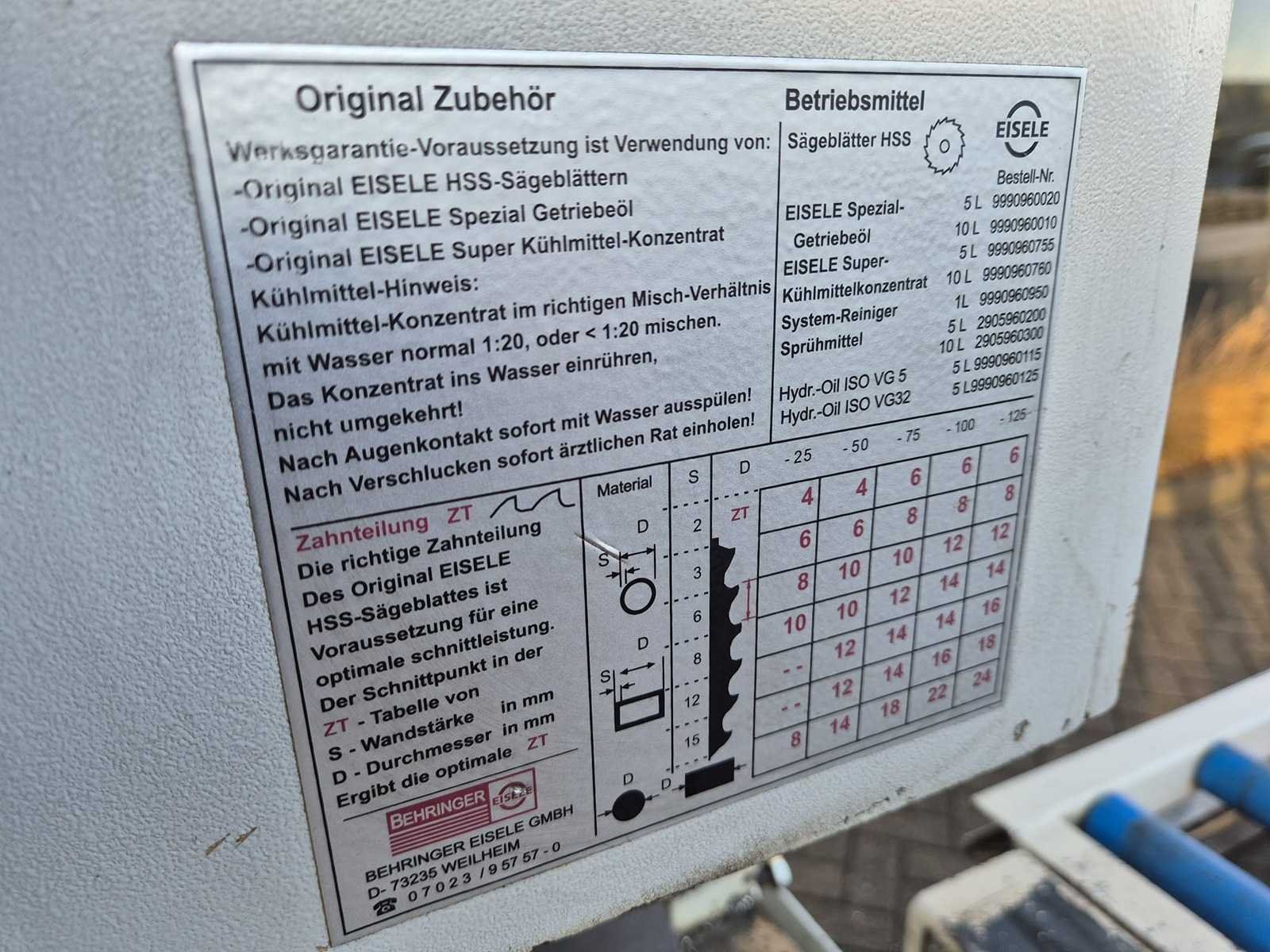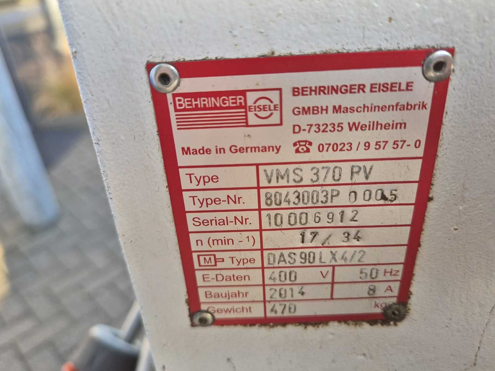 EISELE VMS 370 PV cirkelzaagmachine; bouwjaar 2014; serienummer 10006912; zaagblad Ø 370 mm; zaagbereik 220 mm; 2 snelheden; toerental 17–34 rpm; motorvermogen 2,6 kW; spanning 400 V; voorzien van koelmiddelpomp en automatische voeding; machinegewicht ca. 470 kg. Merk: EISELE Type: VMS 370 PV Bouwjaar: 2014 Serienummer: 10006912 Zaagblad Ø: 370 Zaagbereik: 220 Aantal snelheden: 2 Snelheid van n =: 17rpm Snelheid tot n =: 34rpm Koelmiddelpomp: true Motorvermogen (kW): 2.6kW Aansluiting: 400V Machinegewicht: 470kg