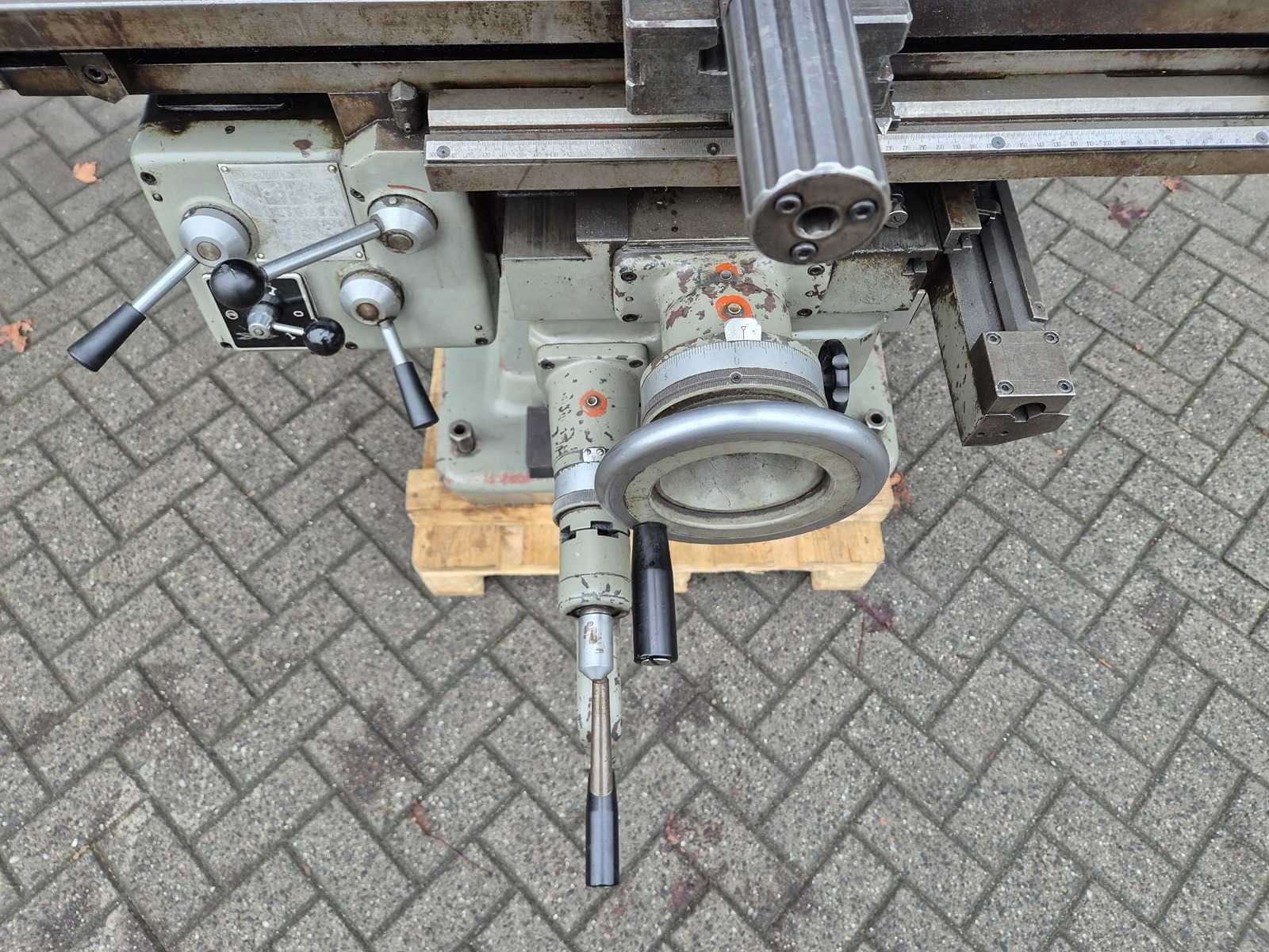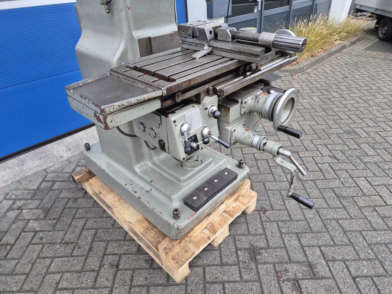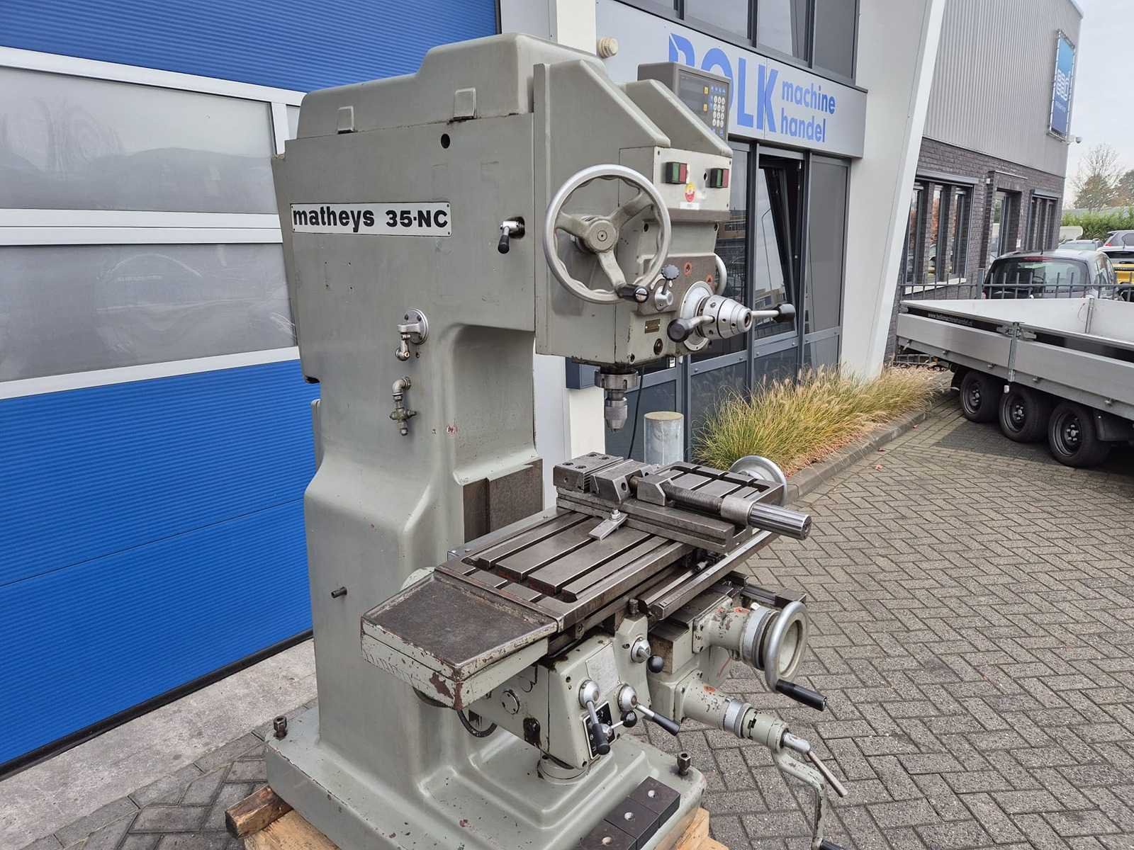 G. Matheys 35-NC universele freesbank/freesmachine; digitale uitlezing van Mitutoyo; V-snaar aandrijving; tafelafmetingen 870 x 300 mm; T-sleuf 14 mm; machineklem 150 mm; aansluiting 380 V. Merk: MATHEYS Type: 35-NC Besturing, merk, type: MITUTOYO Aansluiting: 380V