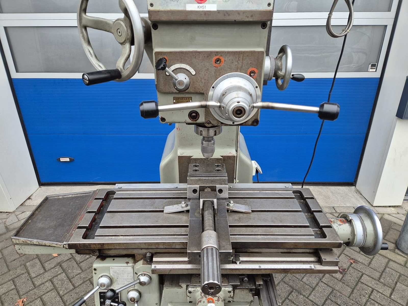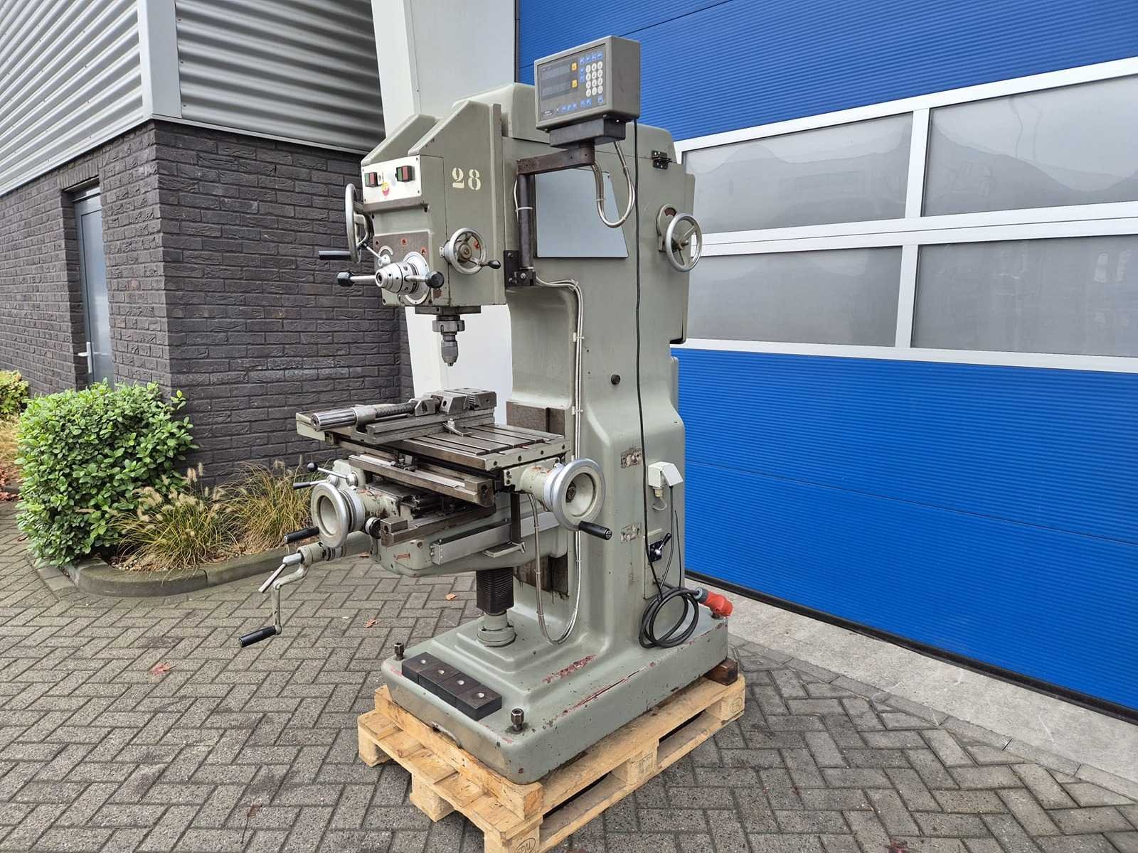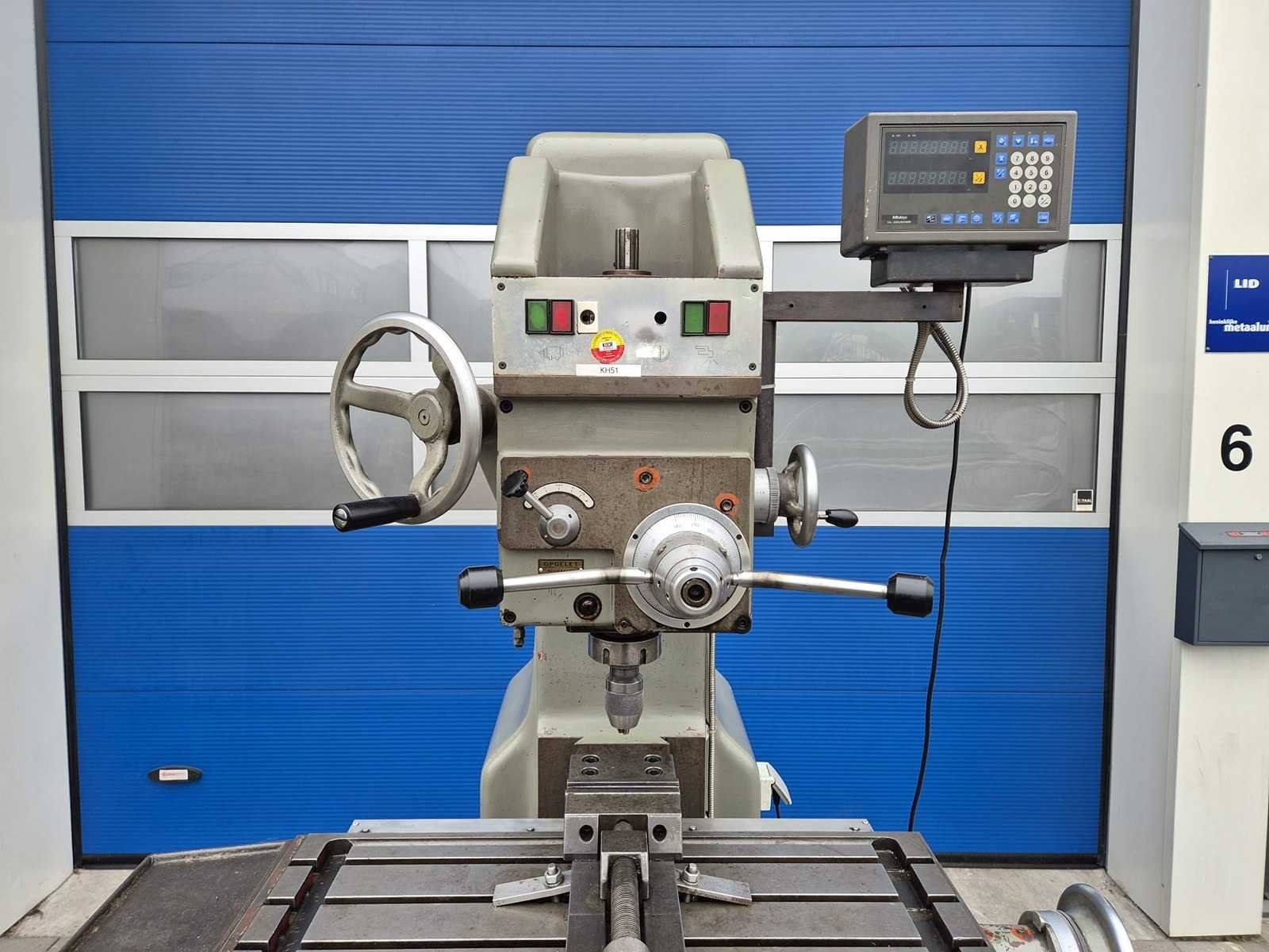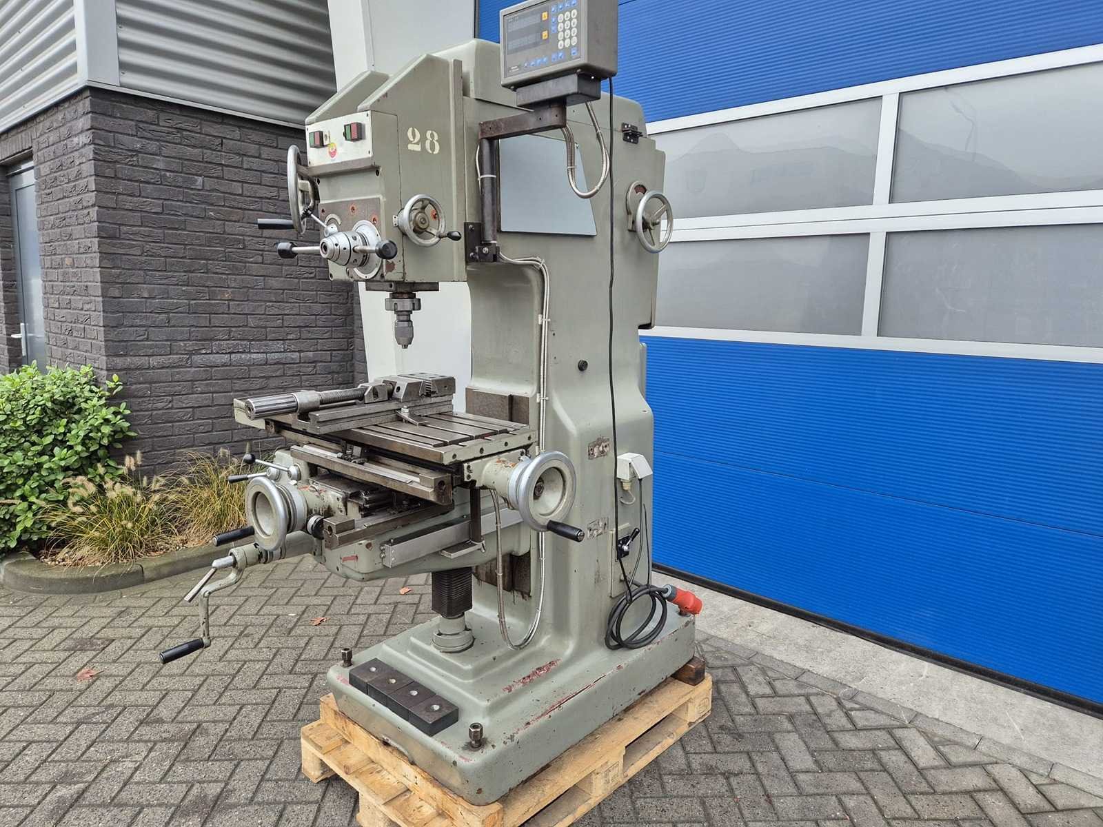 G. Matheys 35-NC universele freesbank/freesmachine; digitale uitlezing van Mitutoyo; V-snaar aandrijving; tafelafmetingen 870 x 300 mm; T-sleuf 14 mm; machineklem 150 mm; aansluiting 380 V. Merk: MATHEYS Type: 35-NC Besturing, merk, type: MITUTOYO Aansluiting: 380V