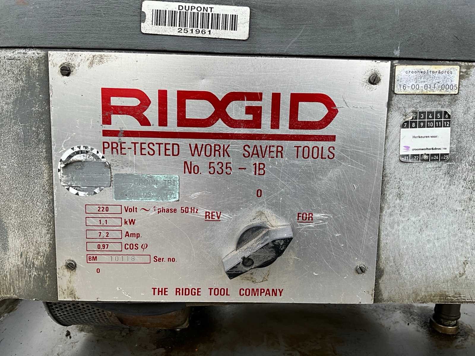 RIDGID 535 draadsnijmachine; maximale snijcapaciteit 2"; elektrische uitvoering; aansluiting 220 V; serienummer 10118. Merk: RIDGID Type: 535 Snijcapaciteit max.: 2'' Aansluiting: 220V Serienummer: 10118 Elektrisch: true