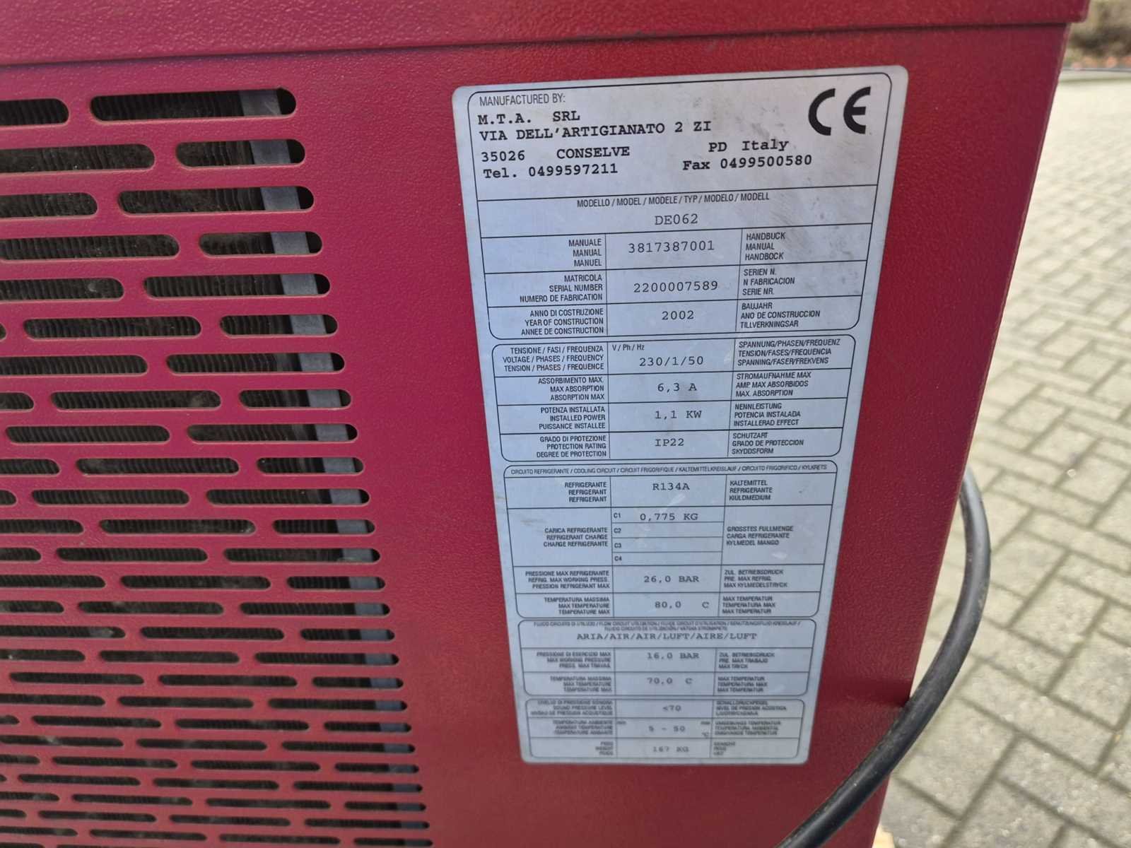MTA DE062 luchtdroger; bouwjaar 2002; serienummer 2222227589; vermogen 1,1 kW; maximale absorptie 6,3 A; koelmiddel R134A; maximale werkdruk 26 bar; aansluiting 230 V; afmetingen ca. 740 x 780 x 940 mm; eigen gewicht ca. 147 kg Merk: MTA Type: DE062 Bouwjaar: 2002 Serienummer: 2222227589 Aansluiting: 230V Totale afmeting L: 740mm Totale afmeting Breedte: 780mm Totale afmeting Hoogte: 940mm