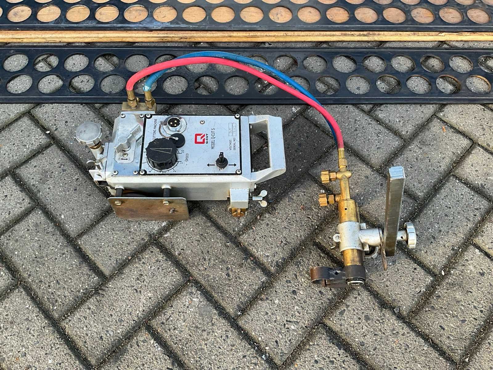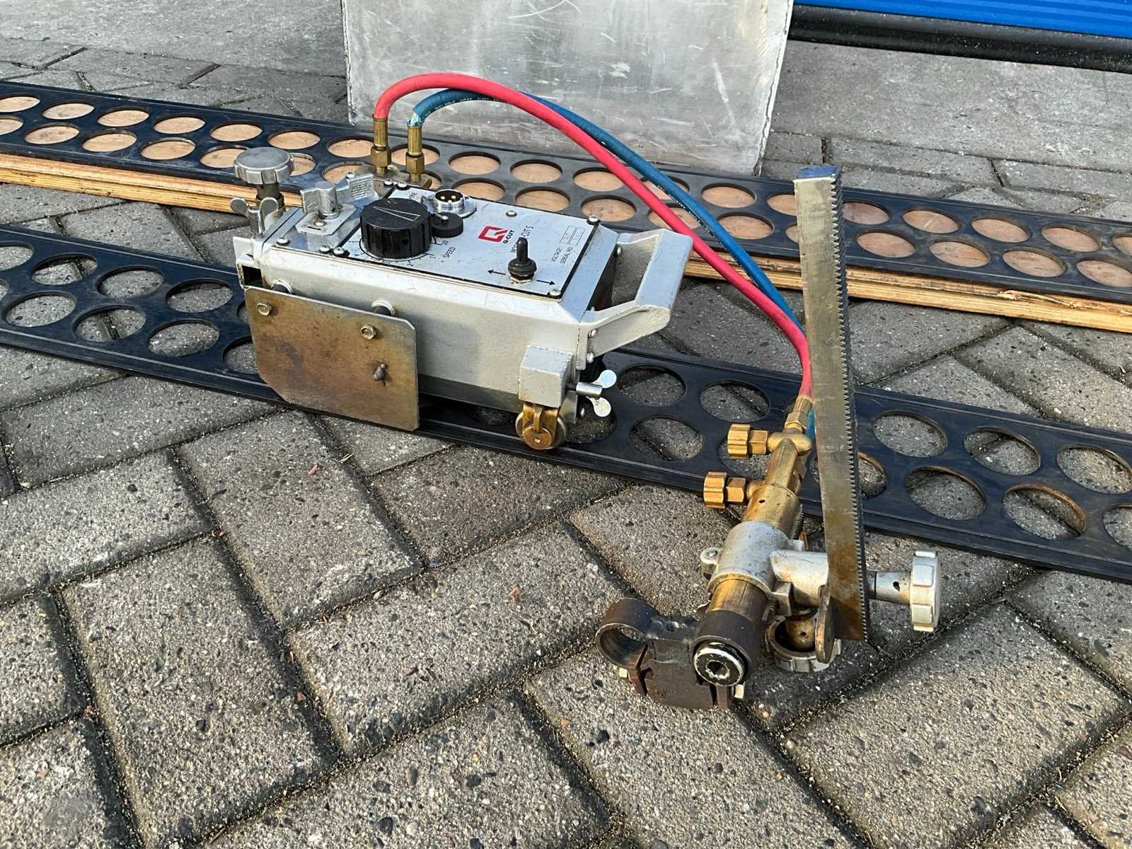 Q-CUT S elektrische snijbranderwagen op rails; serienummer 080802; elektrische uitvoering; aansluiting 220 V. Merk: Q-CUT Type: S Serienummer: 080802 Aansluiting: 220V