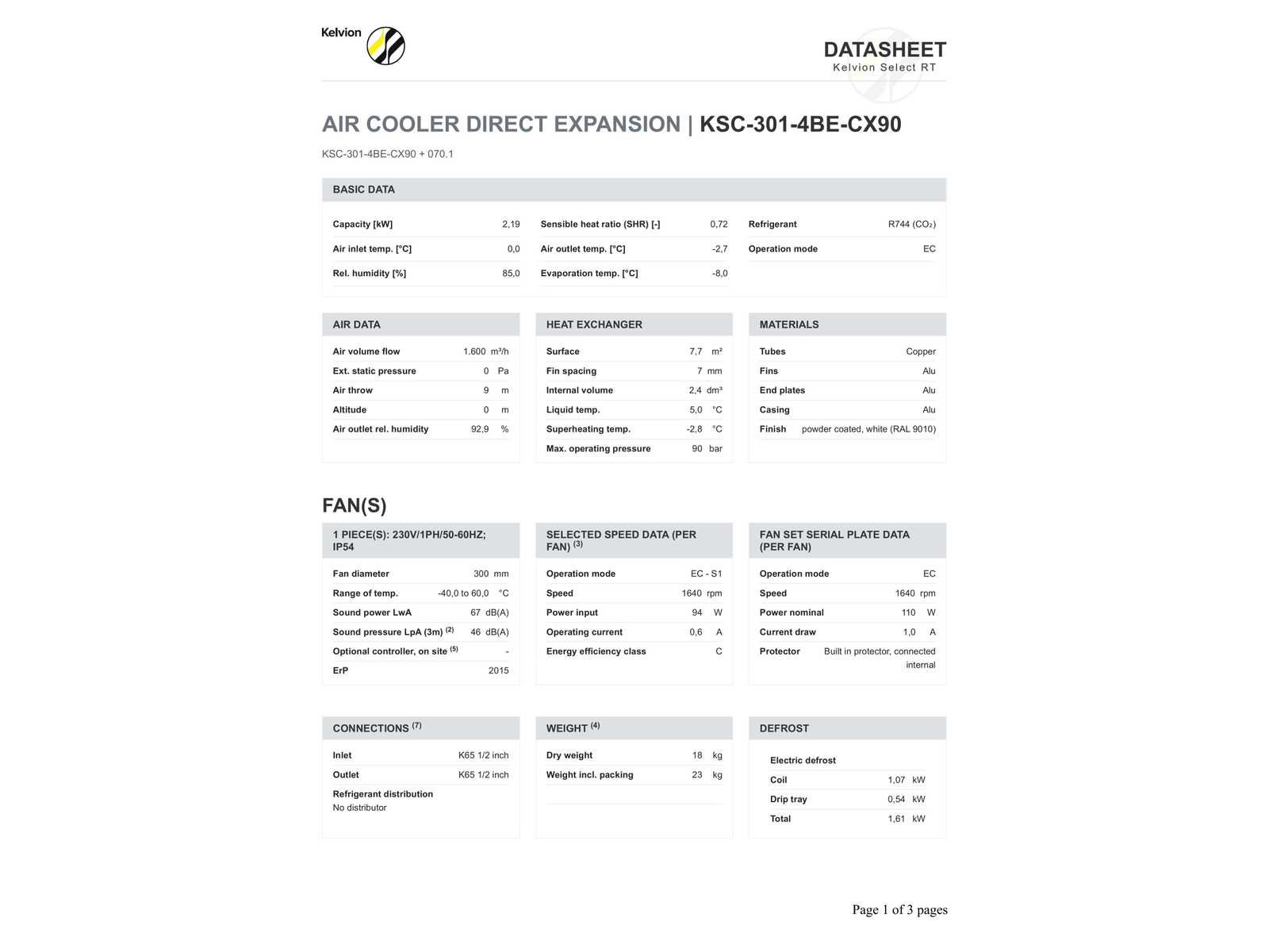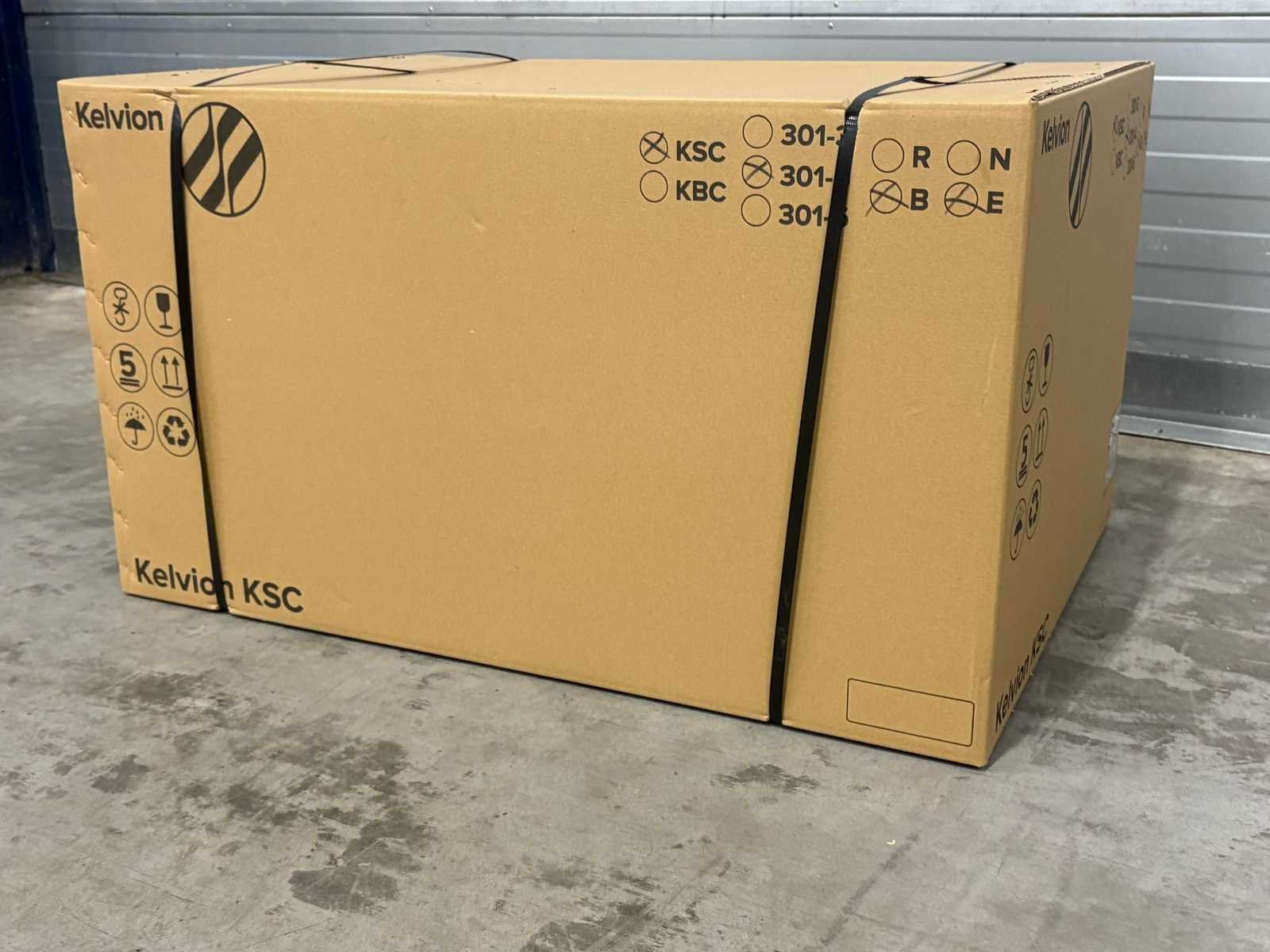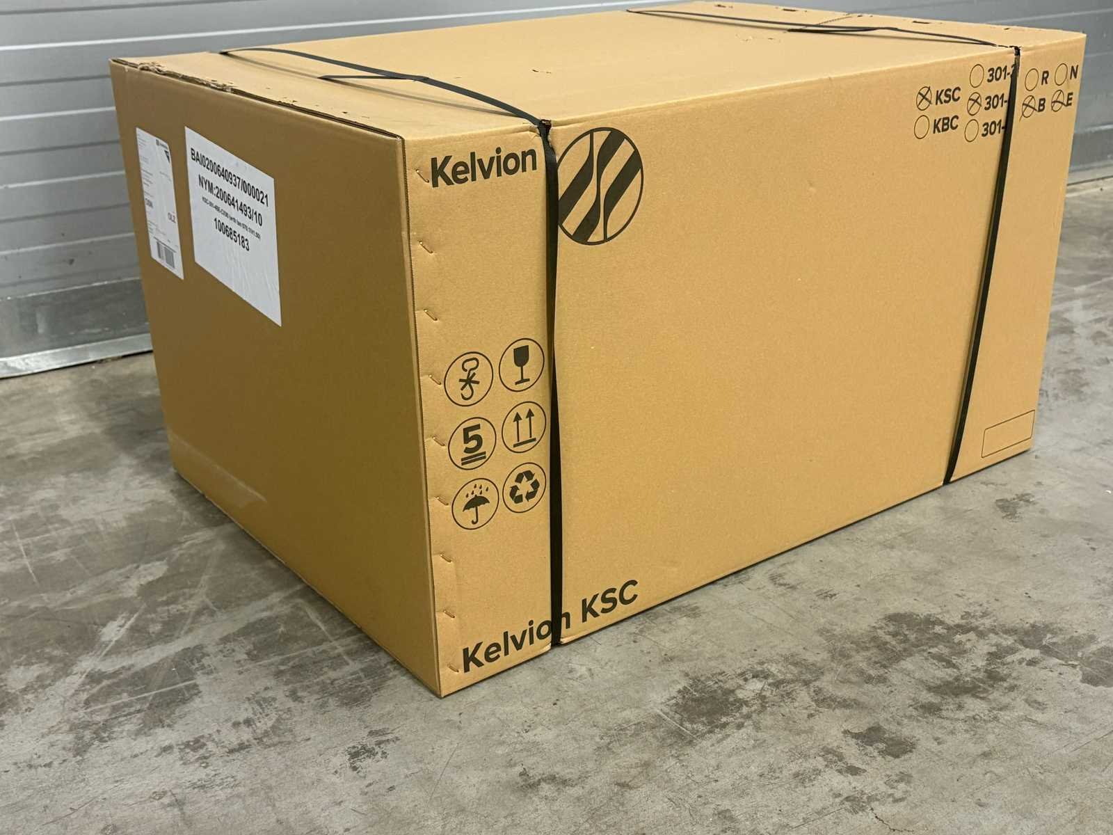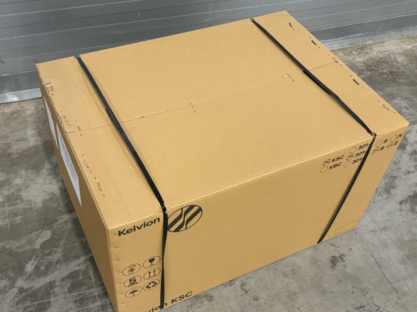 Verdamper bevind zich in transport krat/doos. Afmetingen (LxBxH) 90x66x53 cm Merk: Kelvion Aansluiting: 230V Eigen gewicht: 18kg Type koudemiddel: R744 Type: KSC 301-4BE CO2-90B
