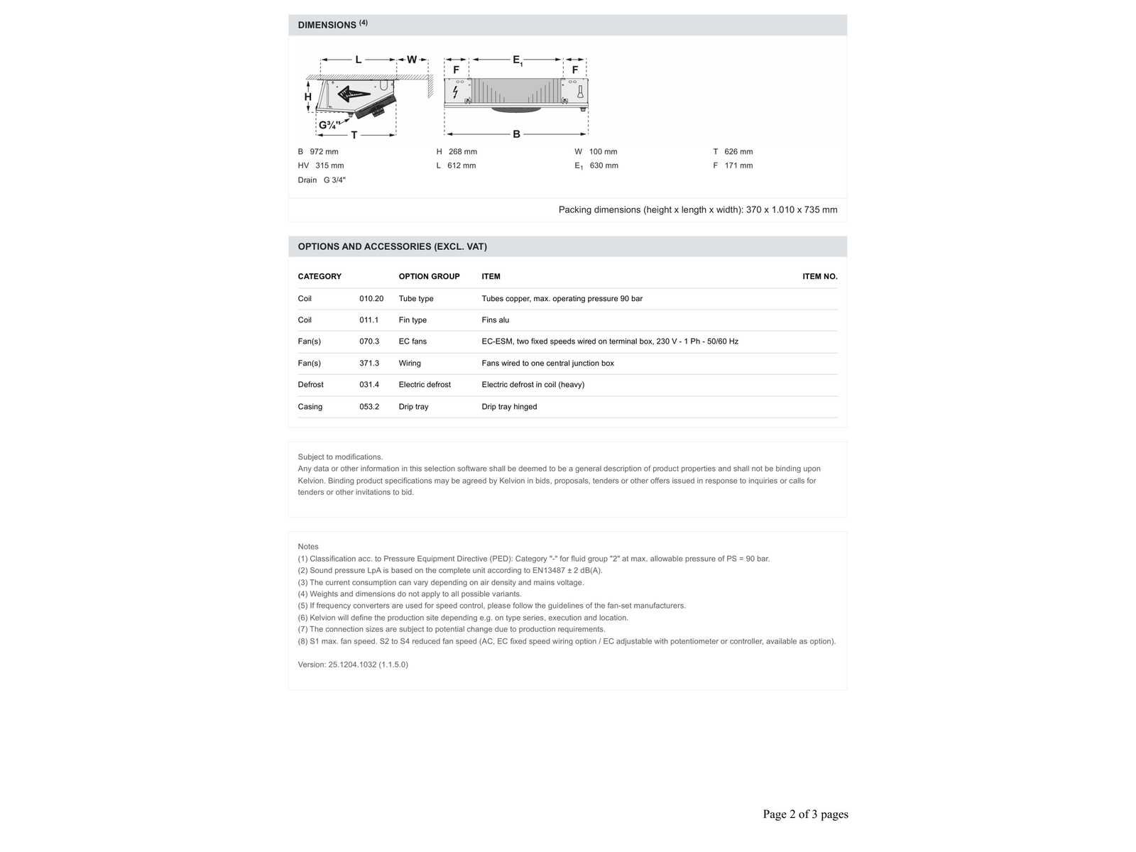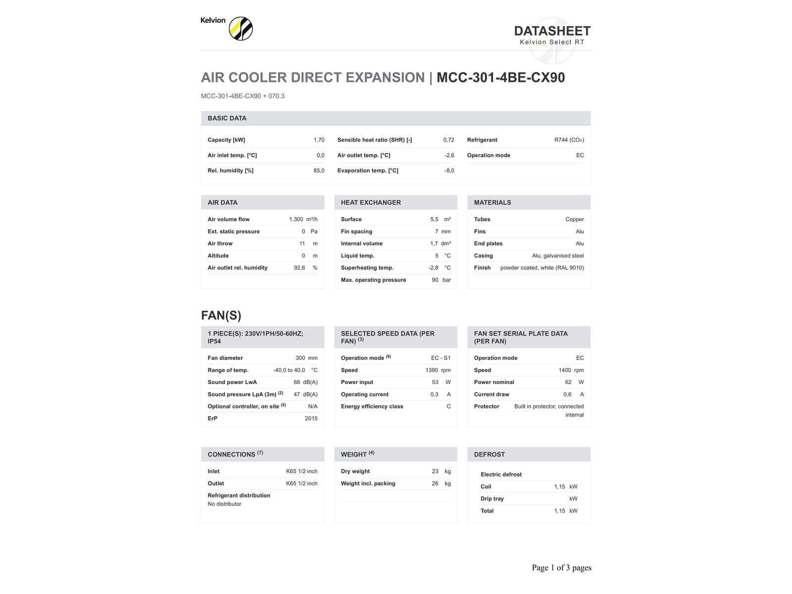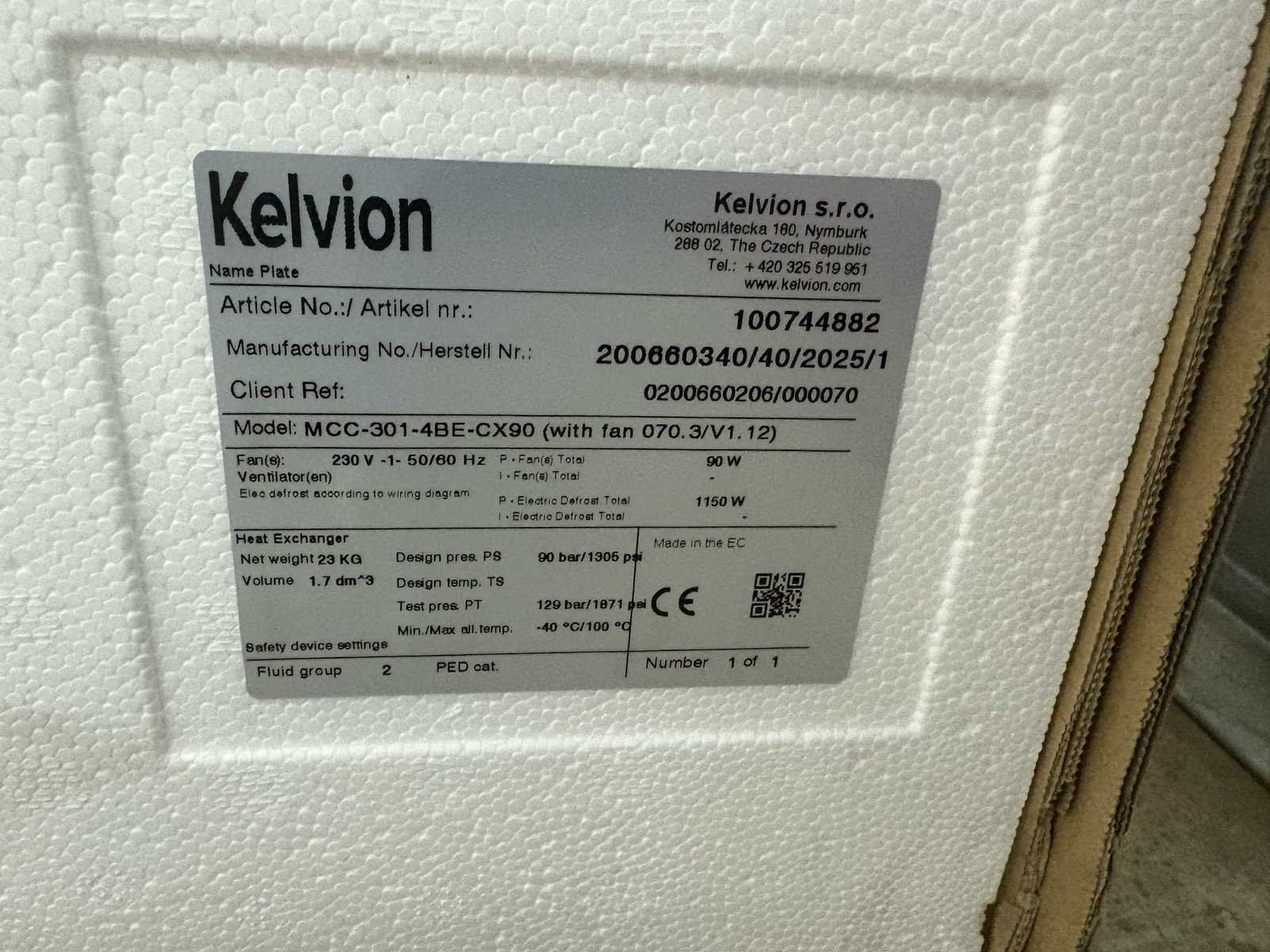 Voor Technische specificaties zie foto’s. Verdamper bevind zich in transport krat/doos. Merk: Kelvion Aansluiting: 230V Eigen gewicht: 20kg Type: MCC 301-4BE CX90