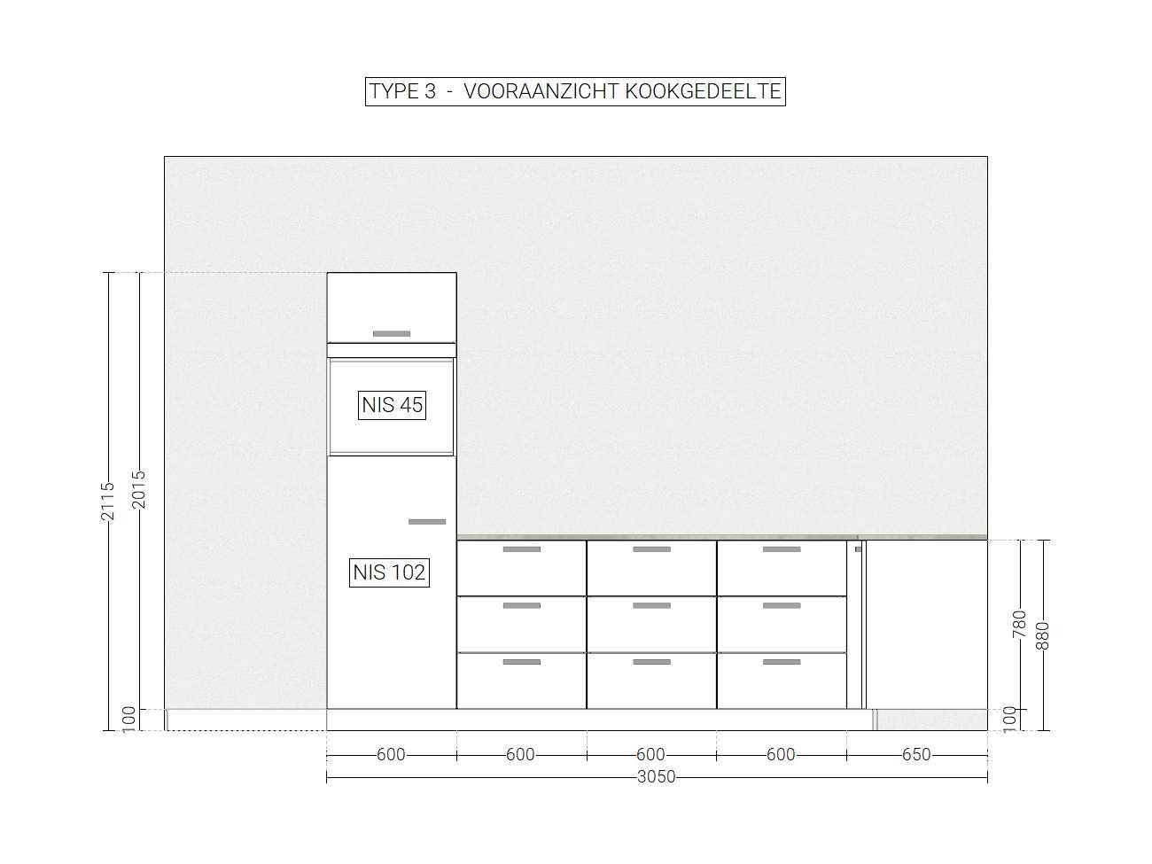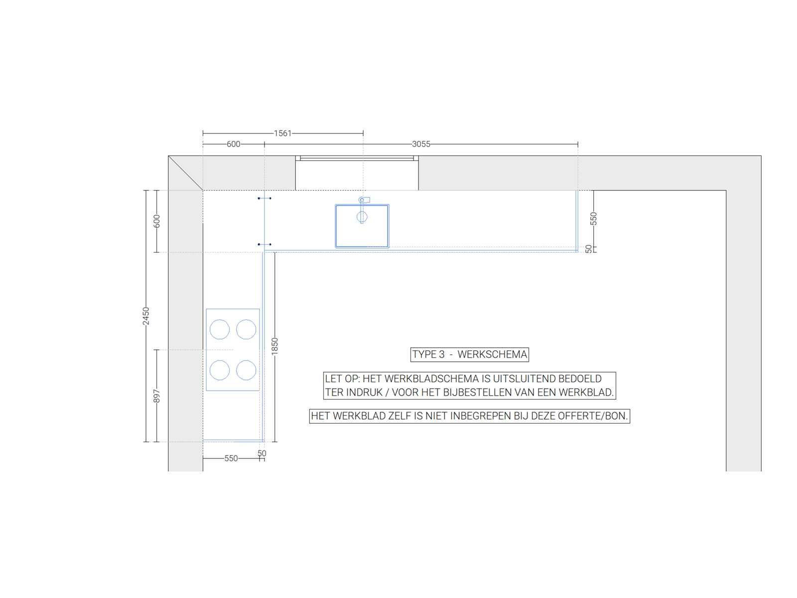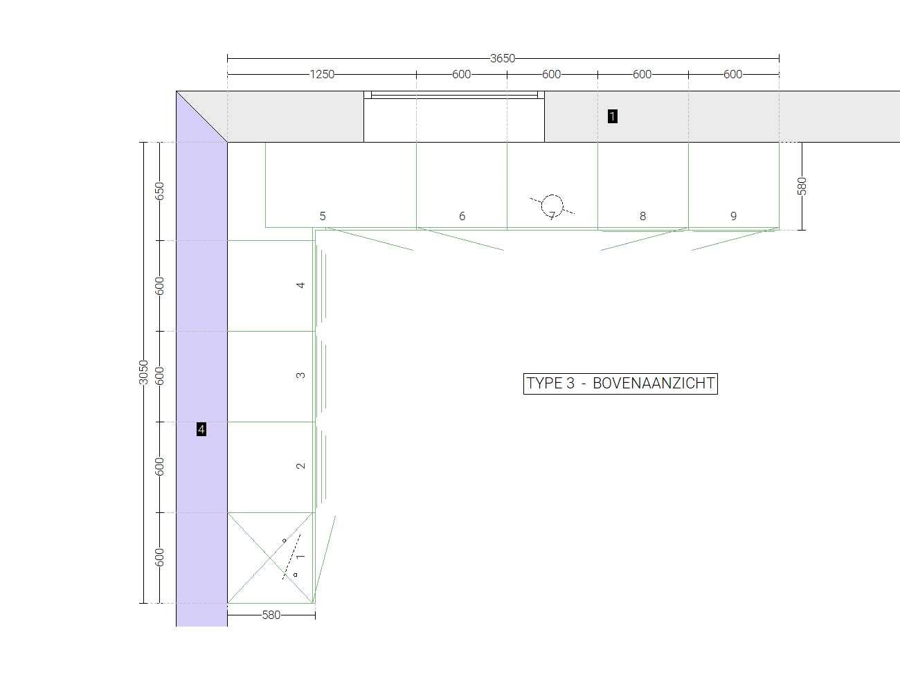 Keuken ongebruikt in doos; afmetingen linkerdeel circa 305x60x211,5 cm; afmetingen rechterdeel circa 365x60x90 cm; onder apparatuur, werkblad en plinten Nee Merk: Brigitte Type keukenopstelling: Hoek