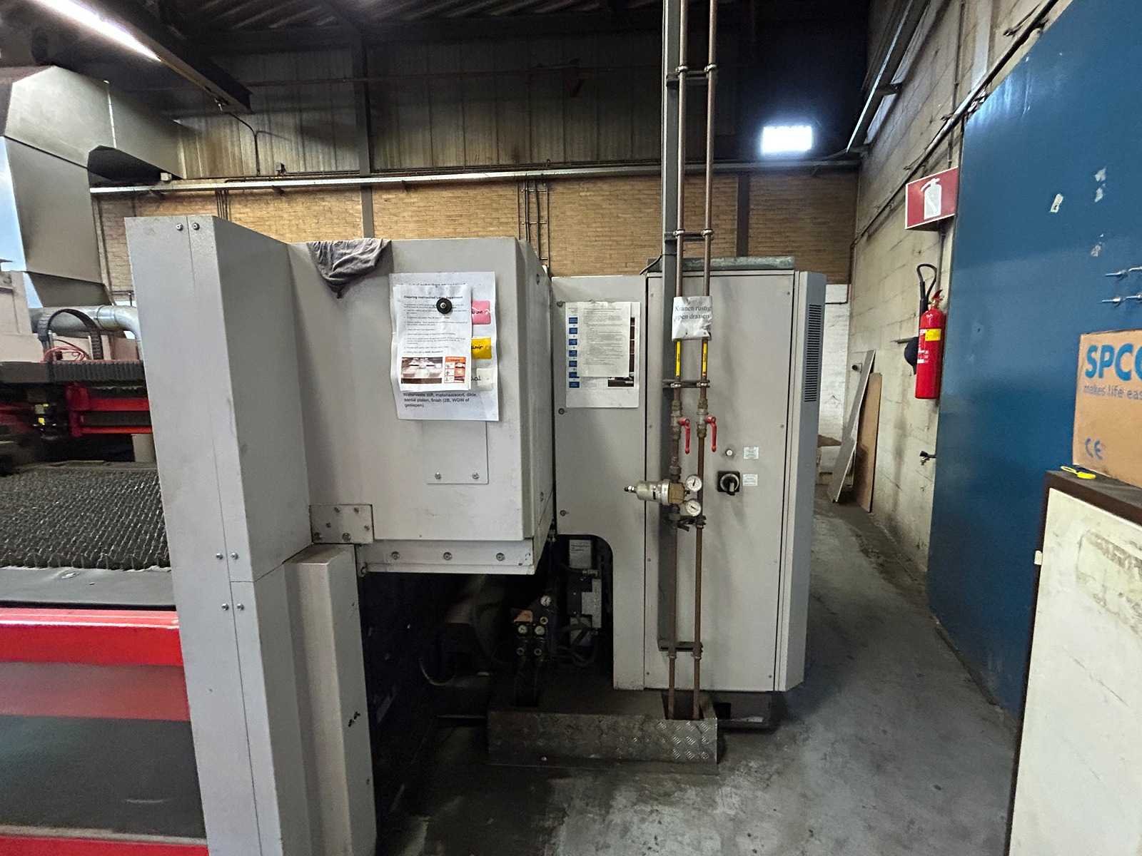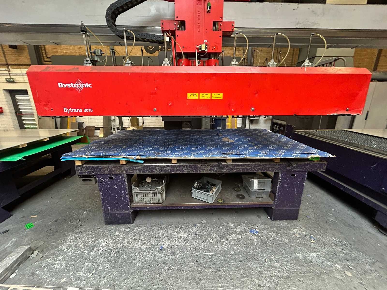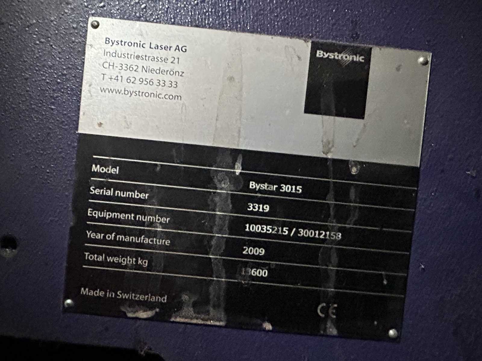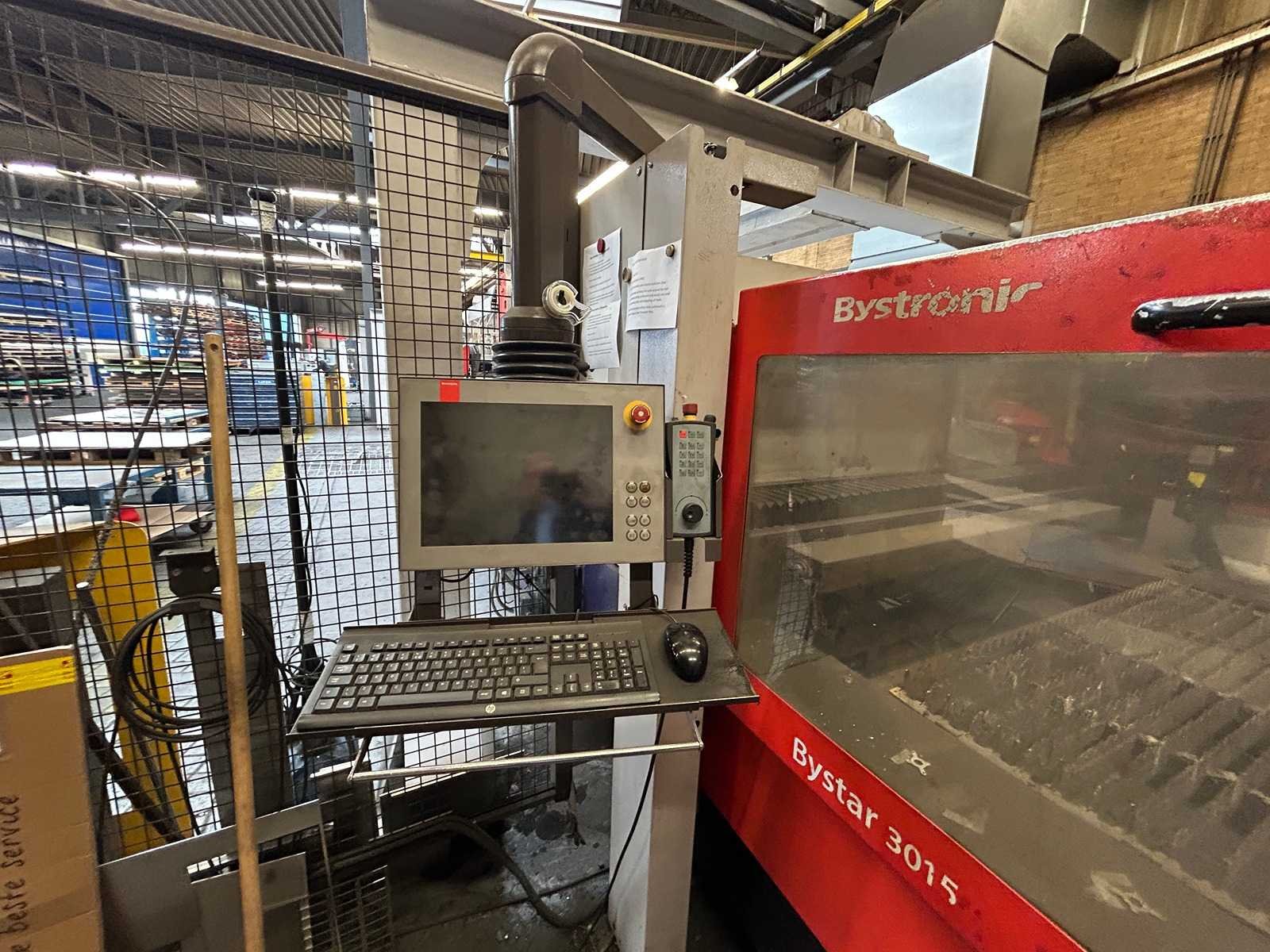 Lasersnijmachine Bystar 3015: Snij Tijd 37010 Uur. Vacuum pomp 23315 Uur. Power on Tijd 77838 Uur. Laad en los systeem Bytrans 3015 Koeler Afzuigsysteem Inclusief gasinstallatie 2024 Groot onderhoud gedaan en CPU unit vervangen. Rekeningen zijn aanwezig. machine is per direct beschikbaar. Nee Merk: Bystronic Type: Bystar 3015 + Bytrans 3015 Bouwjaar: 2009 Serienummer: 3319 Laservermogen: 4,4kW Golflengte bereik: 10600nm Werkbereik x: 3000mm Werkbereik y: 1500mm Werkbereik z: 170mm Snijsnelheid: 50m/min Tafel afmeting l: 3000mm Tafel afmeting b: 1500mm Afgelezen urenstand: 77838 Motorvermogen (kW): 51kW Aansluitwaarde: 125A Aansluiting: 380V Machinegewicht: 13000kg Afmeting l: 19000mm Afmeting b: 7300mm Afmeting h: 3883mm Leveringsvoorwaarden: Niet gefundeerd - onverpakt