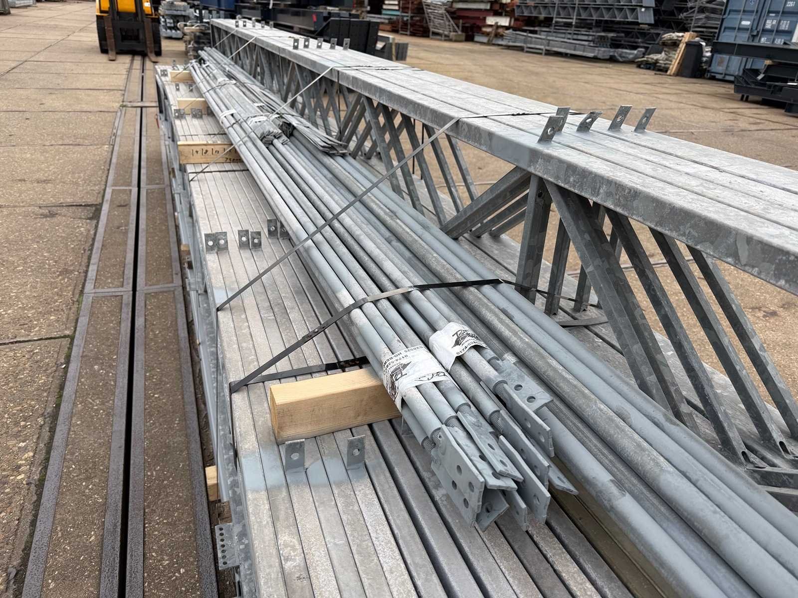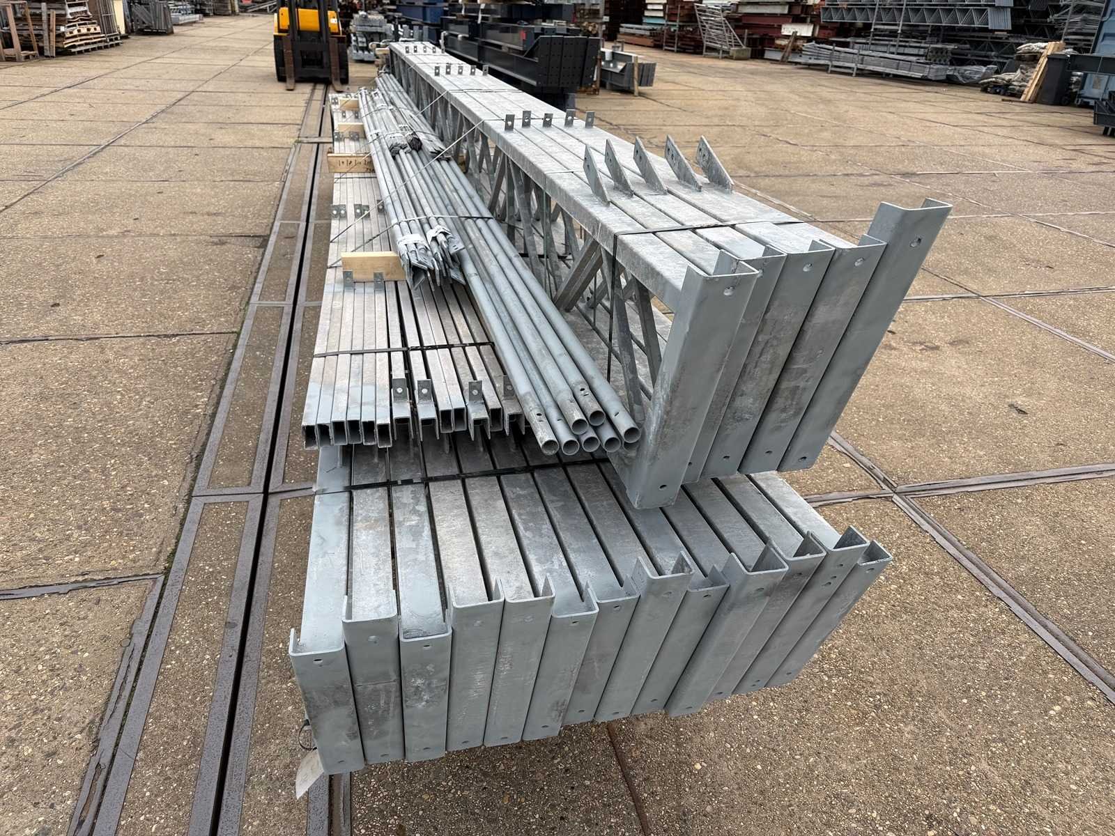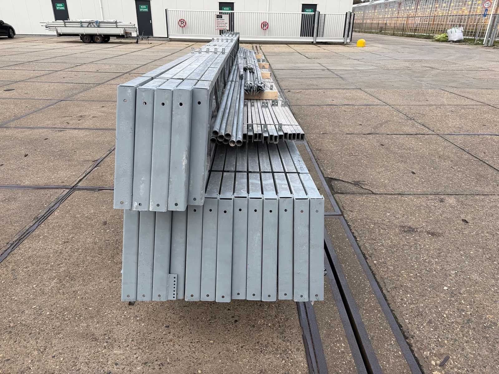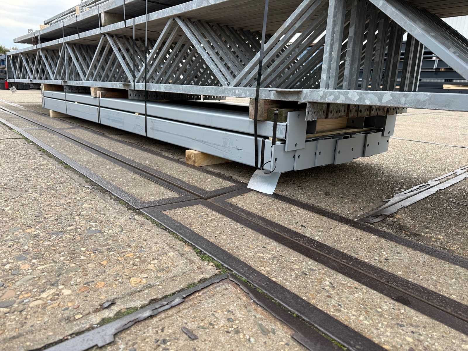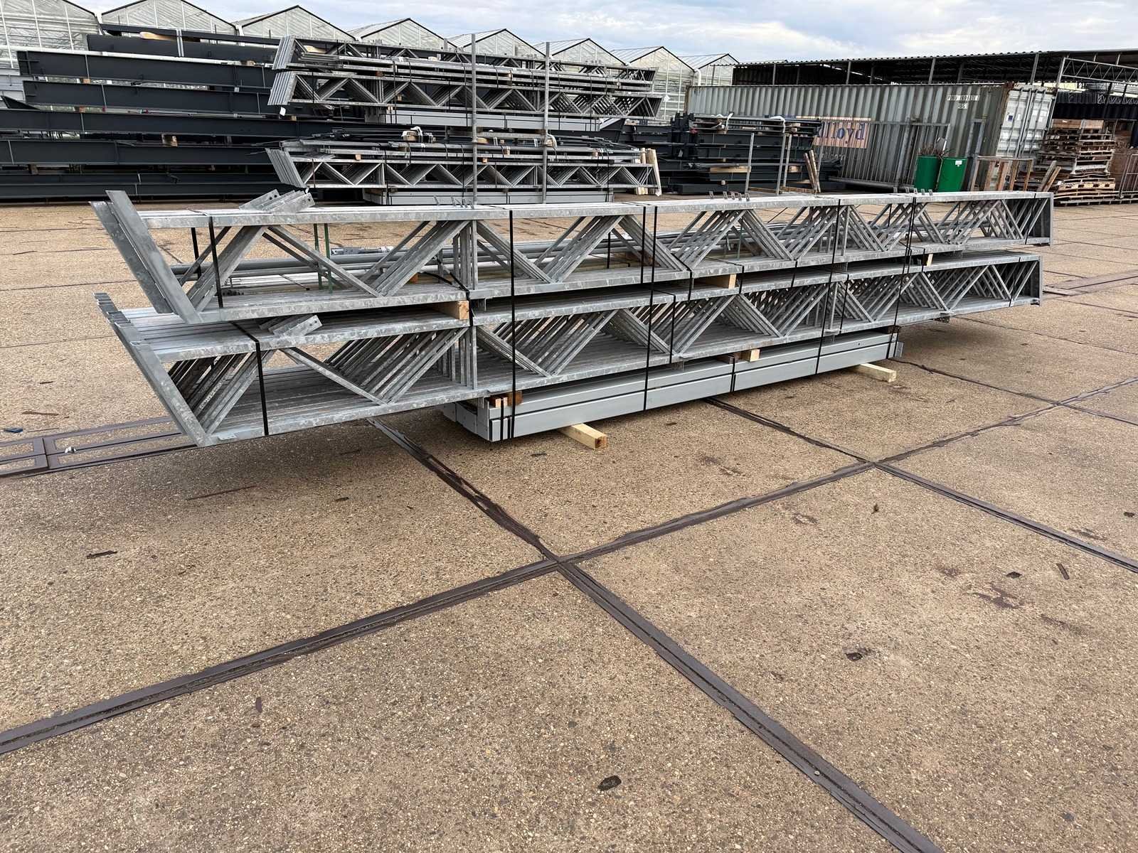 Overspanning trekstang tussen de spanten; spanten h.o.h. 4000mm; kokerprofiel als staanders en traliespanten; staaltekening; 3D-tekening; dakhelling 25 graden; 9 sets tussenspanten; voorzien van trekstangen met ophangstrips; windverbanden en kruisschoren; kavel ligt netjes transportklaar en dient met 1 trailer opgehaald te worden; kavel wordt gratis met een heftruck geladen Nee Materiaal: Gegalvaniseerd en geschilderd staal Totaal oppervlakte: 410m² Nok hoogte: 6000mm Goot hoogte: 3500mm Totale afmeting L: 32000mm Totale afmeting Breedte: 12800mm