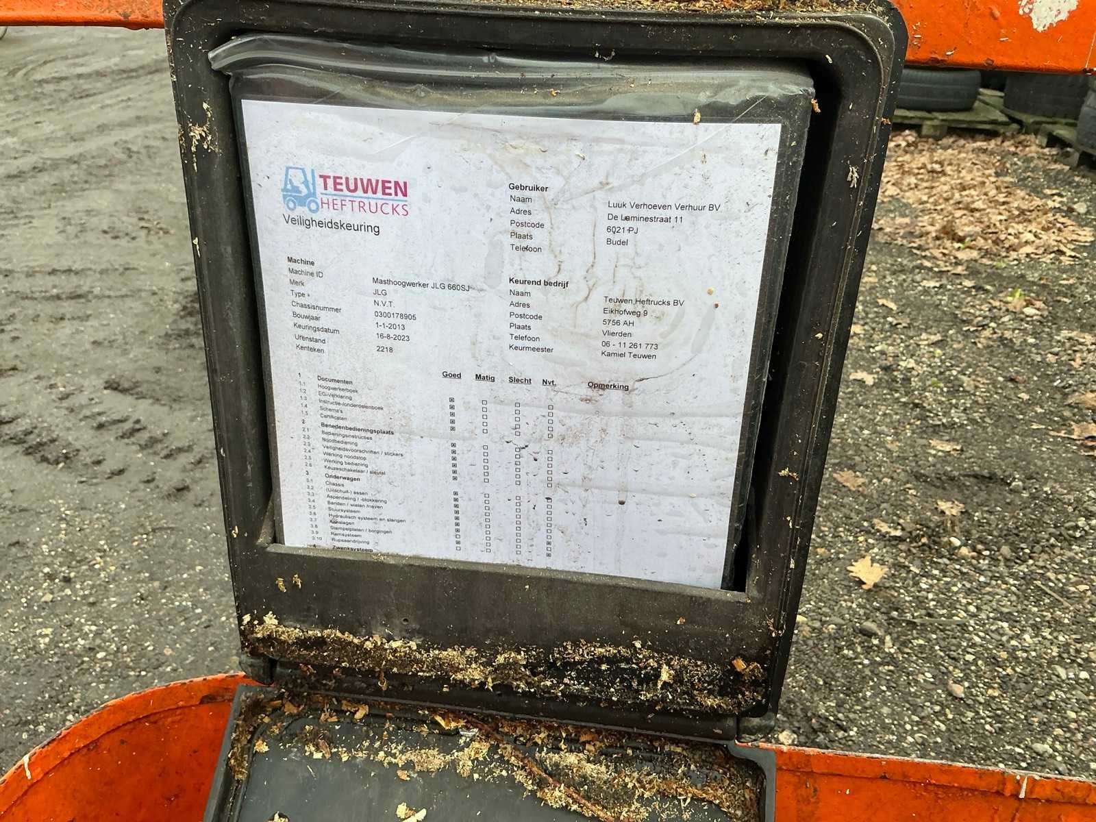 Voorzien van: 4WD, roterende opbouw, roterende werkbak, 3 delig telescopische mast, max hefhoogte 22000mm, max hefvermogen 230kg, stickers worden verwijderd bij verkoop Nee Merk: Jlg Type: 660SJ Bouwjaar: 2013 Serienummer: 0300279903 Diesel: true Motorvermogen (kW): 48kW Telescoop hoogwerker: true Werkhoogte: 22310mm Horizontale rijkwijdte: 17300mm Plateau afm. l: 900mm Plateau afm. b: 1830mm Platform capaciteit: 230kg Eigen gewicht: 12720kg Totale afmeting L: 10880mm Totale afmeting Breedte: 2500mm Totale afmeting Hoogte: 2600mm