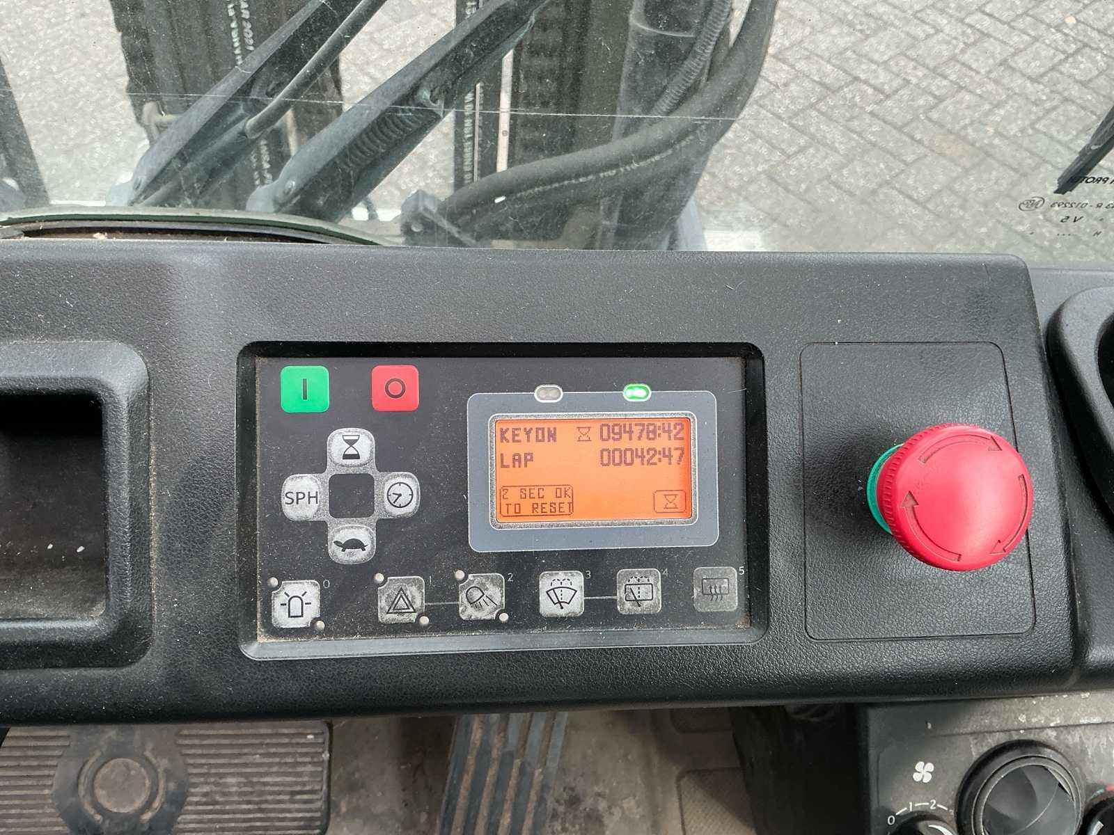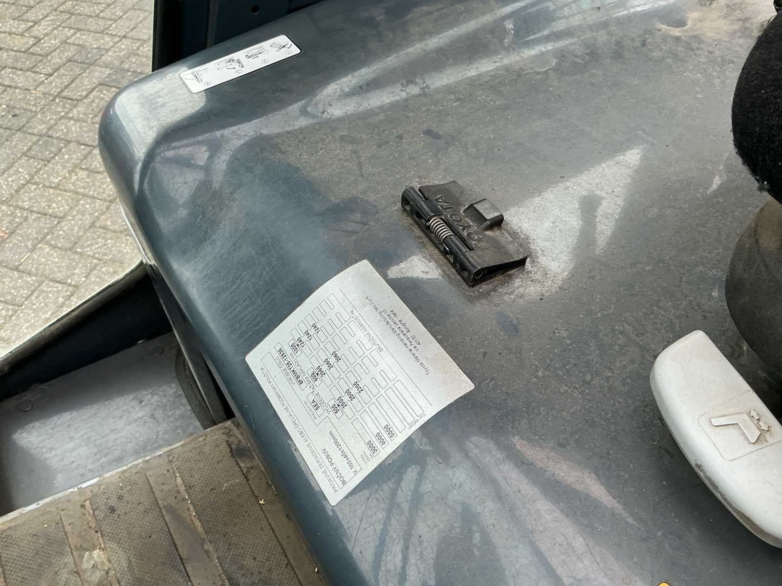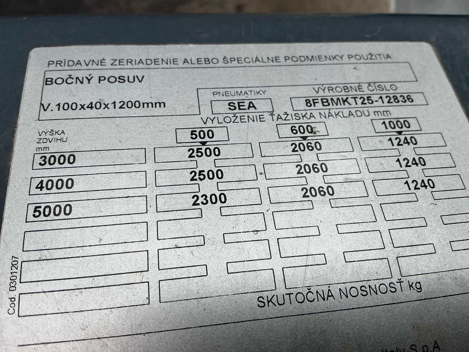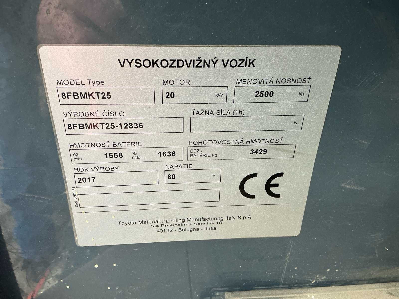 Voorzien van: Grammer mechanisch geveerde stoel, mini-lever bediening op armleuning, verwarmde achterruit, verwarming, schuiframen, opklapbare achterruit, vol rubber non-marking banden, Cascade vorkenbord, hydraulisch verstelbare lepels, Max. 1700mm h.o.h. Lepels, side-shift,trekhaak, verlichting, voltage 80V, tractiemotor 20kW, hijsmotor 25.5kW, No Merk: Toyota Type: 8FBMKT25 Bouwjaar: 2017 Serienummer: 8FBMKT25-12836 Brandstof: Elektrisch Mast: Triplex Soort band: Volrubber Aantal wielen: 4 Afgelezen urenstand: 9478 Side-shift: true Hydraulisch verstelbare lepels: true Triple mast: true Eigen gewicht: 5500kg Hefvermogen: 2500kg Lepellengte: 1200mm Vol rubber banden: true Minimale doorrijhoogte: 1450mm Totale afmeting L: 3700mm Totale afmeting Breedte: 1200mm Totale afmeting Hoogte: 2450mm