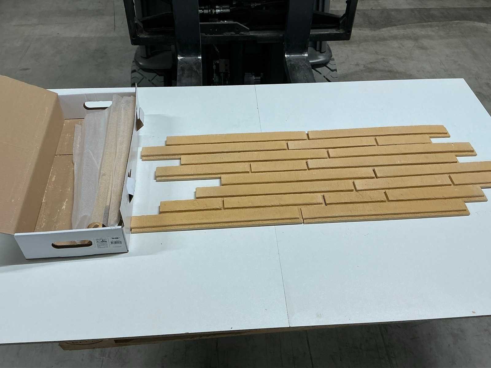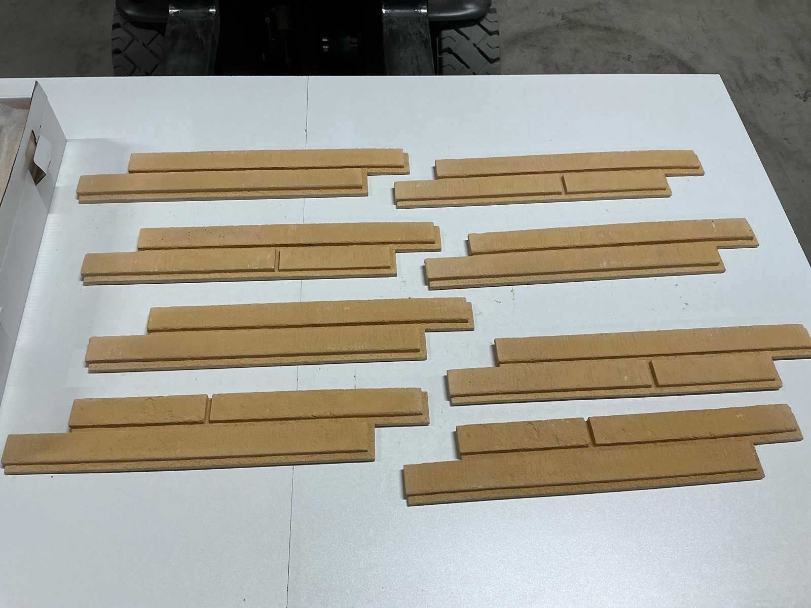Bestaat uit: 2 pallets, 10110352 Long Brick Sahara Creme, inhoud: 0,58m2/12_Stk/VE, afmeting: 570x140x30/20 mm. LET OP: Z-vormig Geadviseerde lijm: KlimexUnicol ( Interieur 2-3 kg/m2, Exterieur (floating-buttering) 4 kg /m2 ), fire-Class : A1. Nee Merk: Klimex Kleur: Créme Lengte: 57cm Breedte: 14cm Dikte: 20-30mm Materiaal: Gips Model: Long Brick Sahara Aantal m² per verpakking: 0,58m² Aantal pakken: 130 Totaal oppervlakte: 75m² Totaal gewicht: 1100kg