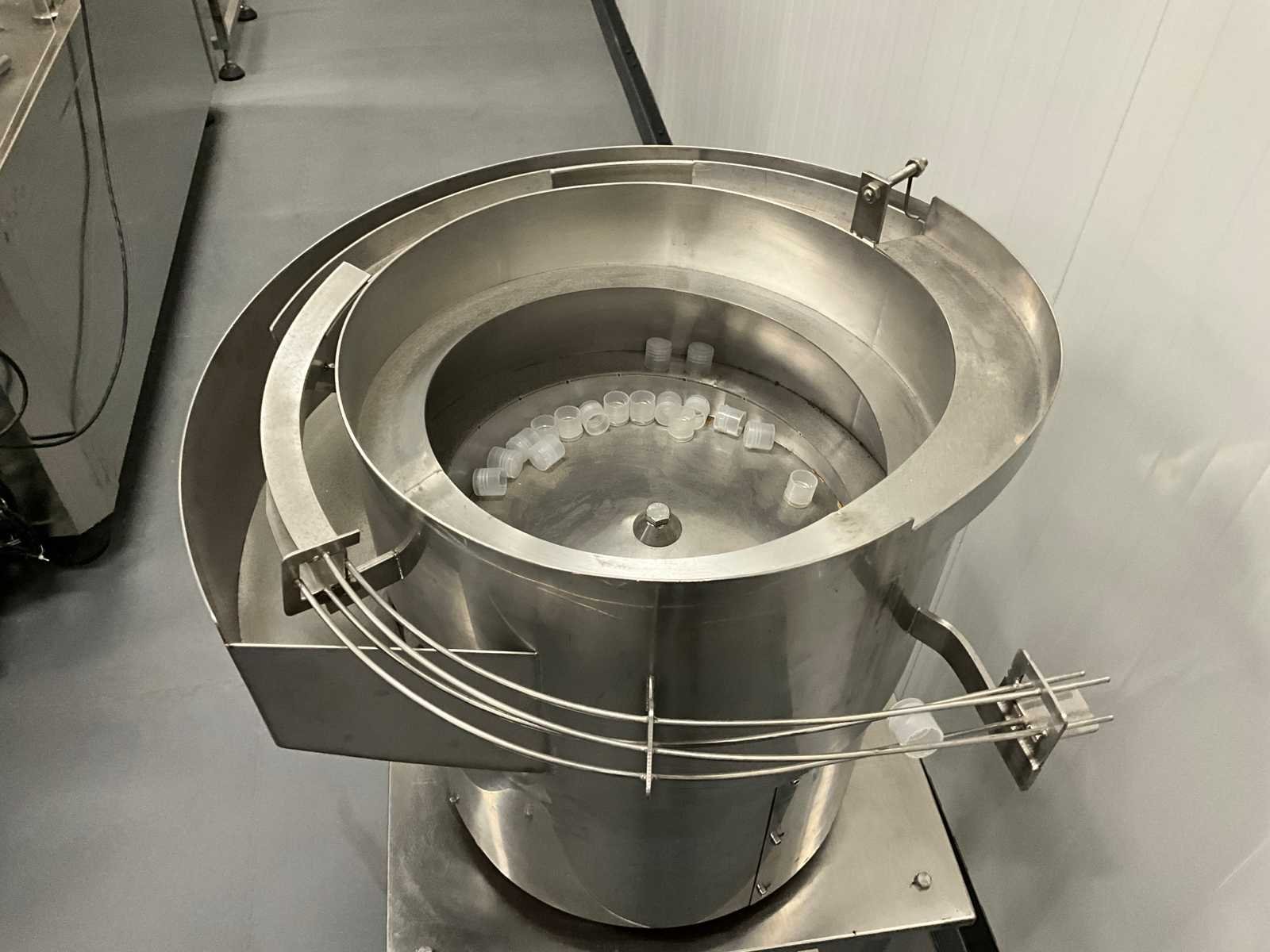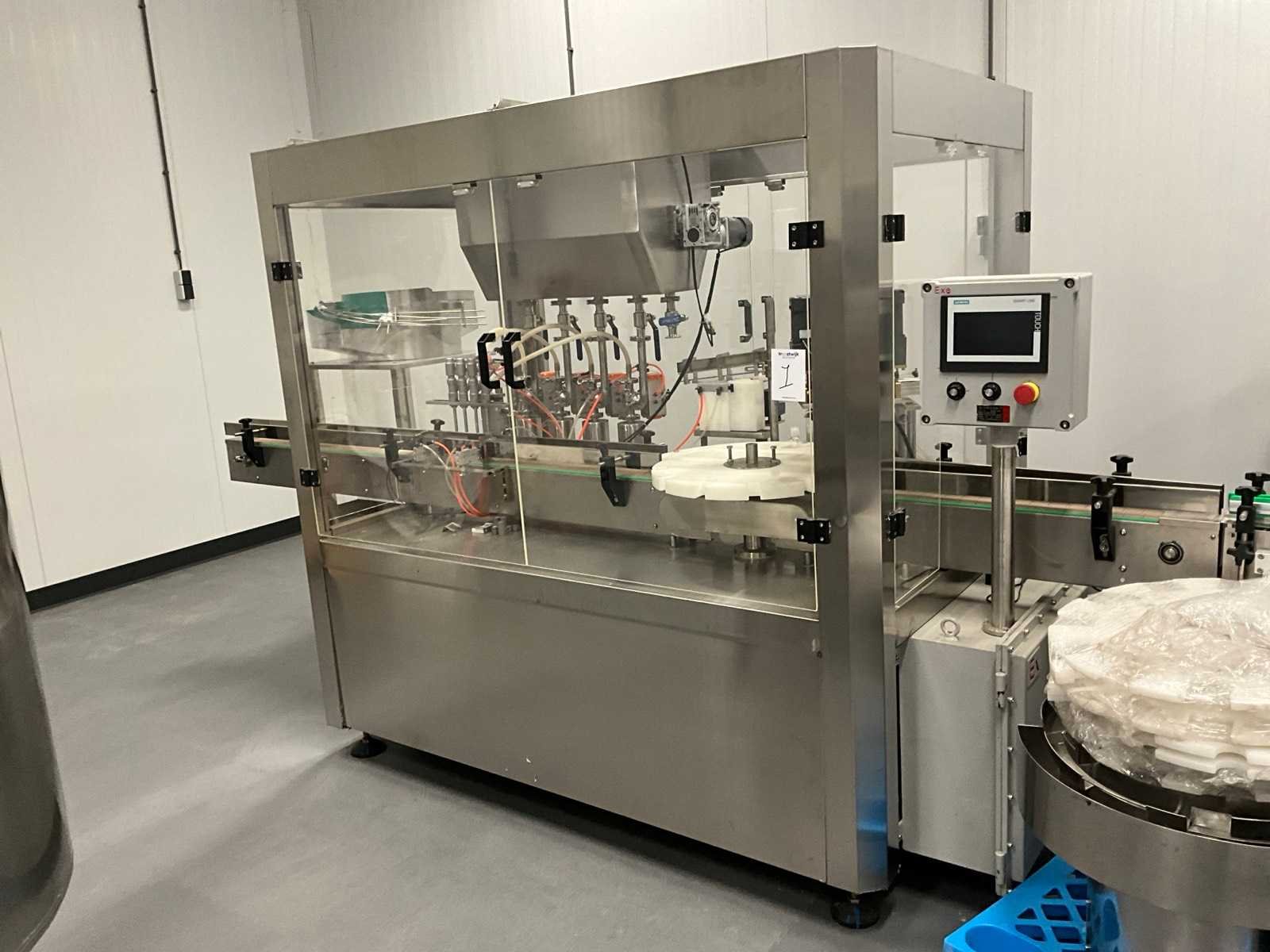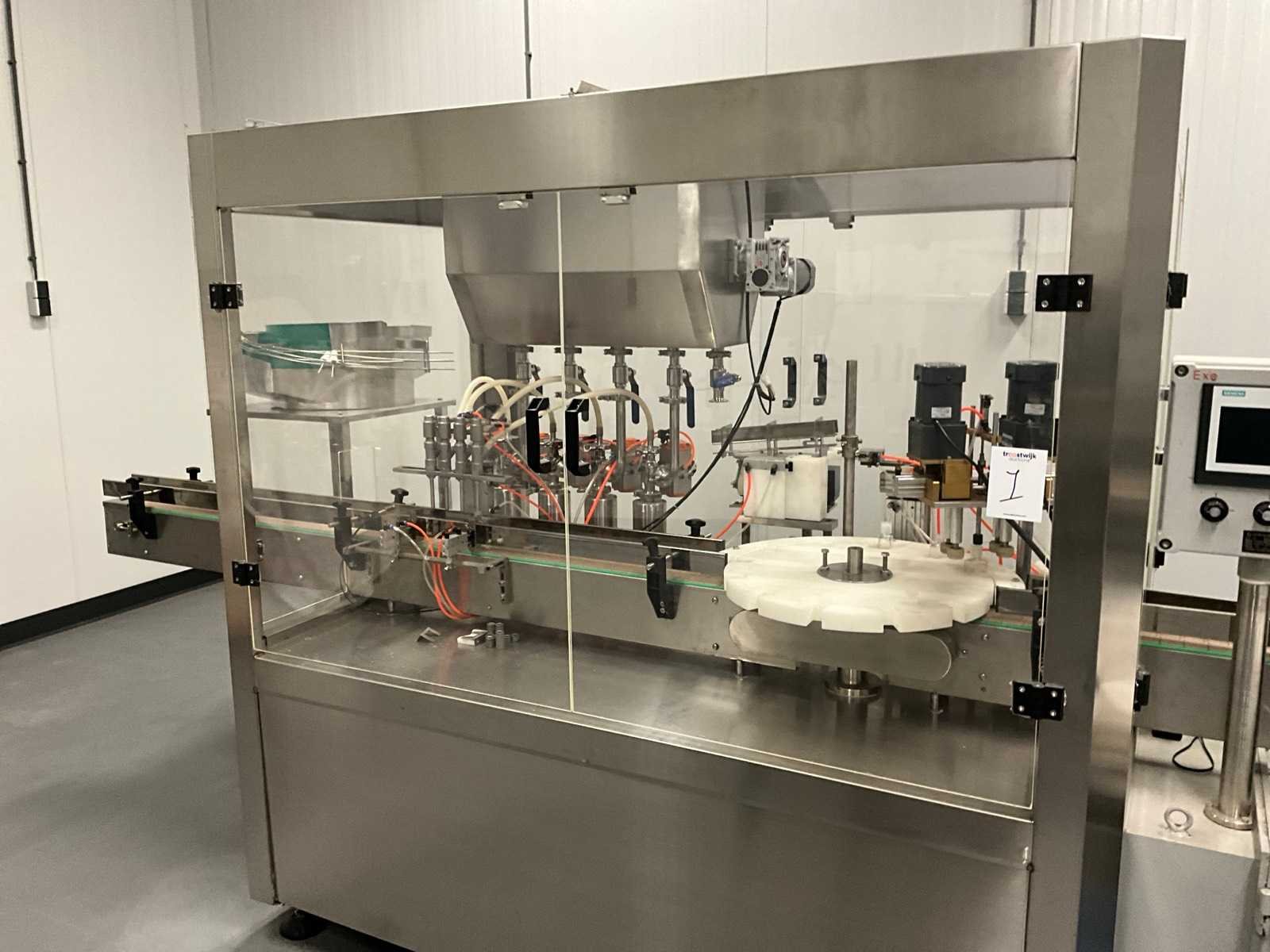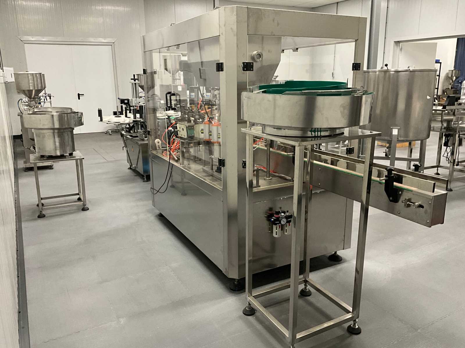 Voorzien van doppen invoer (infeed), Automatische 4-kops piston afvulmachine, Doorlopende schakel transportband, carrousel Sluit-/positioneerstation, Uitvoertransportband, Volledige veiligheidsomkasting (plexiglas), PLC-besturing + HMI (Siemens / Weintek), RVS behuizing, Automatische etiketteermachine, rolbreedte verstelling, inclusief diverse spare parts, carrousel delen etc Nee