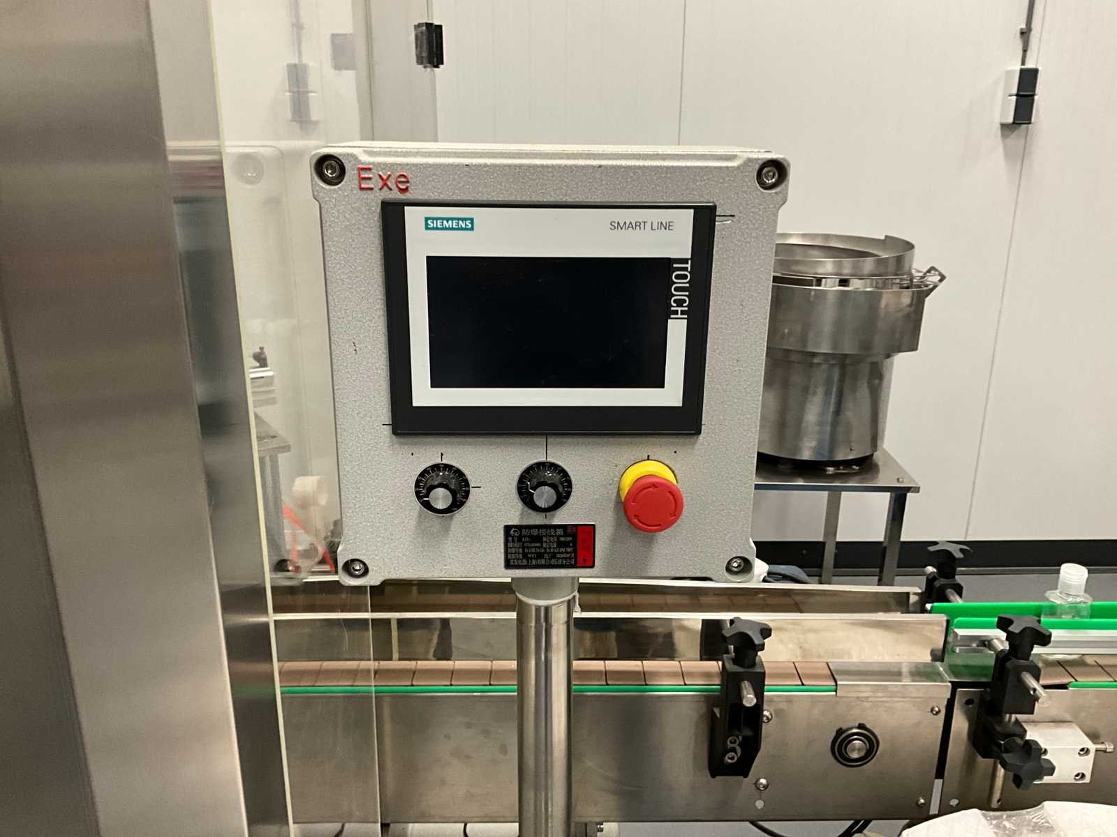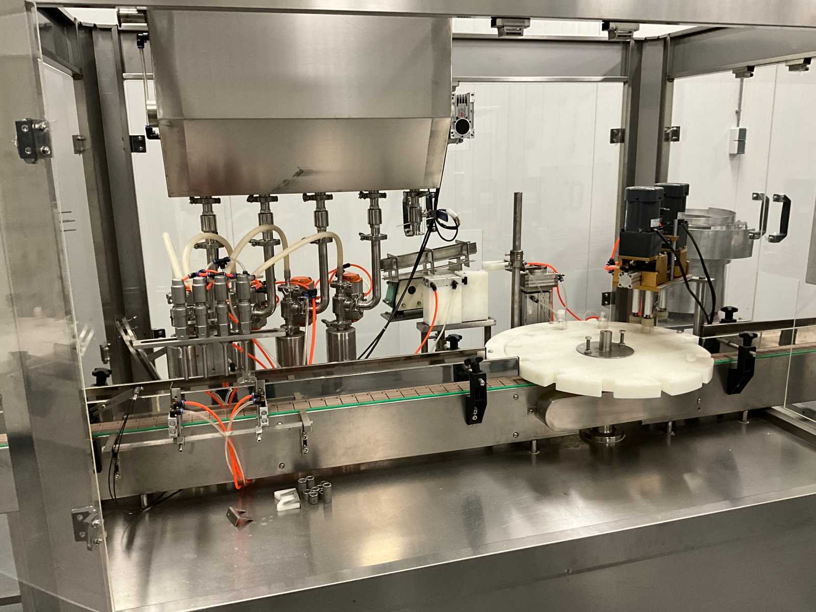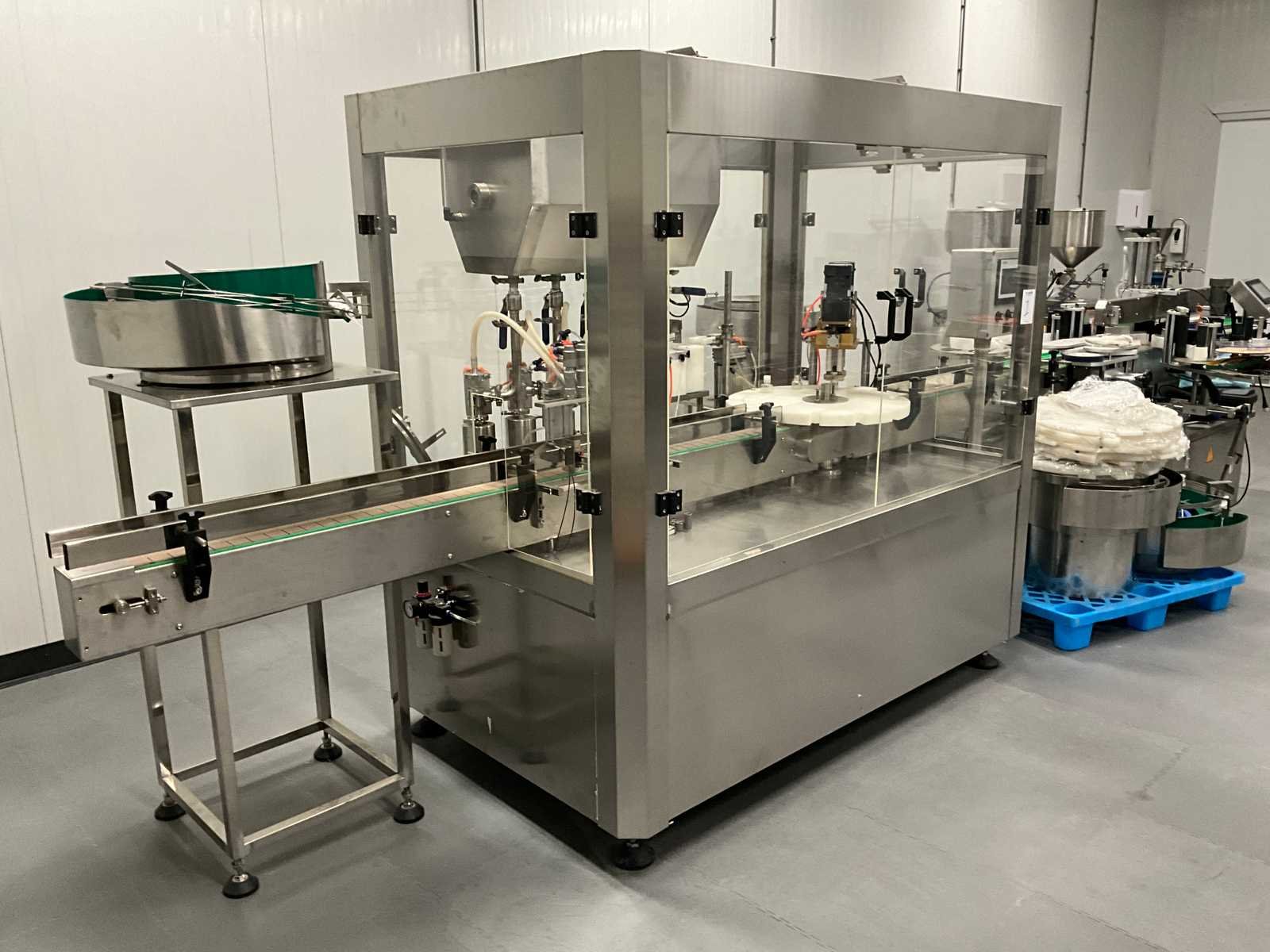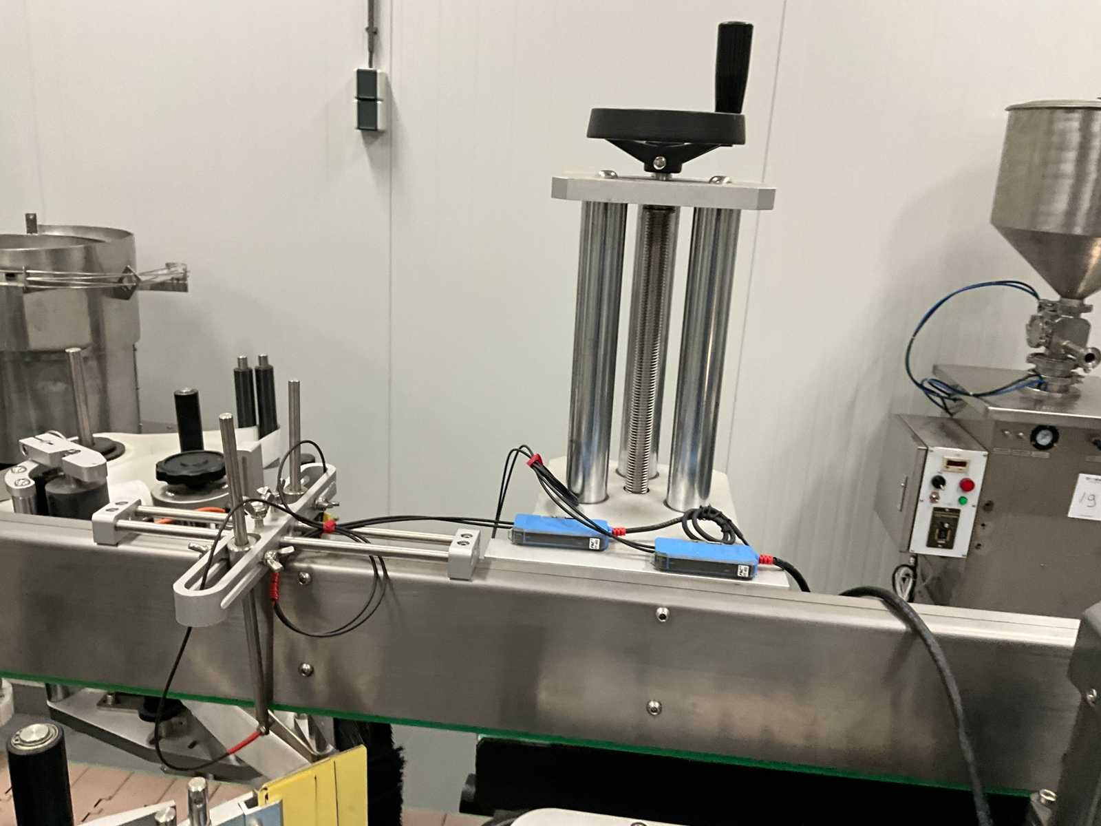 Voorzien van doppen invoer (infeed), Automatische 4-kops piston afvulmachine, Doorlopende schakel transportband, carrousel Sluit-/positioneerstation, Uitvoertransportband, Volledige veiligheidsomkasting (plexiglas), PLC-besturing + HMI (Siemens / Weintek), RVS behuizing, Automatische etiketteermachine, rolbreedte verstelling, inclusief diverse spare parts, carrousel delen etc Nee