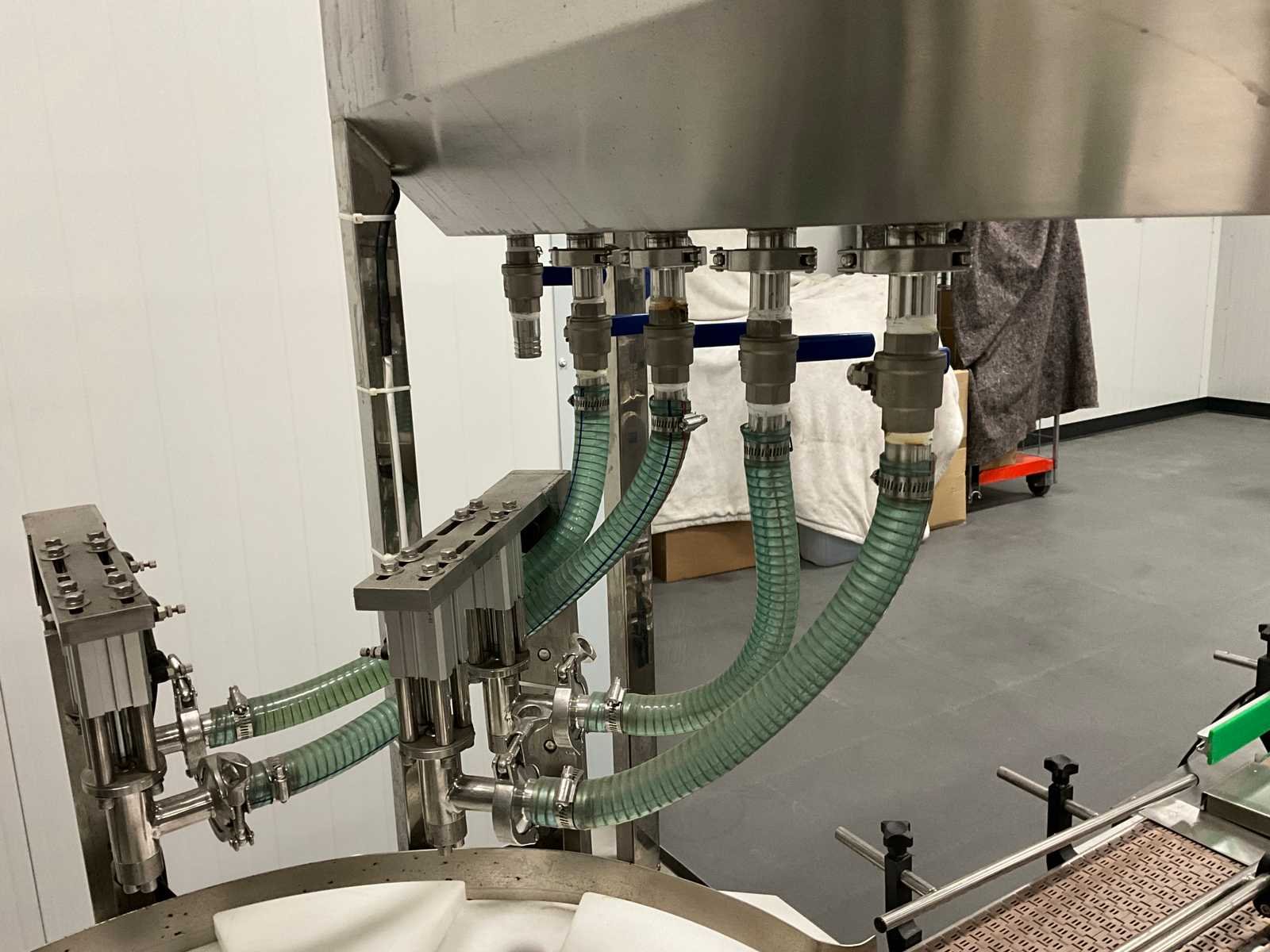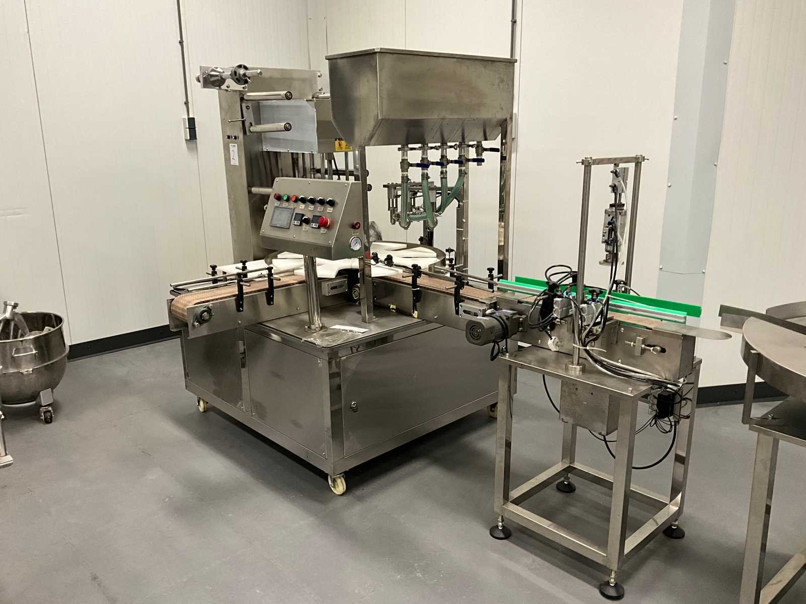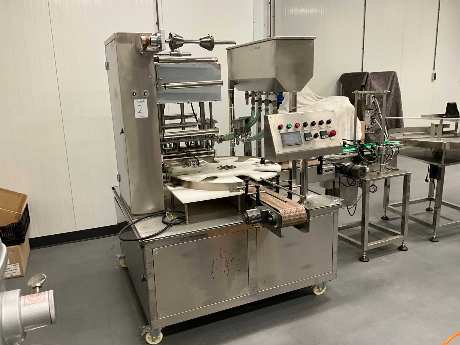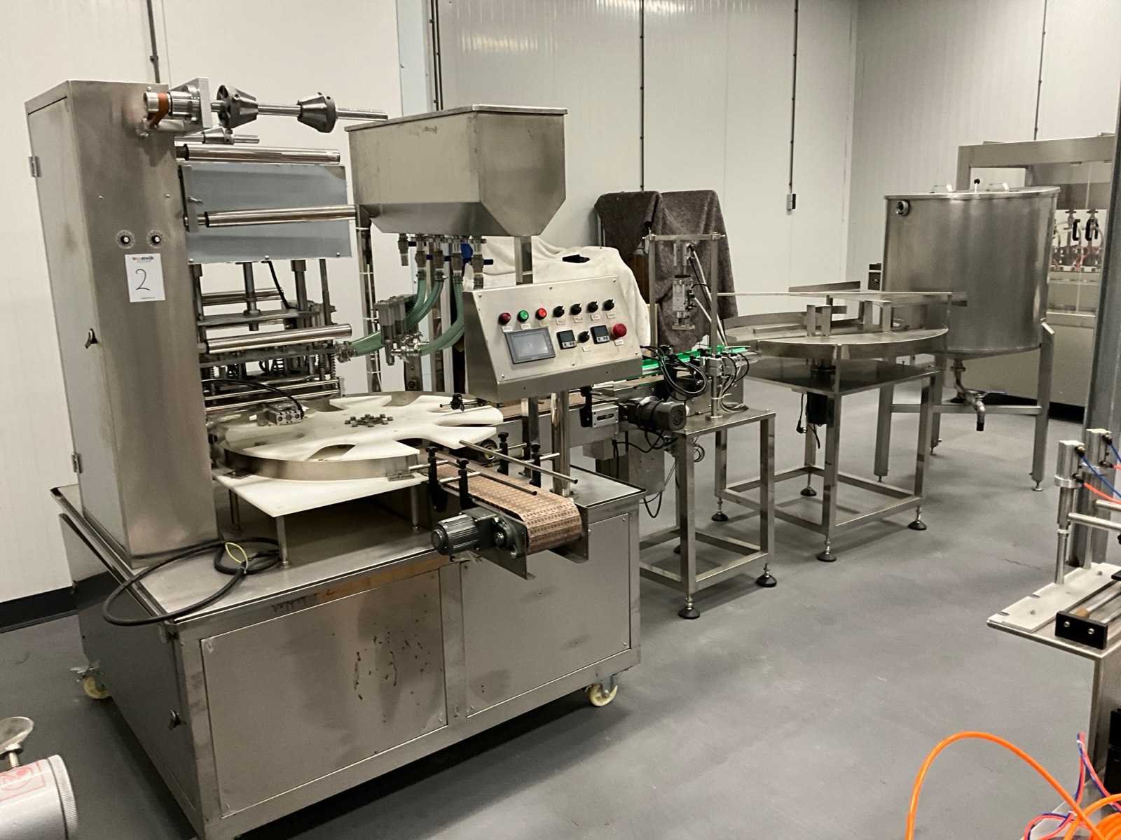 Pneumatisch en elektrisch aangestuurde lijn, bestaande uit 4 machine, 1e lijn betreft een RVS vulmachine met 8-stands kunststof sterwiel, 2x 2 koppige vulstation, seal/sluit compartiment, in- en uitvoer schakelband, Tri-clamp aansluiting, hopper met 5 uitgangen, RVS Uitgevoerde machine, 2e machine betreft een verpakking deksel sluiter, 3e machine betreft RVS accumulatie tafel, 4e machine betreft een RVS opslagtank, (hoogte circa 1600 mm), Nee Rvs: true Aantal vulstations: 2