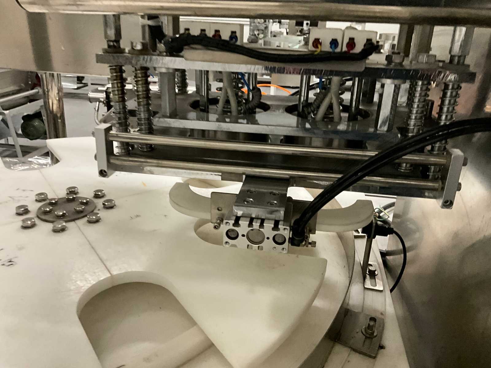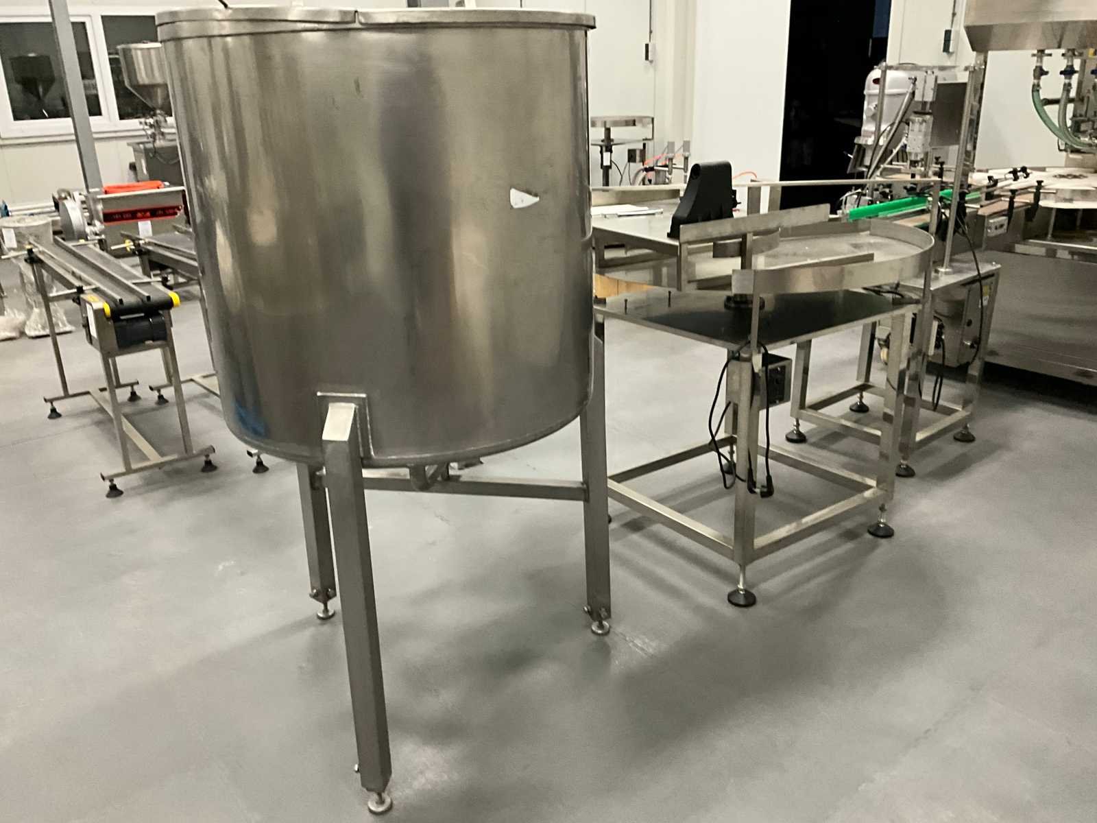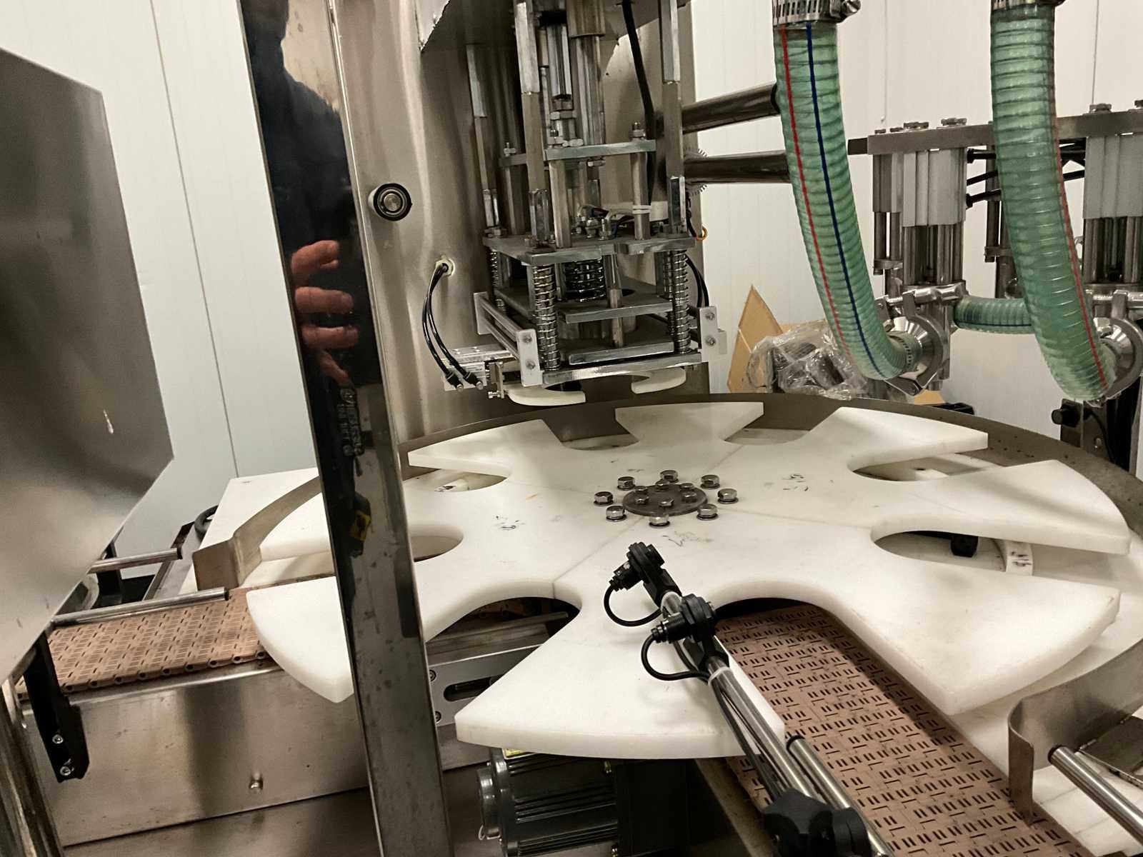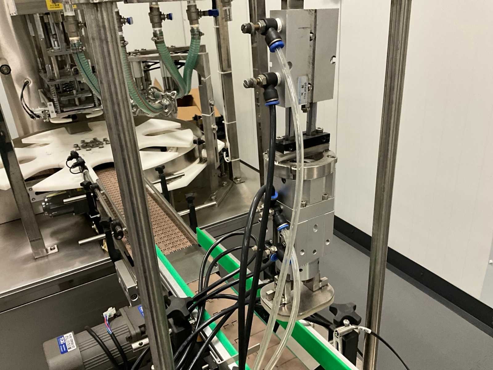 Pneumatisch en elektrisch aangestuurde lijn, bestaande uit 4 machine, 1e lijn betreft een RVS vulmachine met 8-stands kunststof sterwiel, 2x 2 koppige vulstation, seal/sluit compartiment, in- en uitvoer schakelband, Tri-clamp aansluiting, hopper met 5 uitgangen, RVS Uitgevoerde machine, 2e machine betreft een verpakking deksel sluiter, 3e machine betreft RVS accumulatie tafel, 4e machine betreft een RVS opslagtank, (hoogte circa 1600 mm), Nee Rvs: true Aantal vulstations: 2