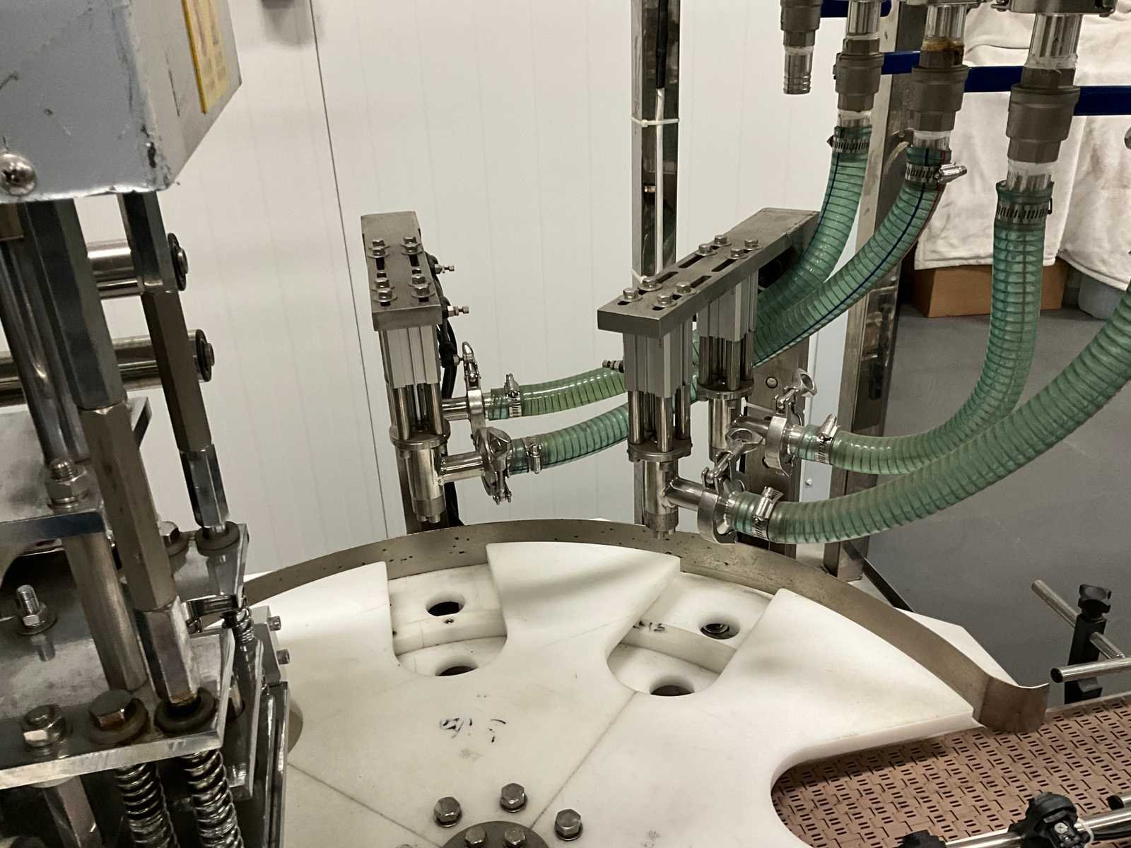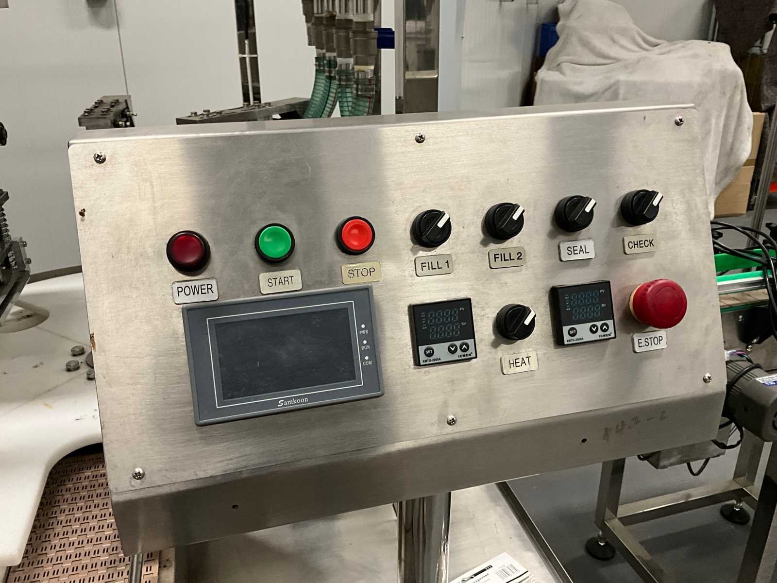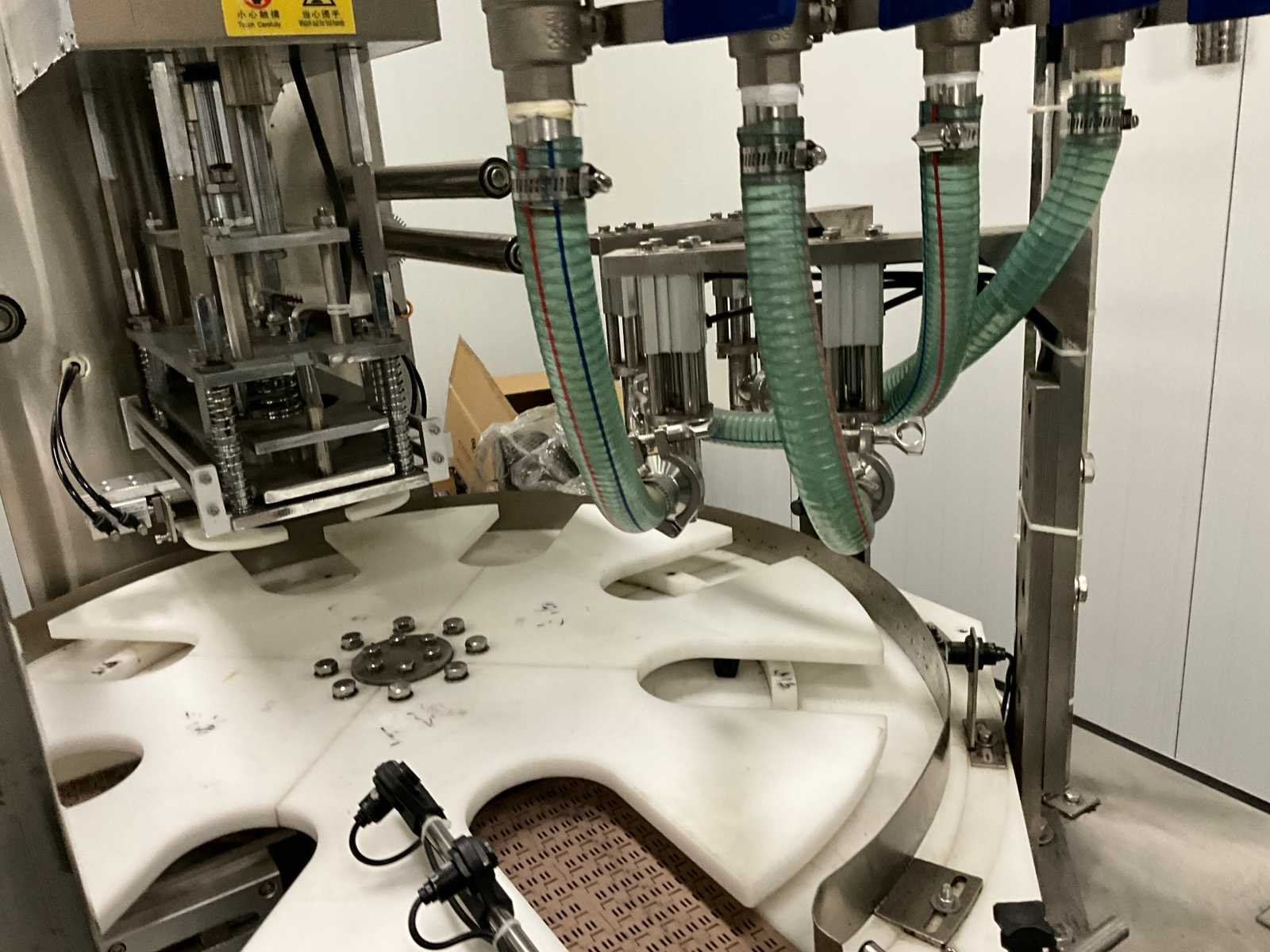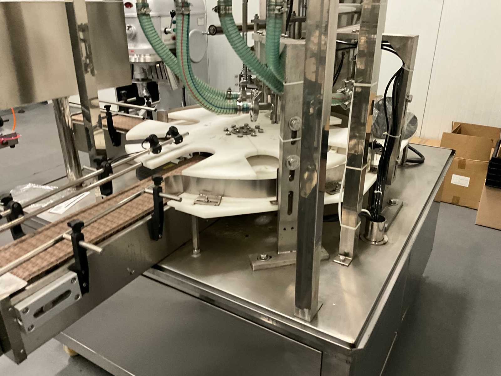 Pneumatisch en elektrisch aangestuurde lijn, bestaande uit 4 machine, 1e lijn betreft een RVS vulmachine met 8-stands kunststof sterwiel, 2x 2 koppige vulstation, seal/sluit compartiment, in- en uitvoer schakelband, Tri-clamp aansluiting, hopper met 5 uitgangen, RVS Uitgevoerde machine, 2e machine betreft een verpakking deksel sluiter, 3e machine betreft RVS accumulatie tafel, 4e machine betreft een RVS opslagtank, (hoogte circa 1600 mm), Nee Rvs: true Aantal vulstations: 2