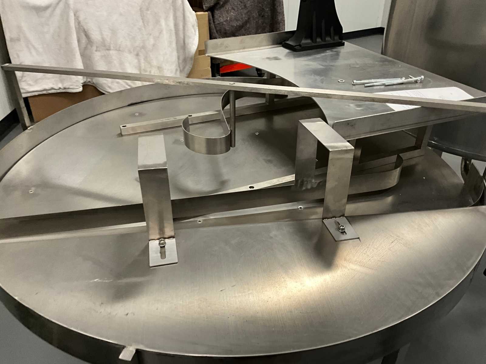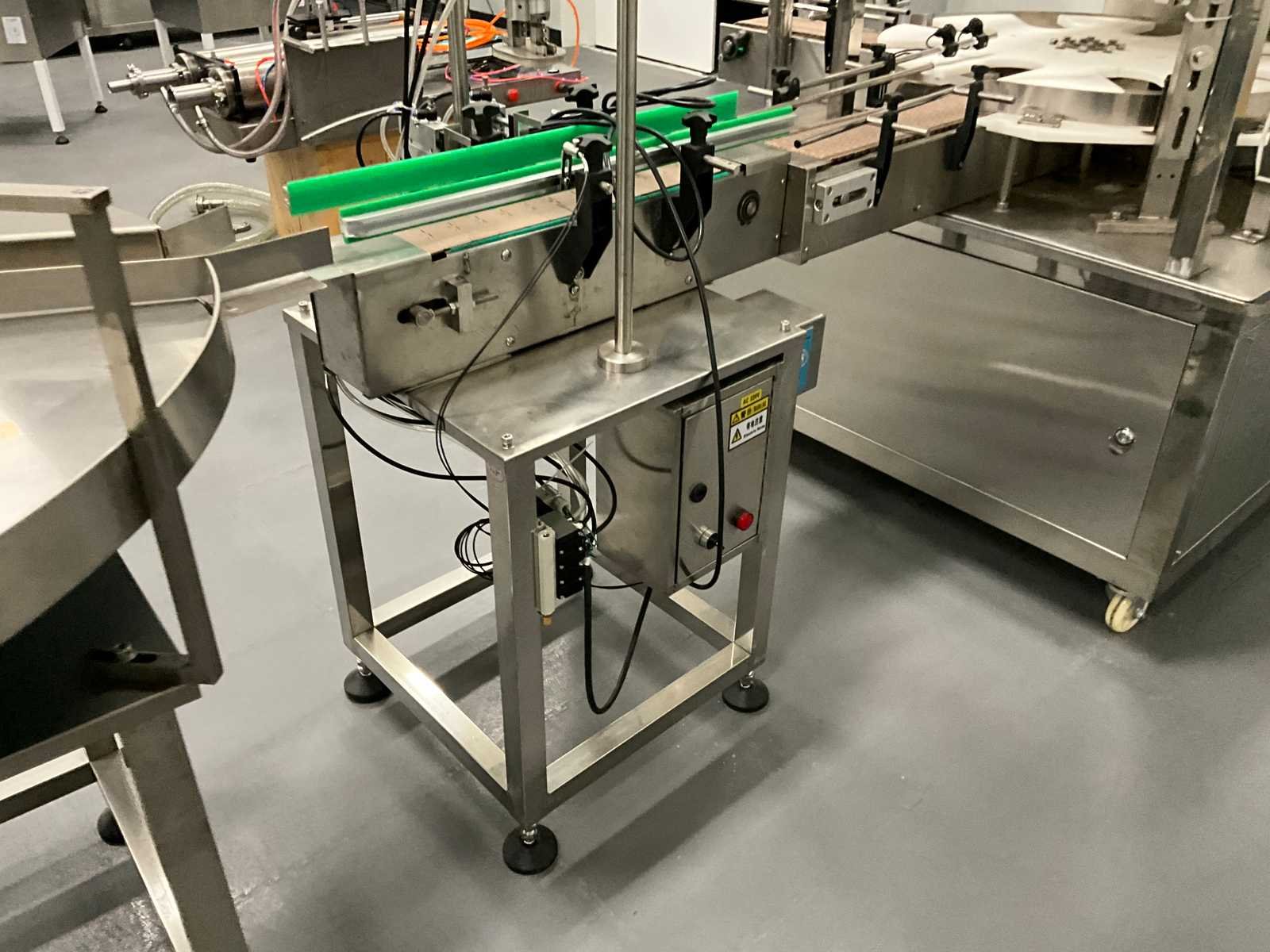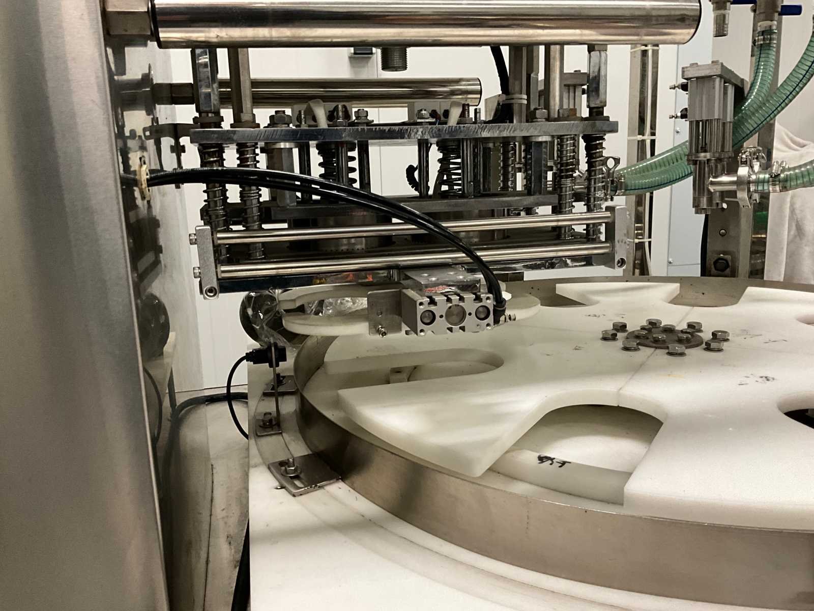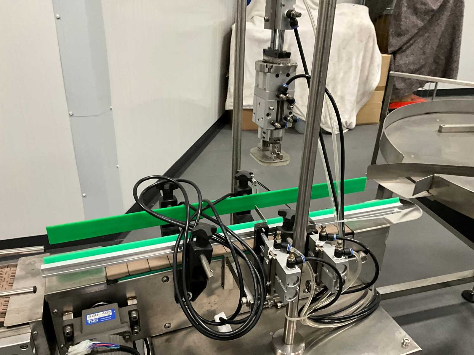 Pneumatisch en elektrisch aangestuurde lijn, bestaande uit 4 machine, 1e lijn betreft een RVS vulmachine met 8-stands kunststof sterwiel, 2x 2 koppige vulstation, seal/sluit compartiment, in- en uitvoer schakelband, Tri-clamp aansluiting, hopper met 5 uitgangen, RVS Uitgevoerde machine, 2e machine betreft een verpakking deksel sluiter, 3e machine betreft RVS accumulatie tafel, 4e machine betreft een RVS opslagtank, (hoogte circa 1600 mm), Nee Rvs: true Aantal vulstations: 2