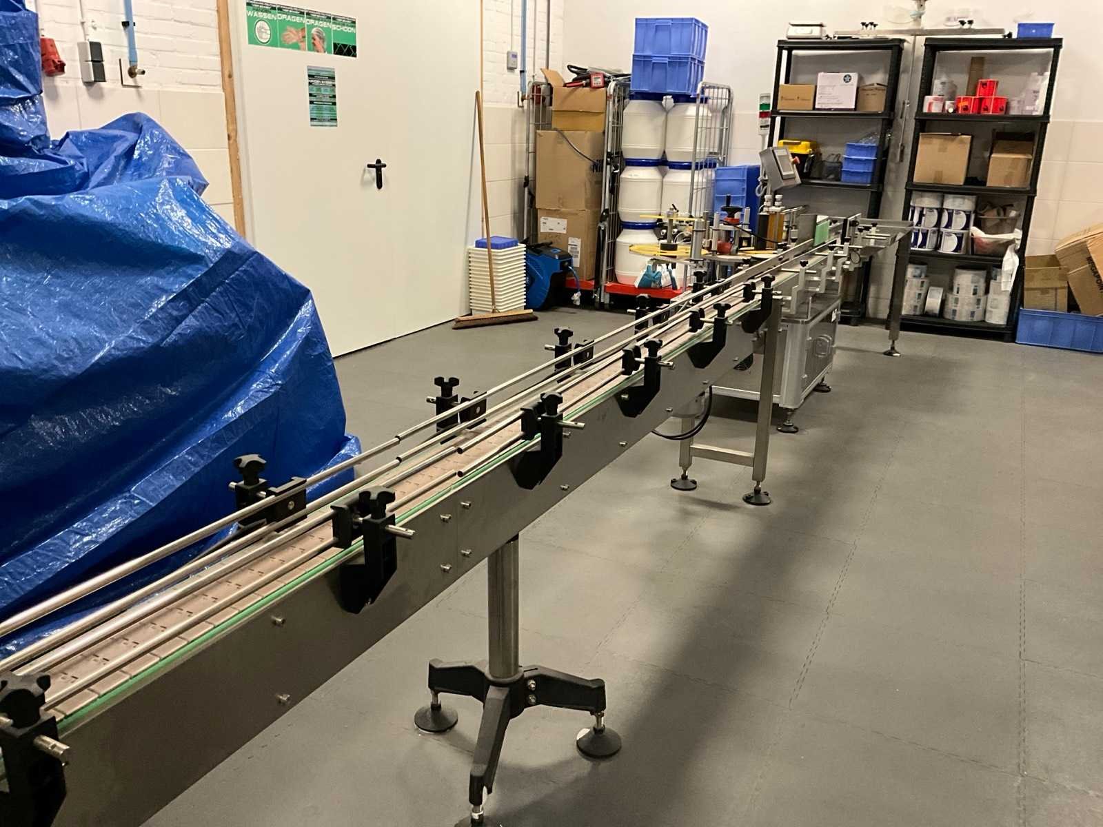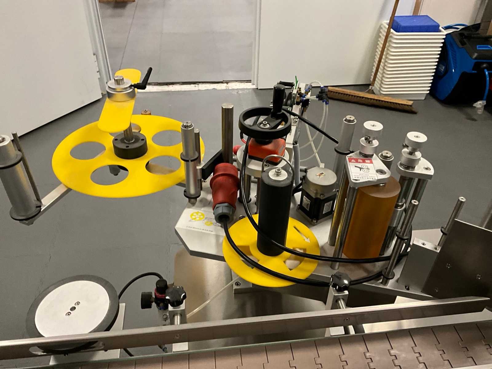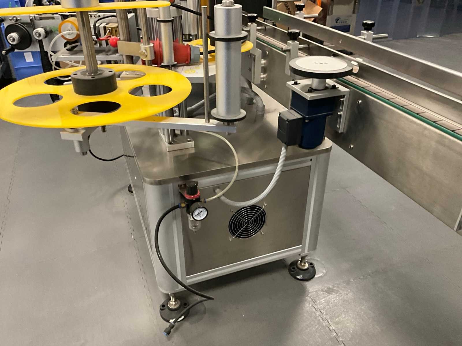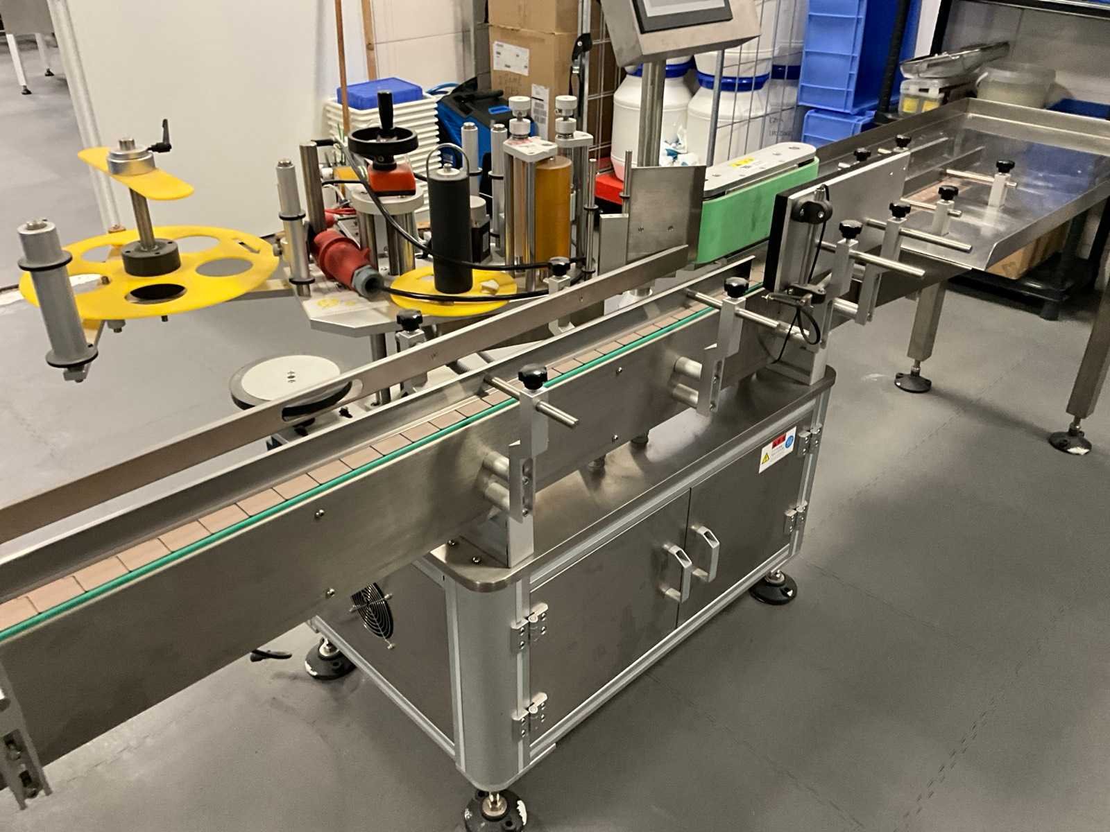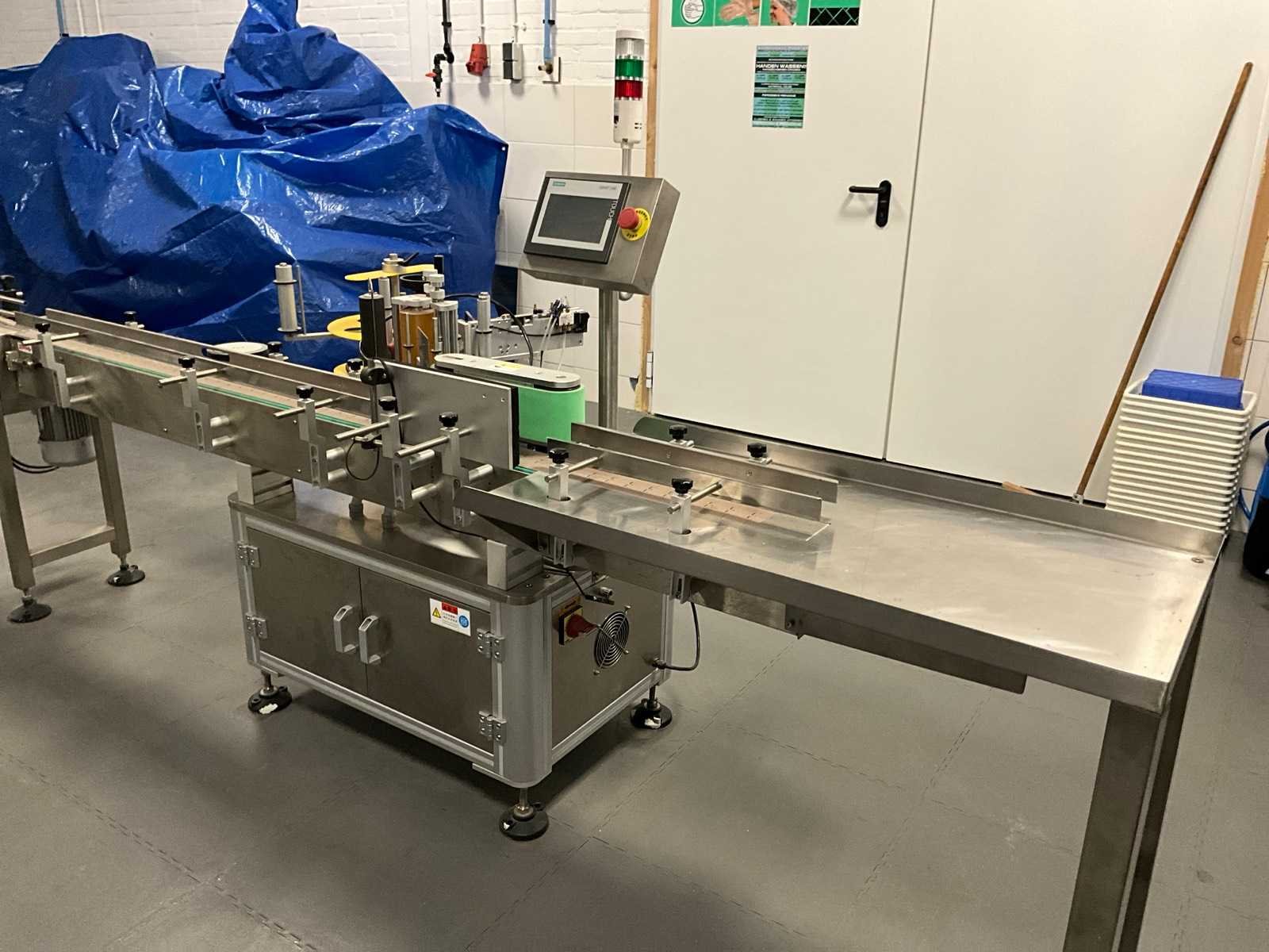 Pneumatisch en elektrisch gestuurde machine, voorzien van 2x pompunit met vulkop, 2 pneumatische doseerkleppen, voorraad tank, pneumatische afsluitbare toevoerklep, elektrisch aangedreven schakel flessen transportband, verstelbare geleiders, band lengte 4000 mm, Touchwin scherm, elektrische besturing, 400V etiketteermachine met Siemens aansturing, zij doorvoerbanden, schakelband, flessen plateau Nee Merk: MIC Aantal koppen: 2 Aansluiting: 230V Totale afmeting L: 6700mm Totale afmeting Hoogte: 2400mm