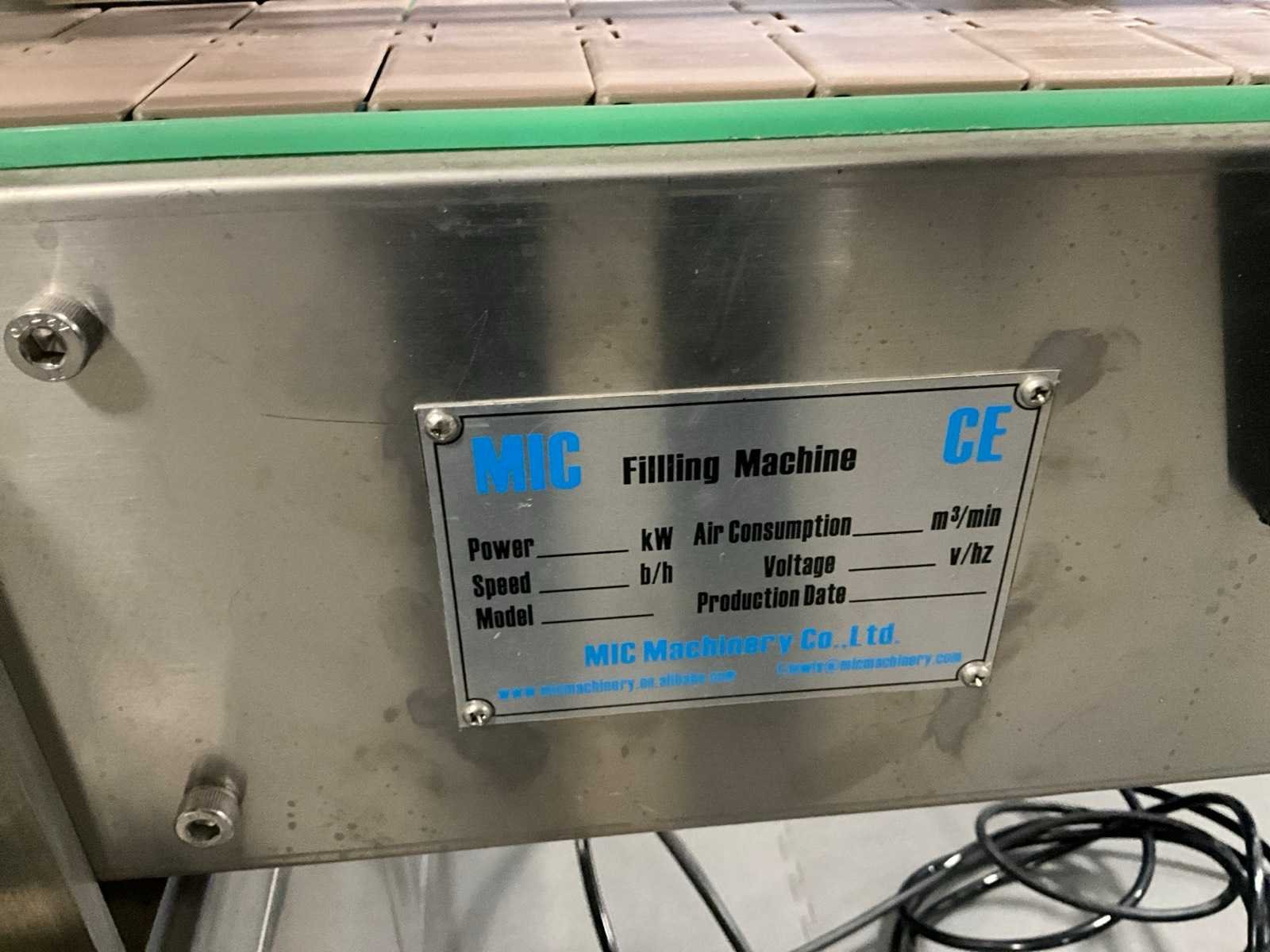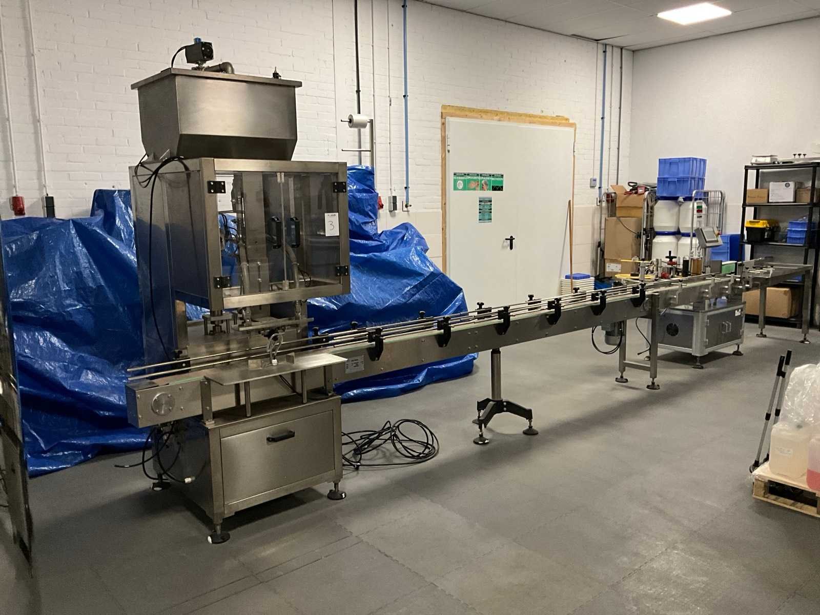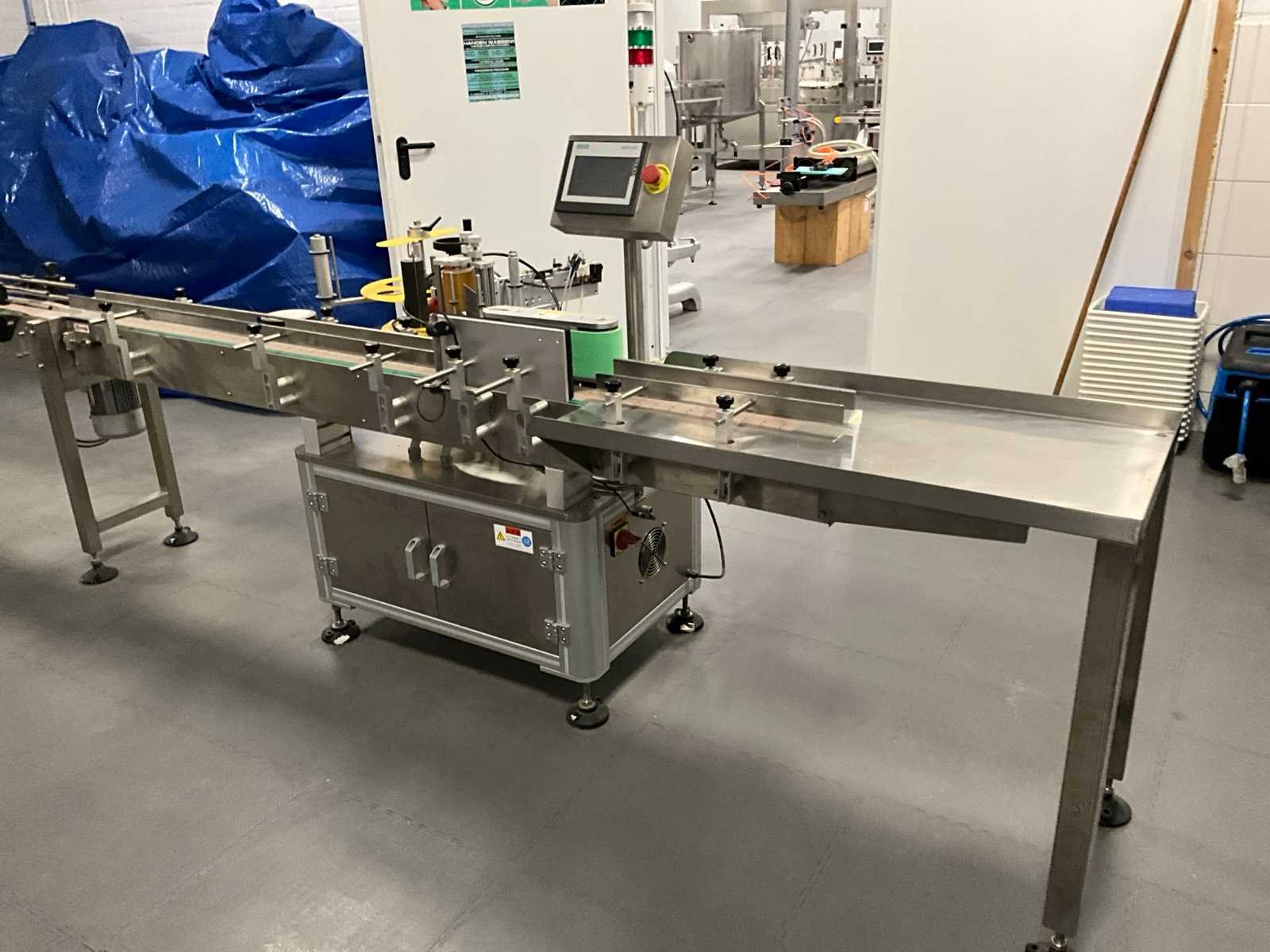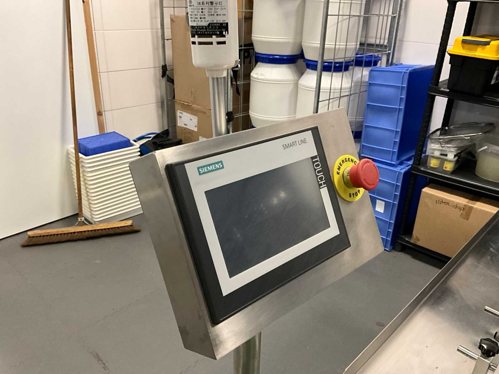 Pneumatisch en elektrisch gestuurde machine, voorzien van 2x pompunit met vulkop, 2 pneumatische doseerkleppen, voorraad tank, pneumatische afsluitbare toevoerklep, elektrisch aangedreven schakel flessen transportband, verstelbare geleiders, band lengte 4000 mm, Touchwin scherm, elektrische besturing, 400V etiketteermachine met Siemens aansturing, zij doorvoerbanden, schakelband, flessen plateau Nee Merk: MIC Aantal koppen: 2 Aansluiting: 230V Totale afmeting L: 6700mm Totale afmeting Hoogte: 2400mm