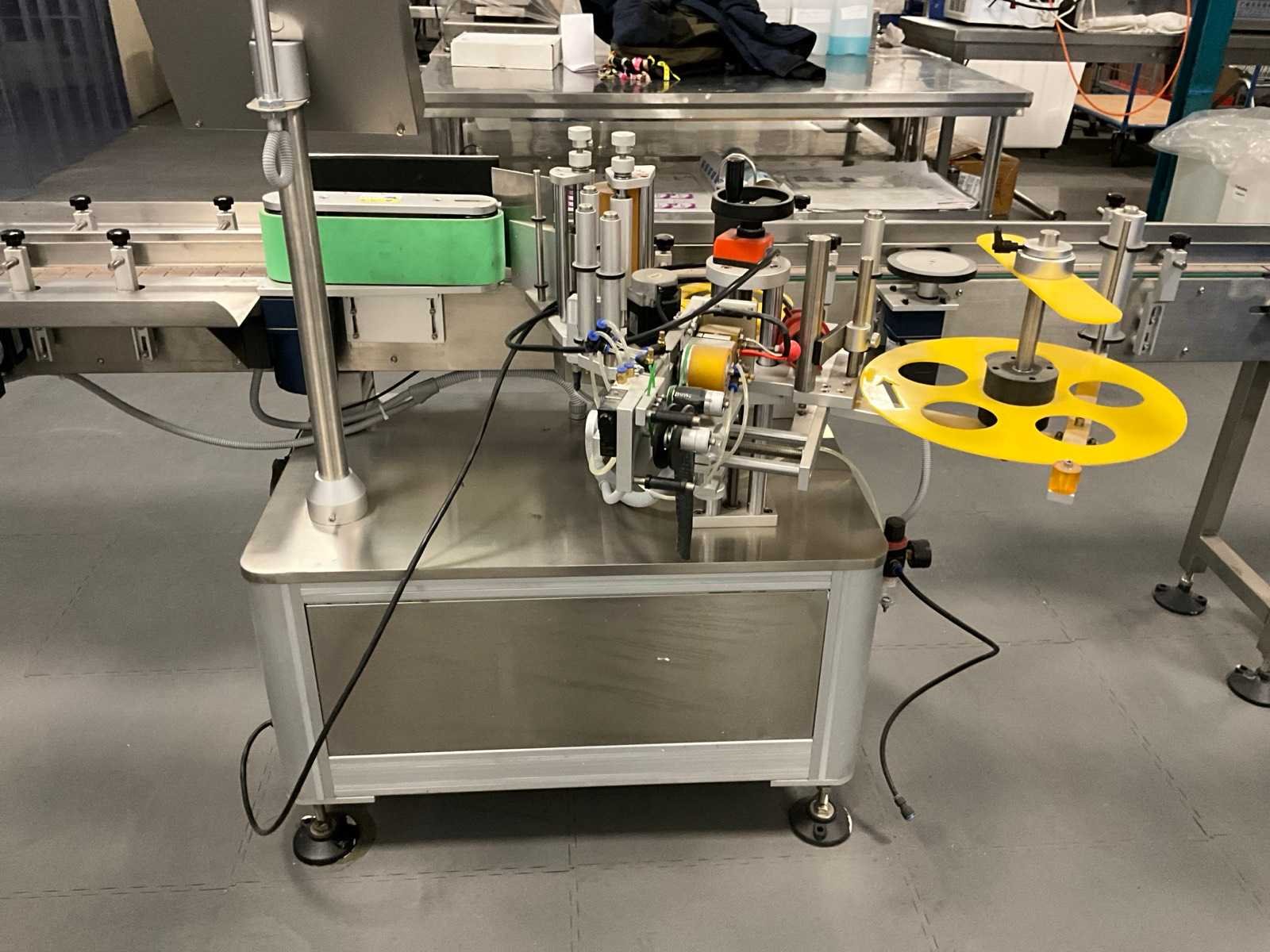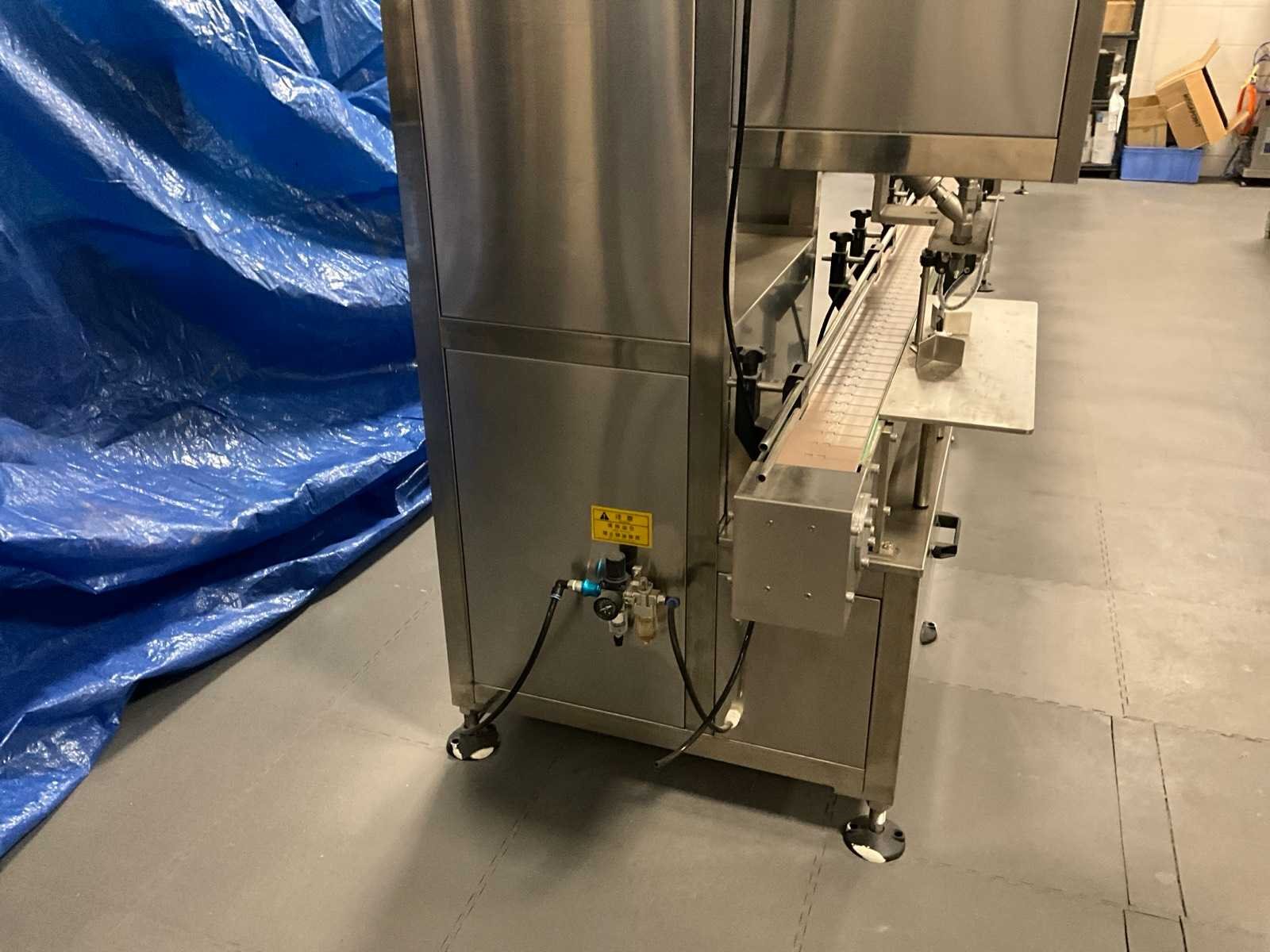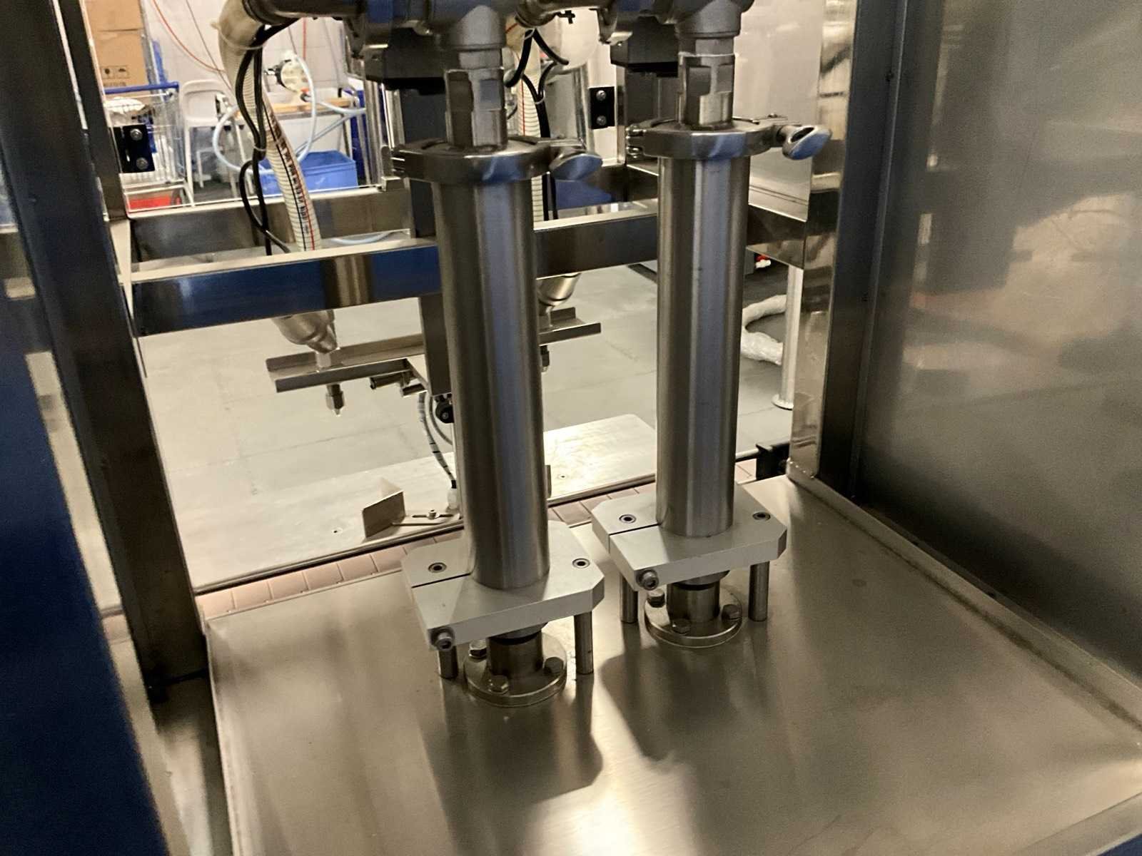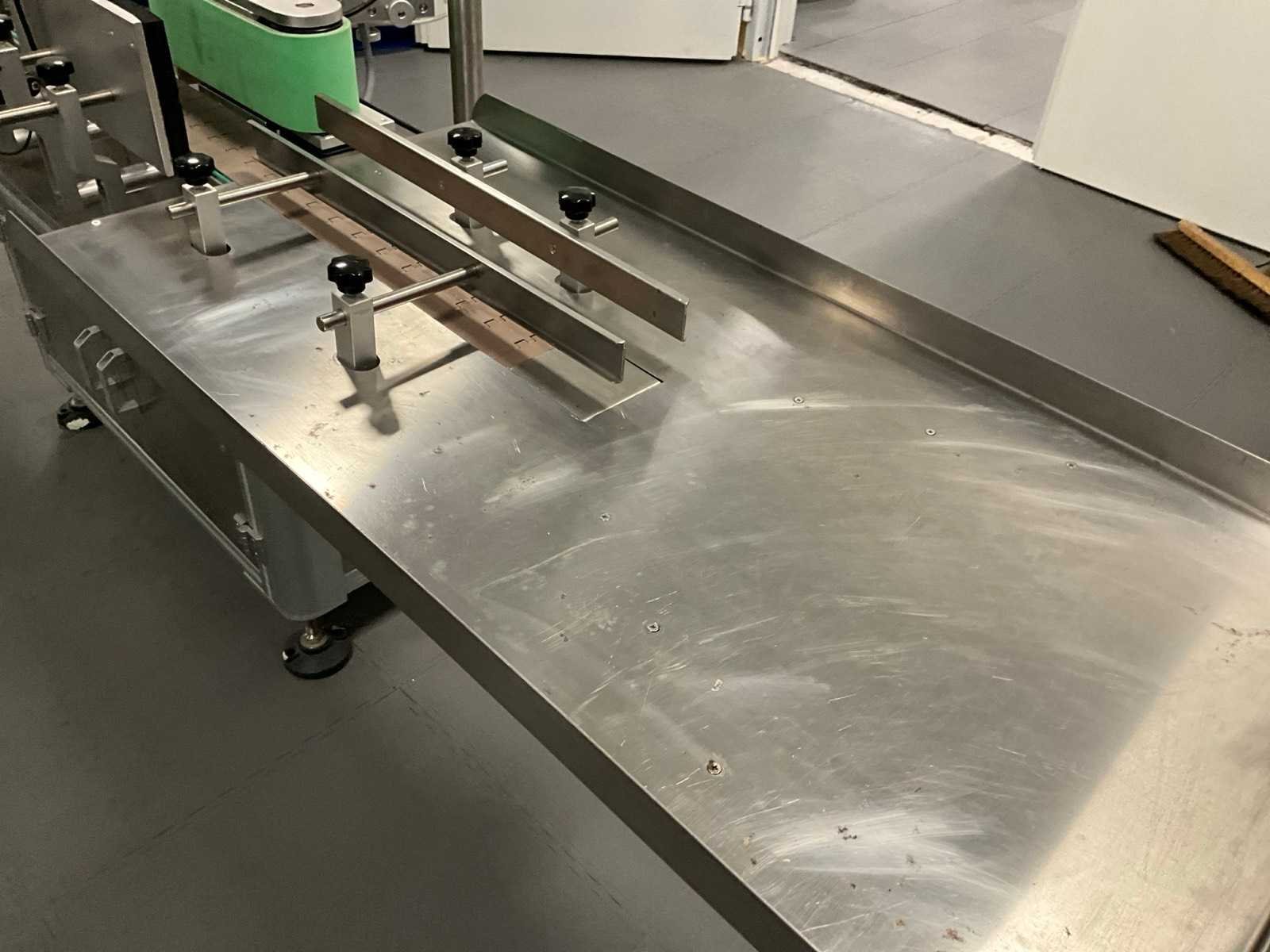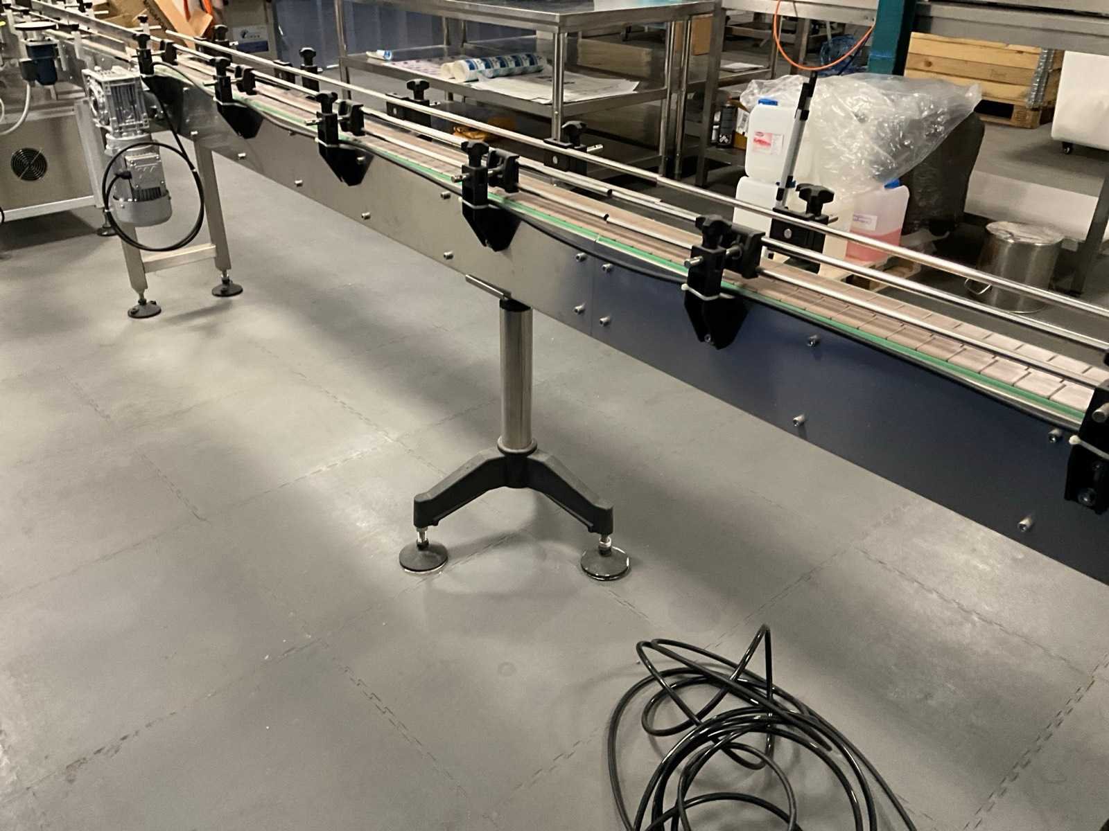 Pneumatisch en elektrisch gestuurde machine, voorzien van 2x pompunit met vulkop, 2 pneumatische doseerkleppen, voorraad tank, pneumatische afsluitbare toevoerklep, elektrisch aangedreven schakel flessen transportband, verstelbare geleiders, band lengte 4000 mm, Touchwin scherm, elektrische besturing, 400V etiketteermachine met Siemens aansturing, zij doorvoerbanden, schakelband, flessen plateau Nee Merk: MIC Aantal koppen: 2 Aansluiting: 230V Totale afmeting L: 6700mm Totale afmeting Hoogte: 2400mm