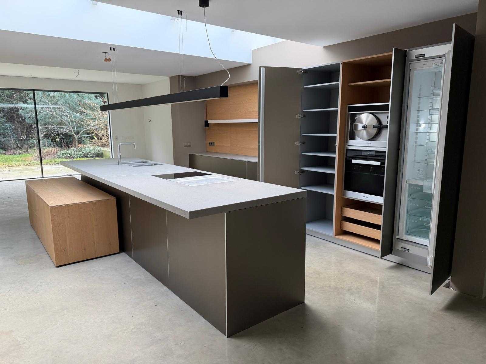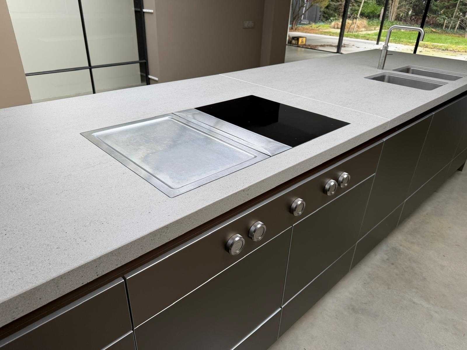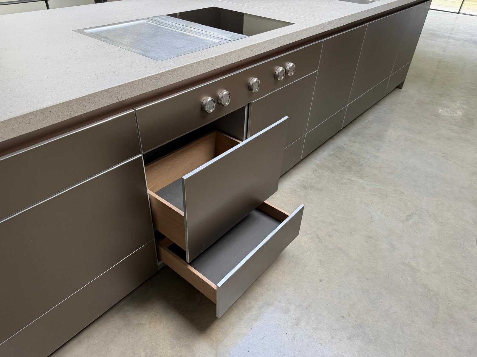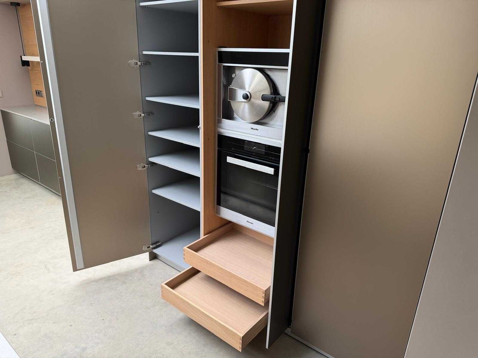Met Jansen en De Bont hanglamp; let op, blad is licht beschadig, valt na montage te repareren; reeds gedemonteerd en ingepakt op pallets. (afstapelen, omruilen of statiegeld per pallet); pallets zijn niet inbegrepen; statiegeld betalen bij afhalen, of pallets afstapelen; werkblad niet ingepakt op pallets (26-BRUCH-03515) Nee Merk: Bulthaup Model: B3 Type keukenopstelling: Eiland Lengte: 511cm Breedte: 80cm Hoogte: 208cm Aanrechtblad: Dekton Strato Magnetron: Hogedruk stoomoven Miele DGD4635CS Fornuis: Bora profesional met recirculatie Koelkast: Miele K37272iD Softclose: true Oven: Miele H6860BP Vaatwasser: Miele G6570SCVI Lengte kookeiland: 392,4cm Breedte kookeiland: 141,8cm Hoogte kookeiland: 95cm Kleur: Fronten aluminum zandbeige; hoge kasten soft touch lak cashmere; legbord matlak beige; nispanelen structuur eiken fineer; lage kast in structuur eiken fineer