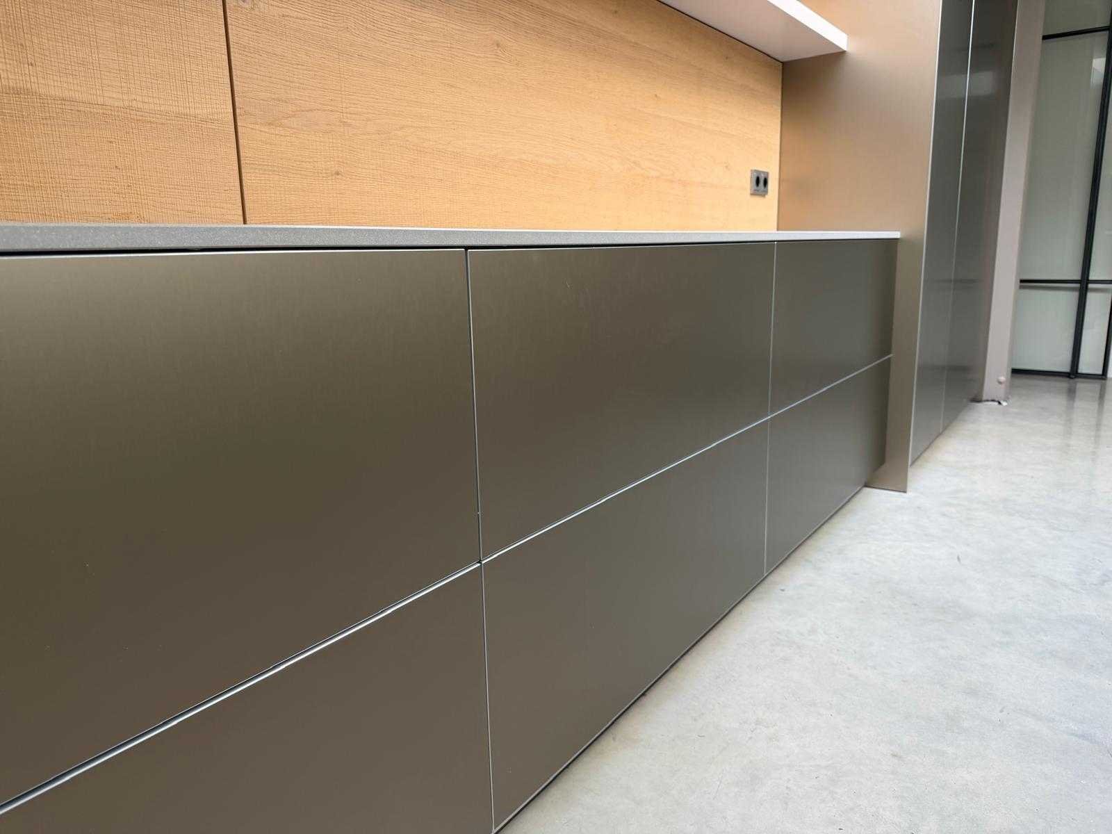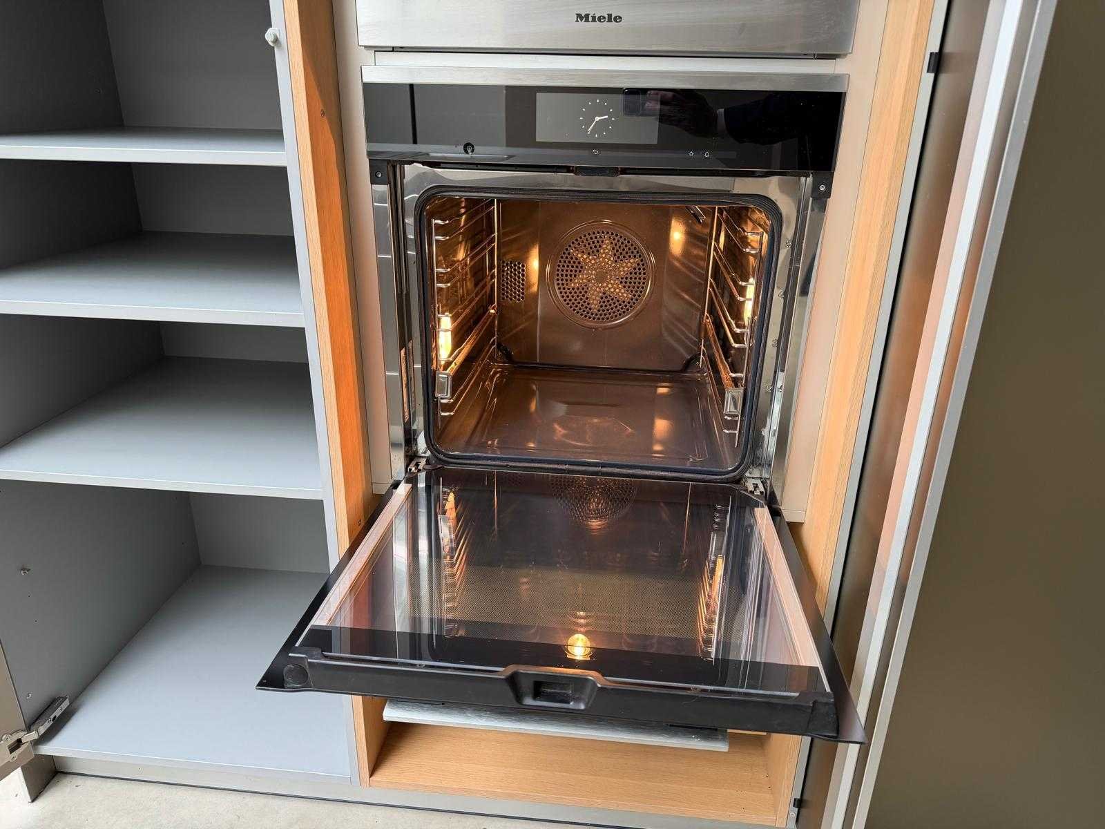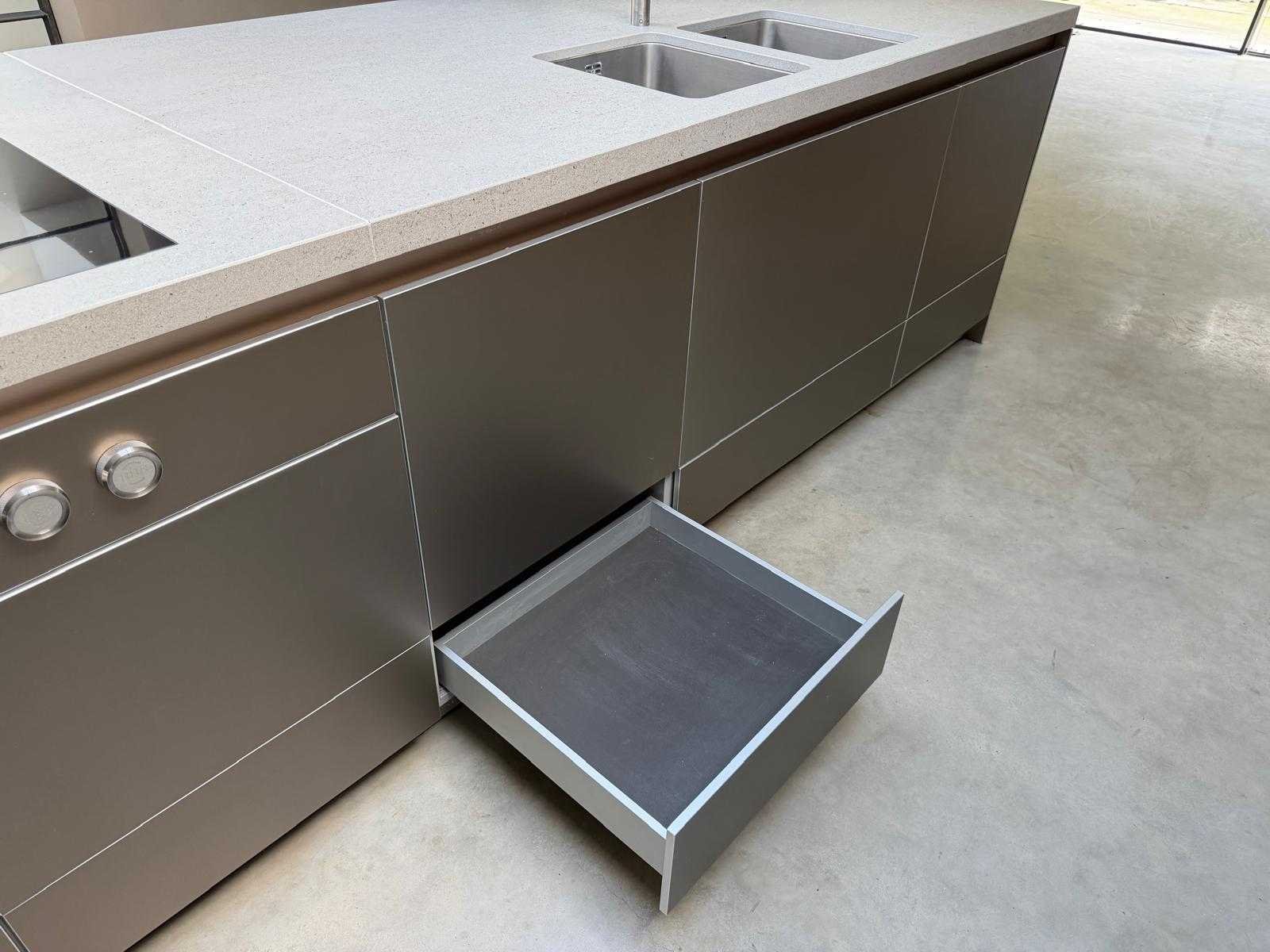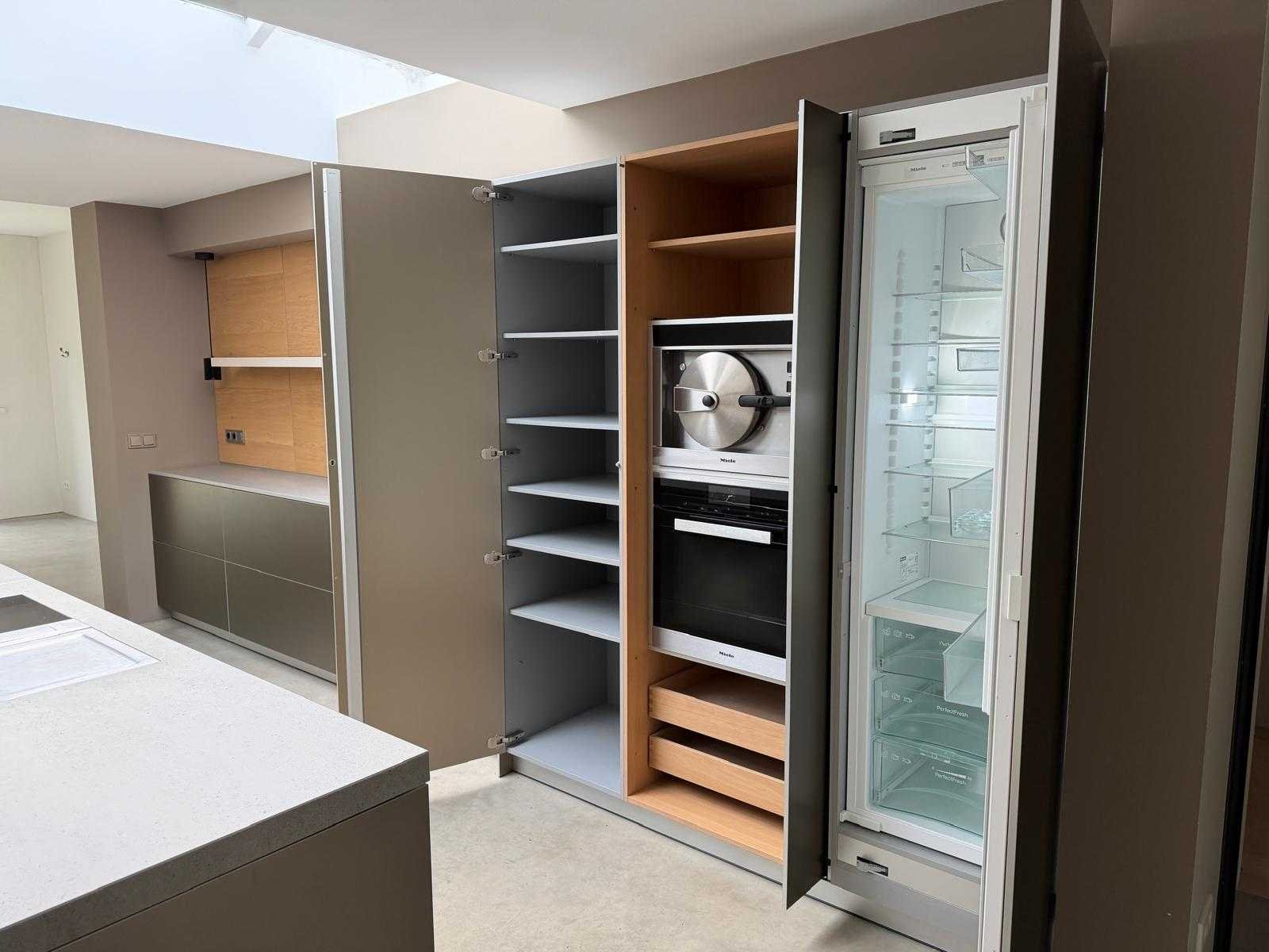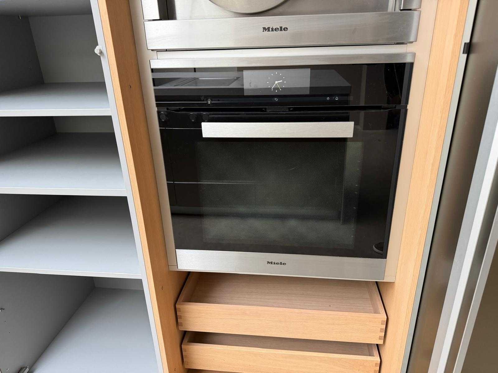 Met Jansen en De Bont hanglamp; let op, blad is licht beschadig, valt na montage te repareren; reeds gedemonteerd en ingepakt op pallets. (afstapelen, omruilen of statiegeld per pallet); pallets zijn niet inbegrepen; statiegeld betalen bij afhalen, of pallets afstapelen; werkblad niet ingepakt op pallets (26-BRUCH-03515) Nee Merk: Bulthaup Model: B3 Type keukenopstelling: Eiland Lengte: 511cm Breedte: 80cm Hoogte: 208cm Aanrechtblad: Dekton Strato Magnetron: Hogedruk stoomoven Miele DGD4635CS Fornuis: Bora profesional met recirculatie Koelkast: Miele K37272iD Softclose: true Oven: Miele H6860BP Vaatwasser: Miele G6570SCVI Lengte kookeiland: 392,4cm Breedte kookeiland: 141,8cm Hoogte kookeiland: 95cm Kleur: Fronten aluminum zandbeige; hoge kasten soft touch lak cashmere; legbord matlak beige; nispanelen structuur eiken fineer; lage kast in structuur eiken fineer