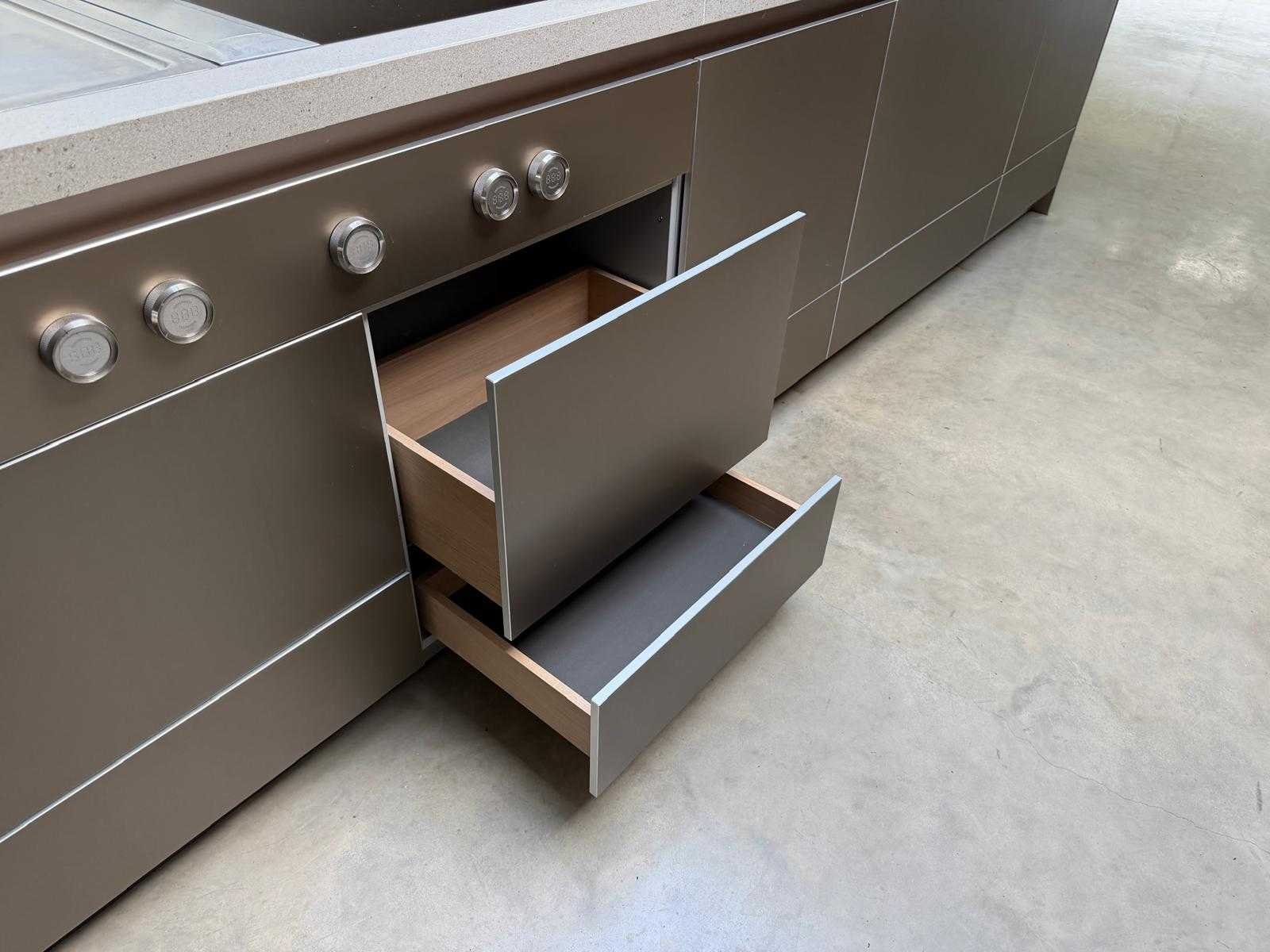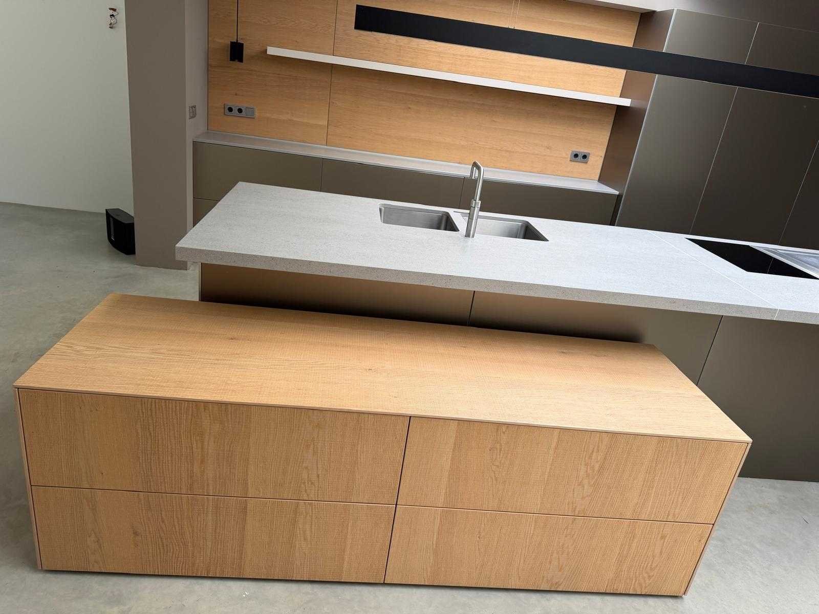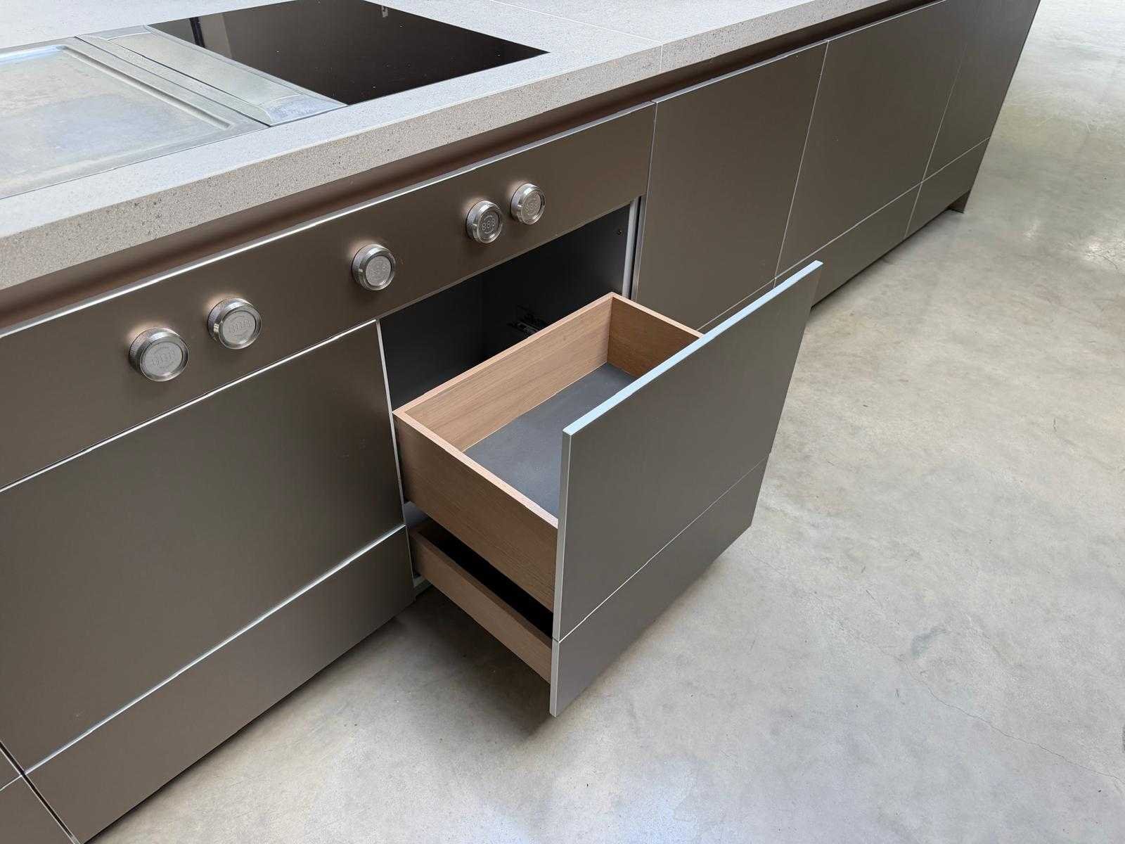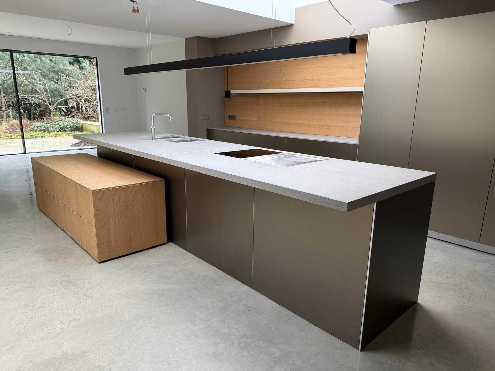 Met Jansen en De Bont hanglamp; let op, blad is licht beschadig, valt na montage te repareren; reeds gedemonteerd en ingepakt op pallets. (afstapelen, omruilen of statiegeld per pallet); pallets zijn niet inbegrepen; statiegeld betalen bij afhalen, of pallets afstapelen; werkblad niet ingepakt op pallets (26-BRUCH-03515) Nee Merk: Bulthaup Model: B3 Type keukenopstelling: Eiland Lengte: 511cm Breedte: 80cm Hoogte: 208cm Aanrechtblad: Dekton Strato Magnetron: Hogedruk stoomoven Miele DGD4635CS Fornuis: Bora profesional met recirculatie Koelkast: Miele K37272iD Softclose: true Oven: Miele H6860BP Vaatwasser: Miele G6570SCVI Lengte kookeiland: 392,4cm Breedte kookeiland: 141,8cm Hoogte kookeiland: 95cm Kleur: Fronten aluminum zandbeige; hoge kasten soft touch lak cashmere; legbord matlak beige; nispanelen structuur eiken fineer; lage kast in structuur eiken fineer