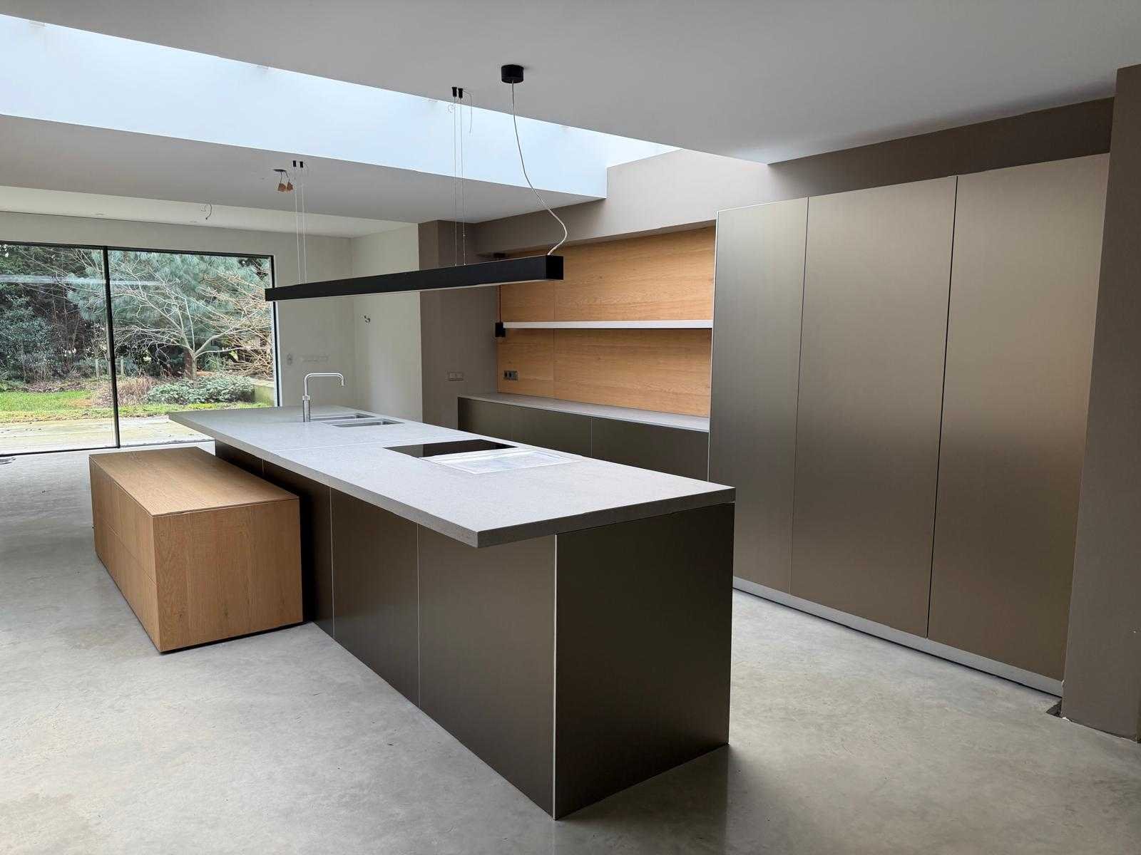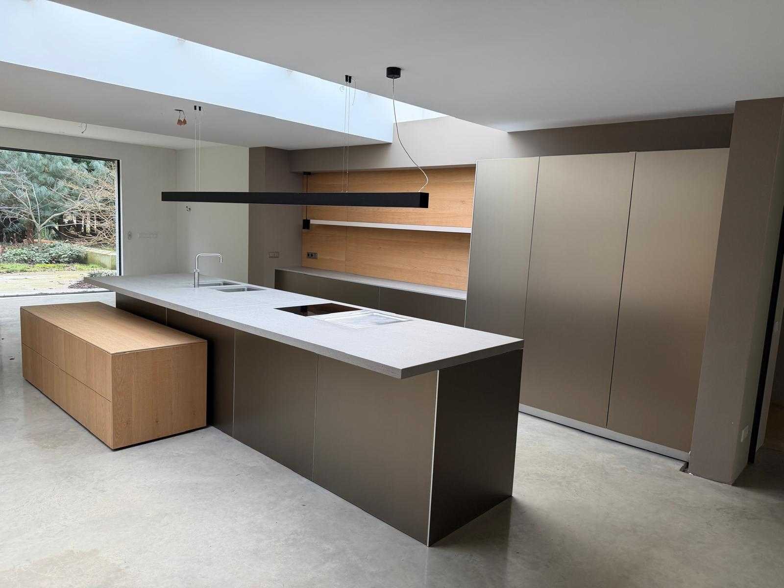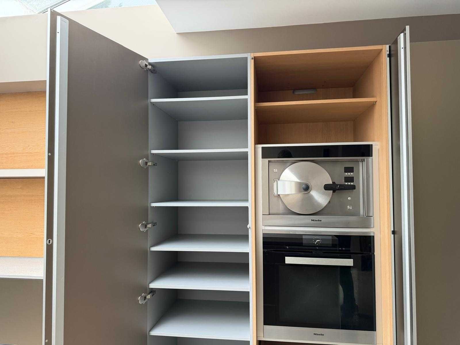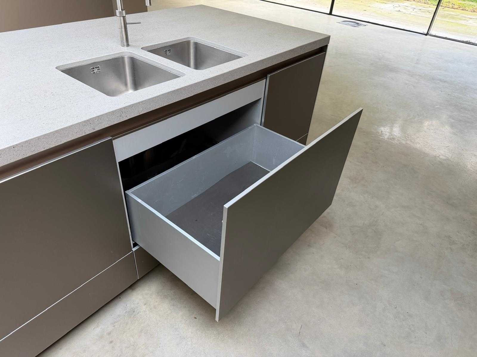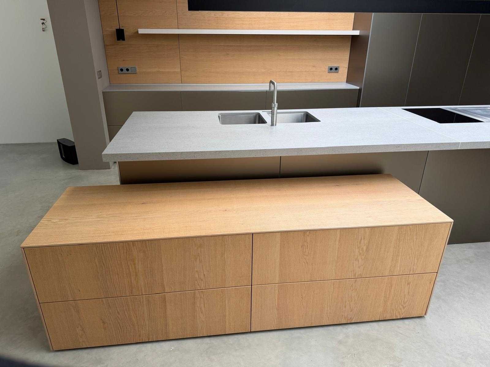 Met Jansen en De Bont hanglamp; let op, blad is licht beschadig, valt na montage te repareren; reeds gedemonteerd en ingepakt op pallets. (afstapelen, omruilen of statiegeld per pallet); pallets zijn niet inbegrepen; statiegeld betalen bij afhalen, of pallets afstapelen; werkblad niet ingepakt op pallets (26-BRUCH-03515) Nee Merk: Bulthaup Model: B3 Type keukenopstelling: Eiland Lengte: 511cm Breedte: 80cm Hoogte: 208cm Aanrechtblad: Dekton Strato Magnetron: Hogedruk stoomoven Miele DGD4635CS Fornuis: Bora profesional met recirculatie Koelkast: Miele K37272iD Softclose: true Oven: Miele H6860BP Vaatwasser: Miele G6570SCVI Lengte kookeiland: 392,4cm Breedte kookeiland: 141,8cm Hoogte kookeiland: 95cm Kleur: Fronten aluminum zandbeige; hoge kasten soft touch lak cashmere; legbord matlak beige; nispanelen structuur eiken fineer; lage kast in structuur eiken fineer