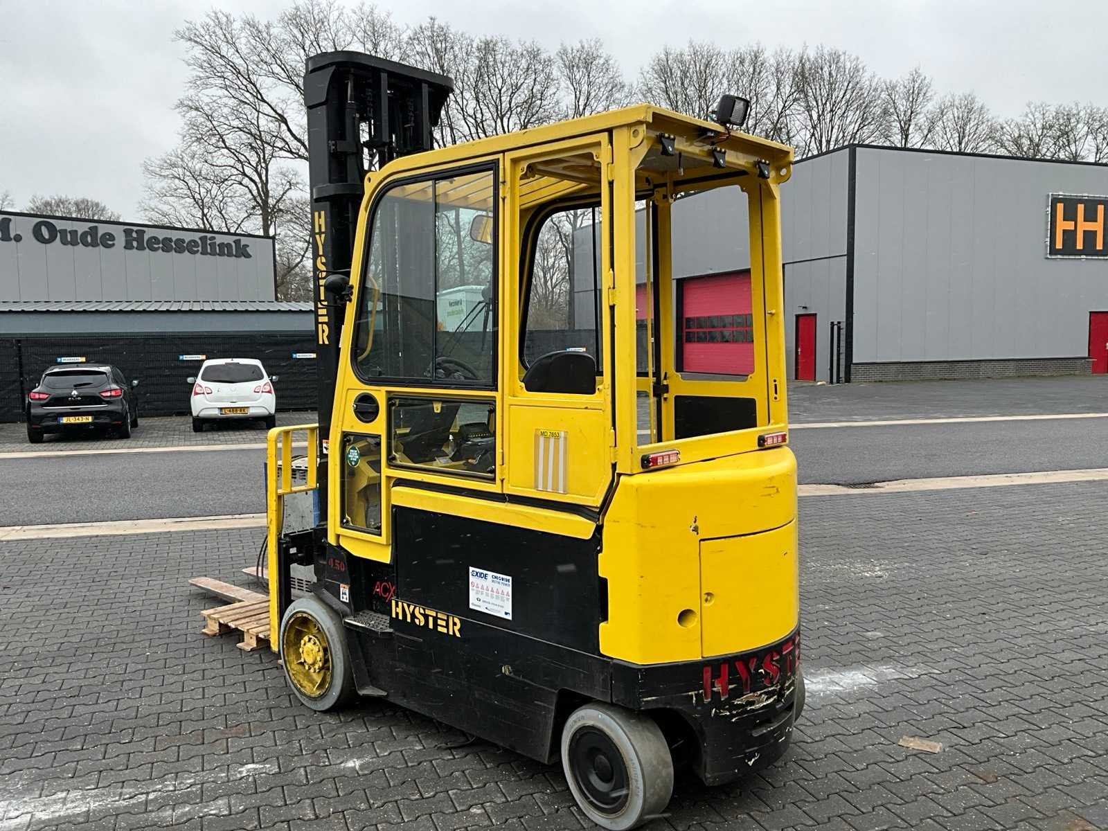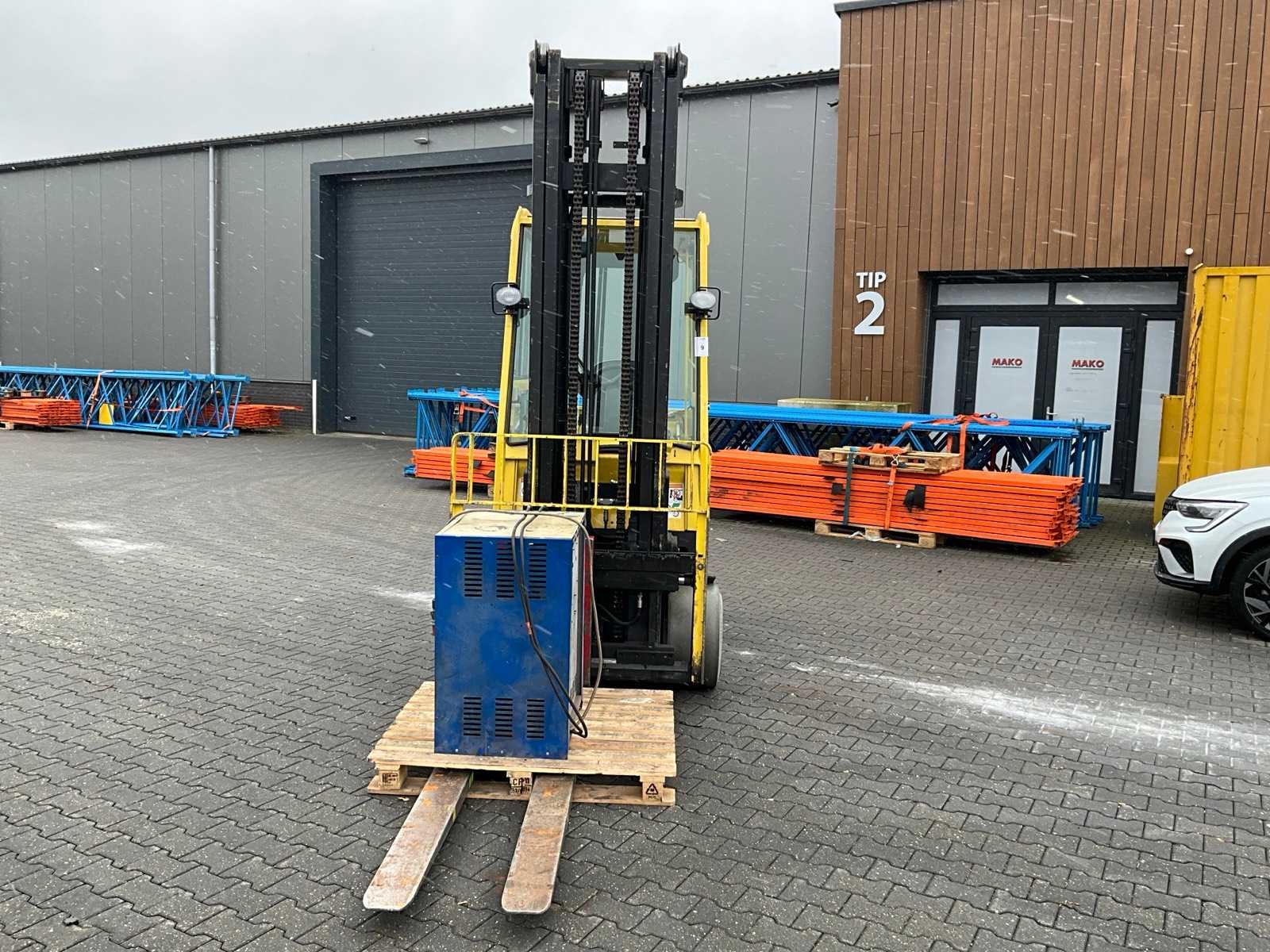 Voorzien van weegsysteem, verwarming. Nee Merk: Hyster Type: E4.50XL Bouwjaar: 2007 Serienummer: E098N01721E Aantal wielen: 4 Accu lader: true Duplex mast: true Eigen gewicht: 8640kg Hefvermogen: 4710kg Lepellengte: 2000mm Hefhoogte: 4750mm Vol rubber banden: true Minimale doorrijhoogte: 3160mm Totale afmeting L: 4700mm Totale afmeting Breedte: 1250mm Totale afmeting Hoogte: 3160mm