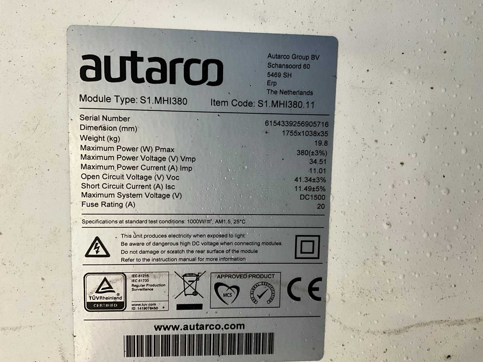 Nee Merk: Autaro Type: S1.MHI380 Max. dc power: 380W Eigen gewicht: 19kg Totale afmeting L: 1755mm Totale afmeting Breedte: 1040mm Totale afmeting Hoogte: 35mm