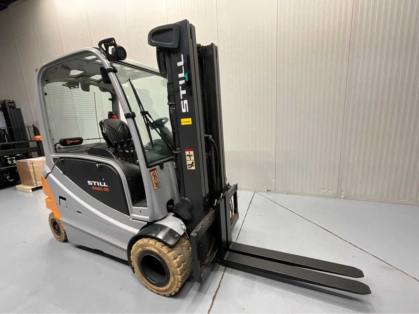 Bluespot, half gesloten cabine, 3e en 4e functie, non marking banden, accu 2024 Nee Merk: Still Type: RX60-35 Bouwjaar: 2016 Serienummer: 516356G00109 Brandstof: Elektrisch Soort band: Volrubber banden non marking Aantal wielen: 4 Free-lift: true Triple mast: true Eigen gewicht: 5732kg Hefvermogen: 3500kg Lepellengte: 1200mm Max. hefhoogte: 4900mm Hefhoogte: 4900mm Vol rubber banden: true Minimale doorrijhoogte: 2300mm Totale afmeting L: 4000mm Totale afmeting Breedte: 1500mm Totale afmeting Hoogte: 2300mm