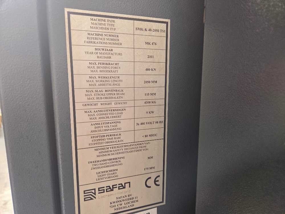 Inclusief 1 set gereedsschap No Merk: Safan Type: SMK K 40 2050 TS1 Bouwjaar: 2001 Capaciteit.: 40t Werklengte: 2050mm Aantal assen: 6 Aansluiting: 400V