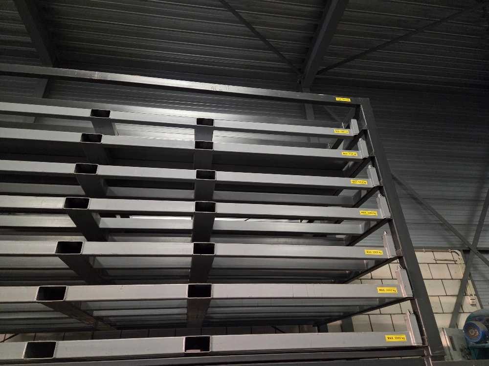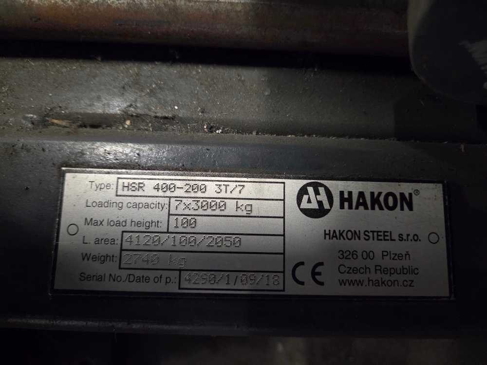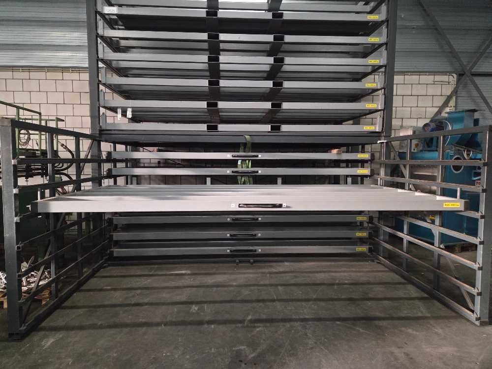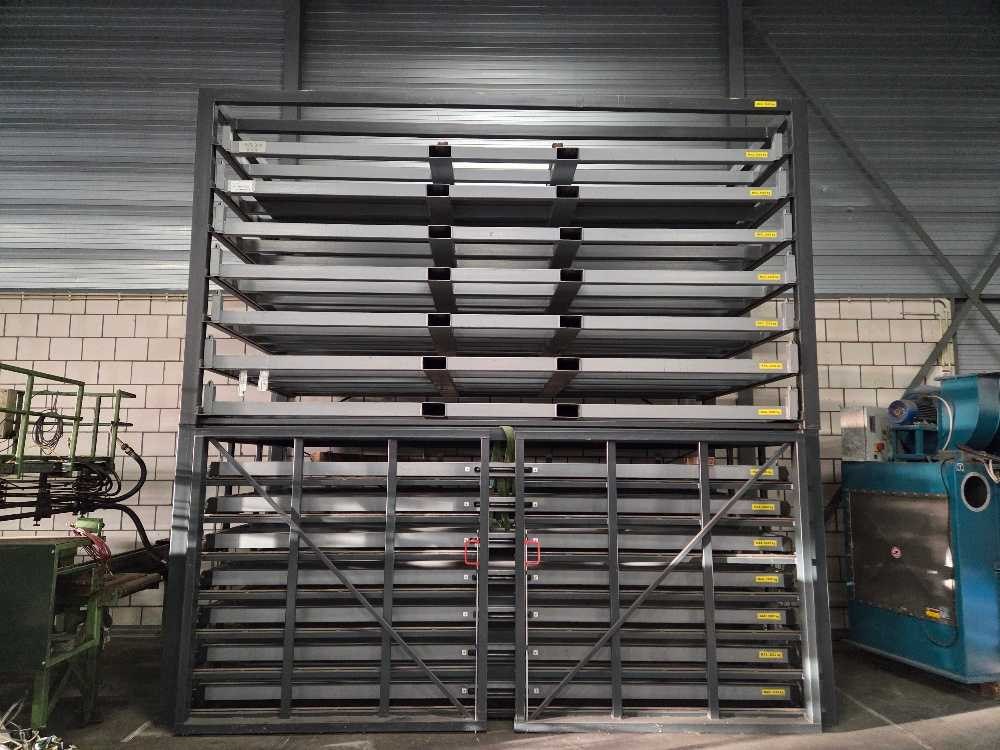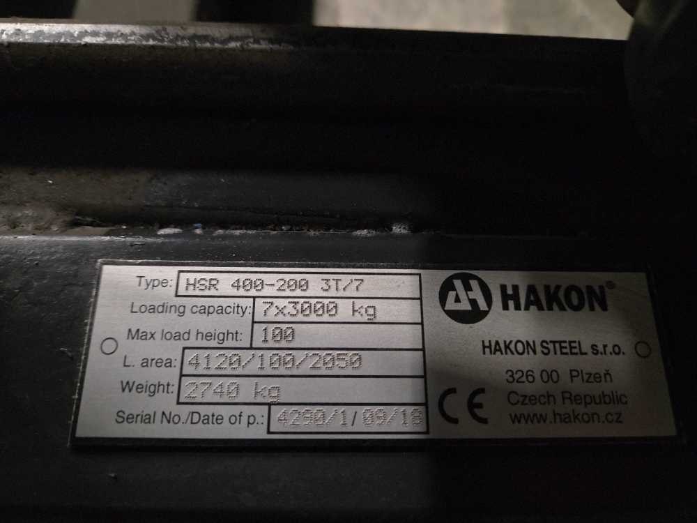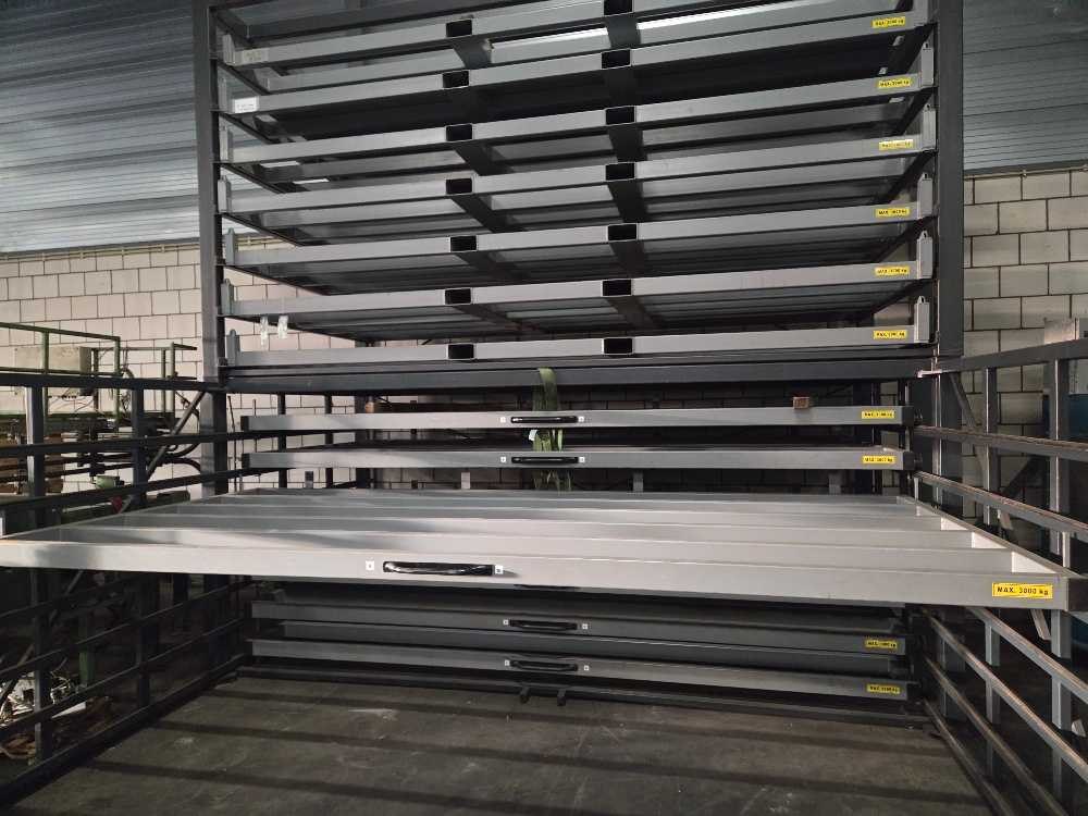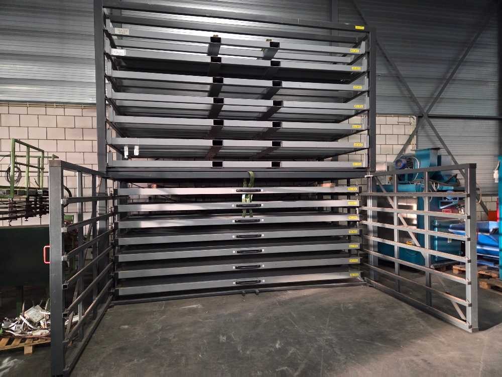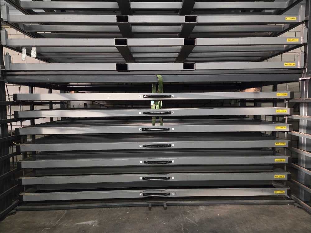 Geschikt voor stalenplaten van 4000 x 2000 mm; 3000 kg per lade; totaal 7 uitschijfbare lades + 7 uitneembare heftruck lades Nee Merk: Hakon Type: HSR 400-200 3T/7 Bouwjaar: 2018 Aantal secties: 14 Sectie afm. b: 2000mm Sectie diepte: 4000mm Materiaal: Staal