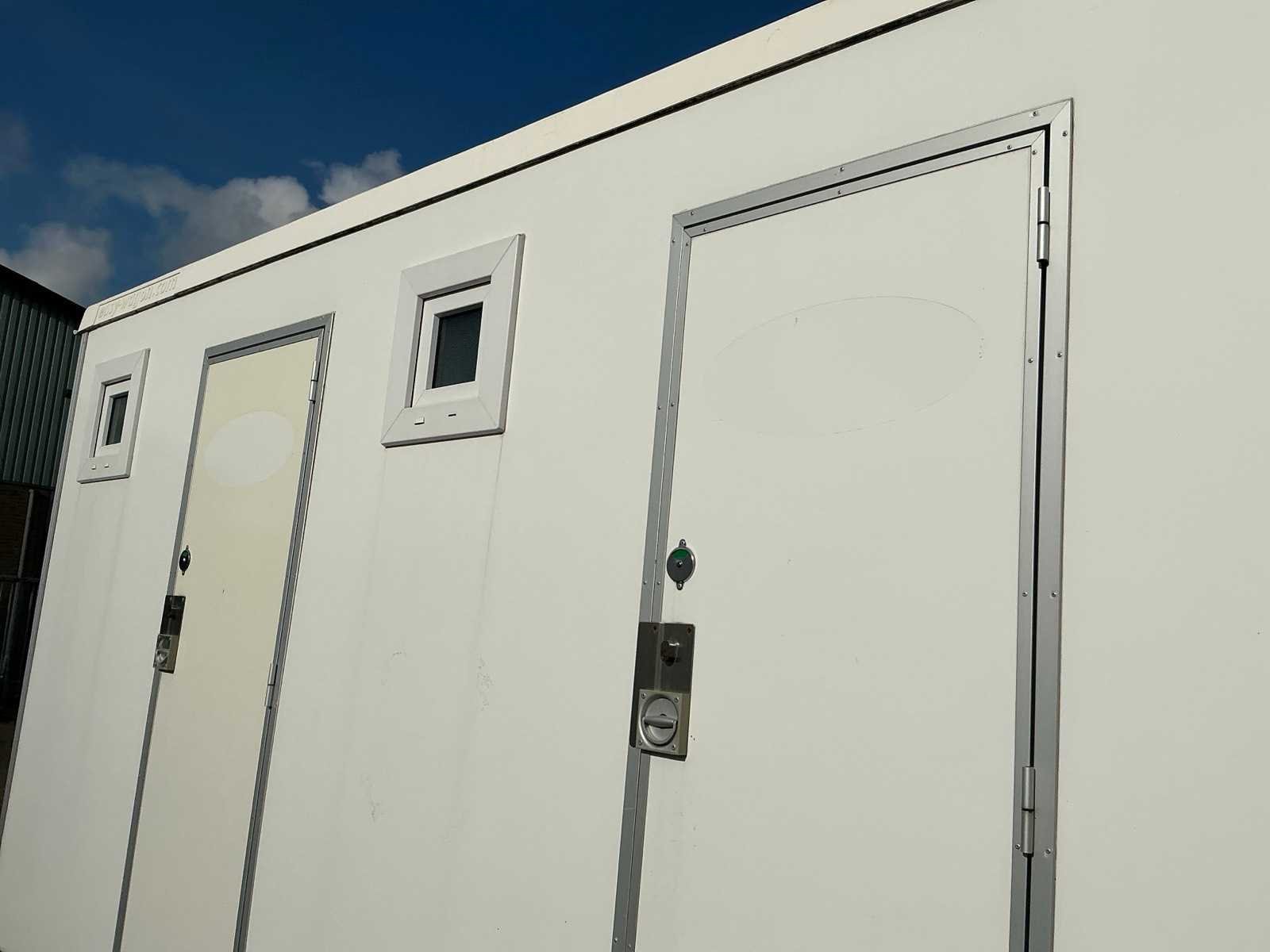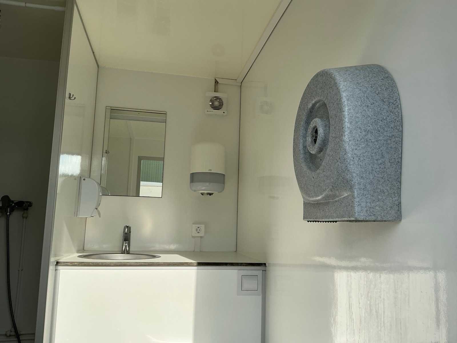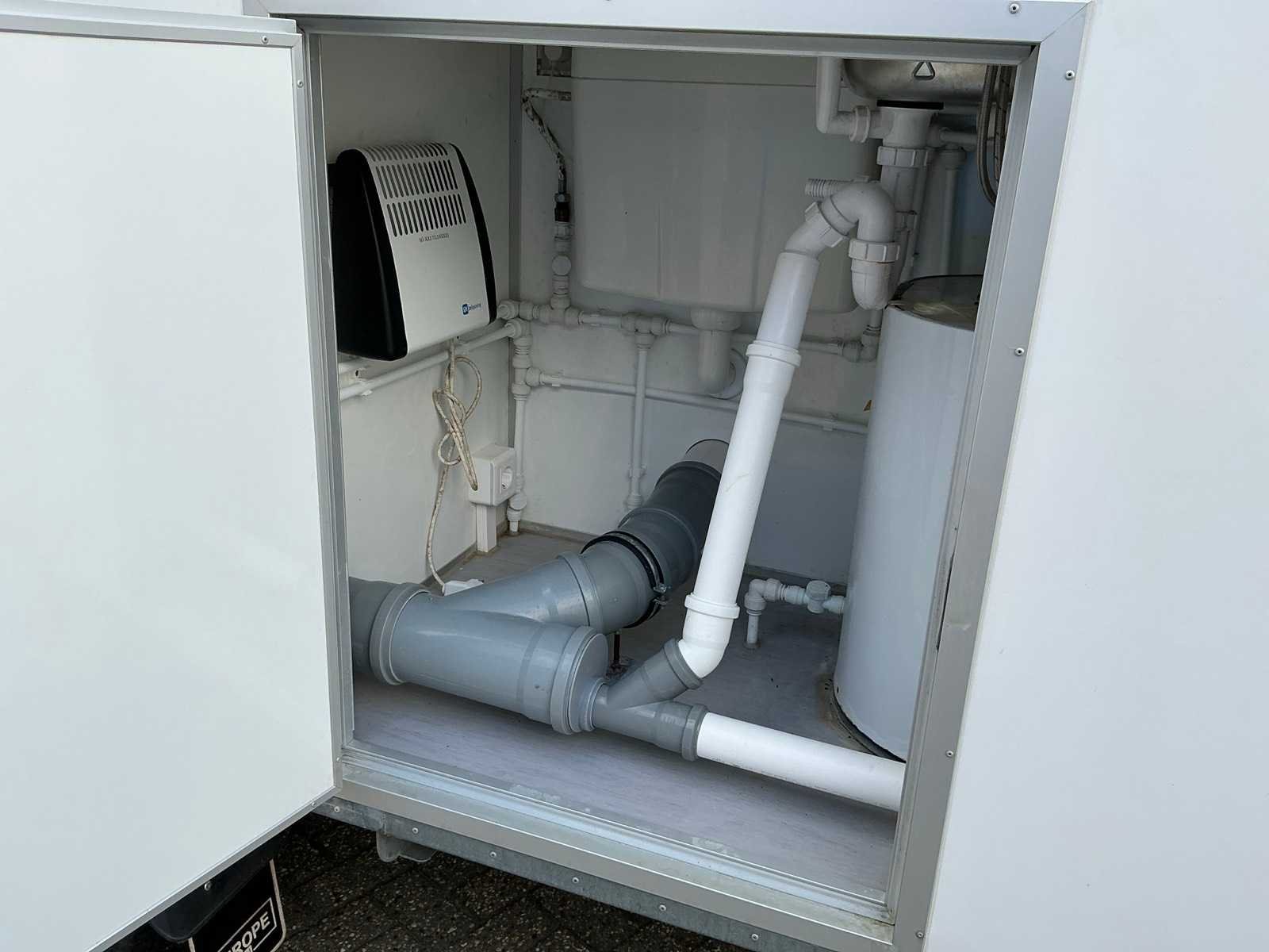 Voorzien van: 3x complete doucheruimte voorzien van toilet met toiletrolhouder vuilnisbak en toiletborstel, wasbak met kraan en spiegel en zeeppompdispenser, bankje, douchebak met douchekraan en gordijn, electrische kachel, verlichting, trapje, technische ruimte per doucheruimte ( 30L boiler, antivrieskachel, spoelbak toilet), aansluiting 1x 110 PVC, 1x 3/4 wateraansluiting, 1x 400V 16A aansluiting, steunpoten Nee Merk: Easywagen Type: 660 Bouwjaar: 2018 Afmeting l: 6600mm Afmeting b: 2500mm Afmeting h: 2900mm Aantal ramen: 3 Aantal toiletten: 3 Aantal wastafels: 3 Aantal douches: 3 Eigen gewicht: 2000kg