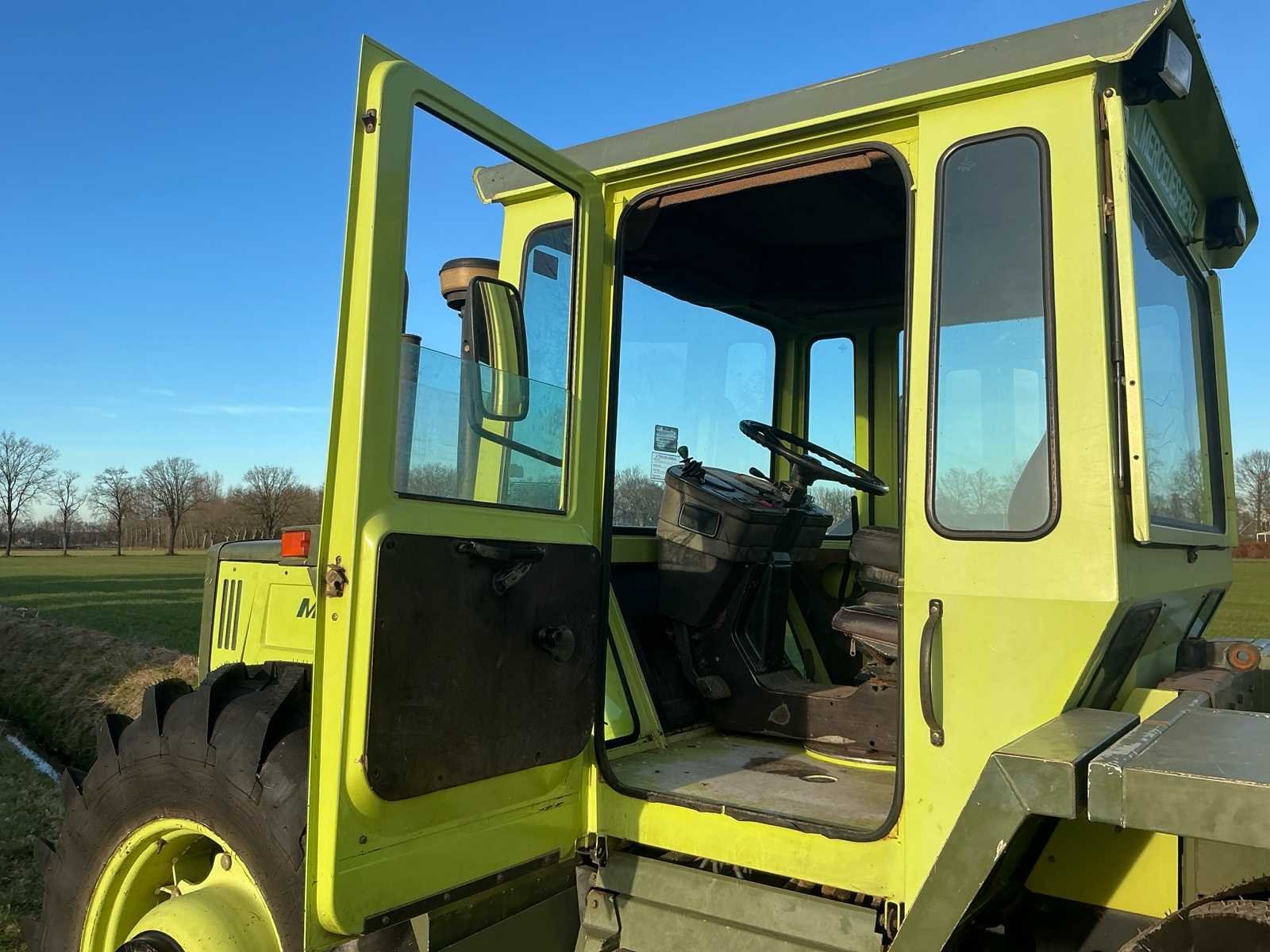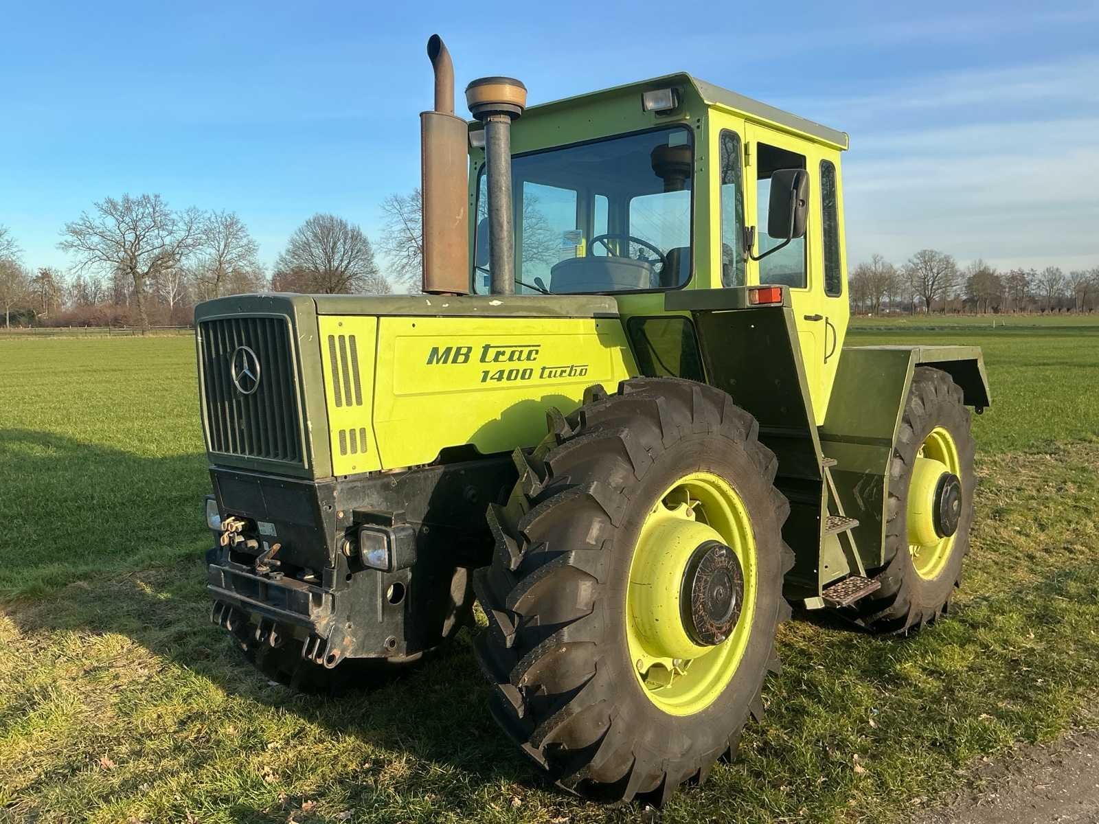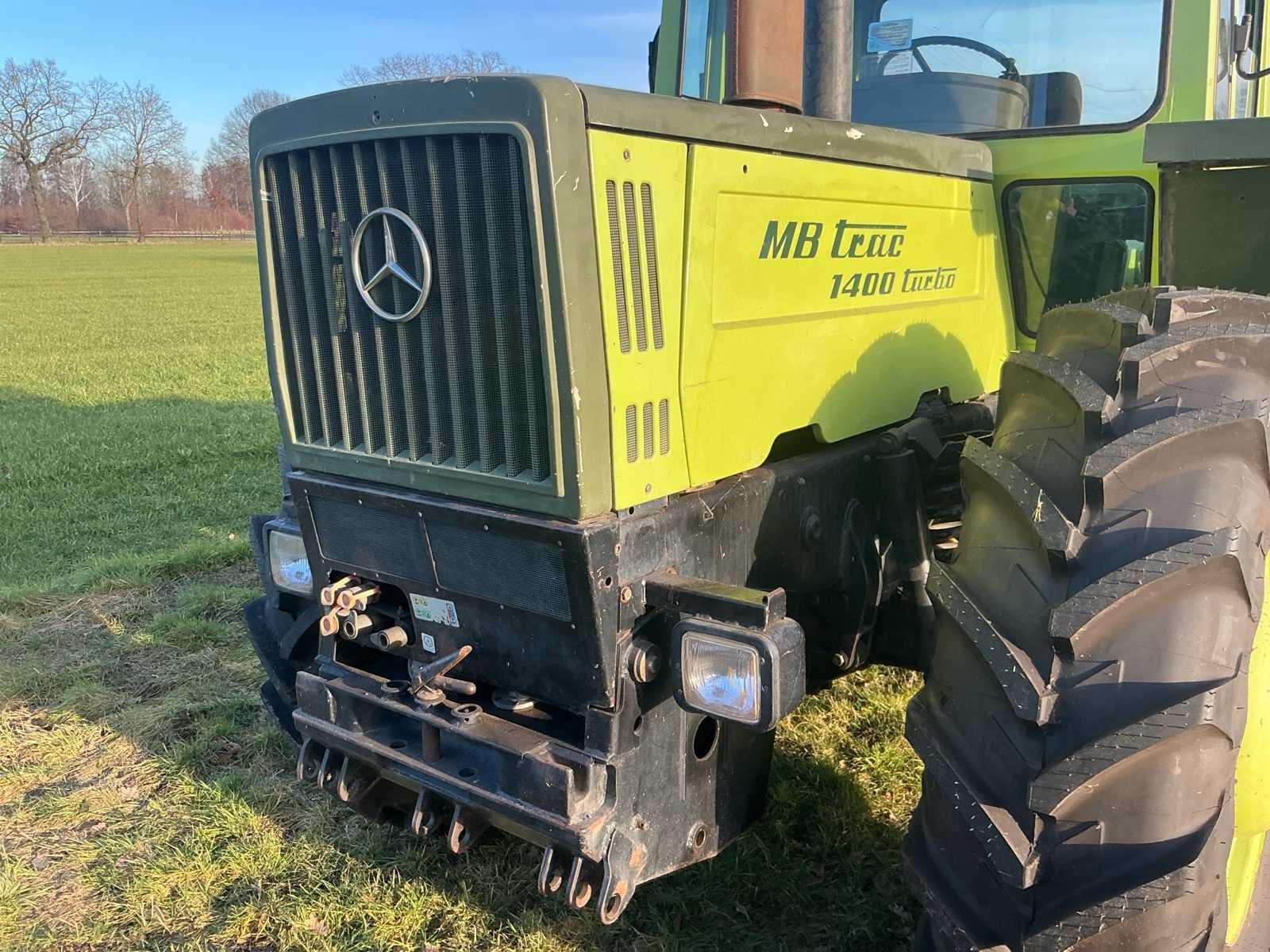 Aandrijving: 4×4, portaalassen, Motor, Type: Mercedes-Benz OM366A (turbo), Cilinders: 6-cilinder lijn, Cilinderinhoud: ± 6,0 liter, Vermogen: circa 136–140 pk, Brandstof: Diesel, Koeling: Watergekoeld, Versnellingsbak: Mercedes handgeschakeld, Versnellingen: 16 vooruit / 8 achteruit (met groepen), Maximale snelheid: tot 40 km/u, Aftakas (PTO): 540 / 1000 t/min, Hydrauliekopbrengst: circa: 45–55 l/min, Hefvermogen achter: ± 6.500–7.000 kg Nee Merk: Mercedes-Benz Type: MB Trac 1400 Turbo Bouwjaar: 1989 Kenteken: GEEN Motorvermogen (kW): 103kW Afgelezen urenstand: 7270 Versnellingsbaktype: Handgeschakeld Aantal hydraulische ventielen voor: 3 Aantal hydraulische ventielen achter: 3 Bandenmaat voor: 18.4 R34 Bandenmaat achter: 18.4 R34 Cabine: true Luchtgeveerde stoel: true Eigen gewicht: 7200kg Totale afmeting L: 4500mm Totale afmeting Breedte: 2450mm Totale afmeting Hoogte: 2900mm Chassisnummer: WB4431644 151047