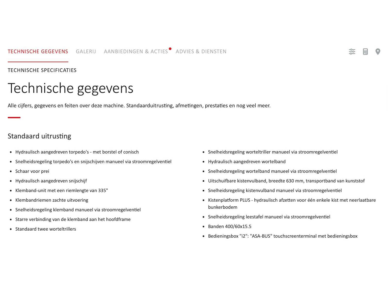 Specificaties en uitrusting; zie laatste foto’s. Nee Merk: Grimme / Asa-Lift Type: PO-335 Bouwjaar: 2019 Serienummer: 29118 Eigen gewicht: 3700kg Totale afmeting L: 6150mm Totale afmeting Breedte: 3300mm Totale afmeting Hoogte: 2800mm