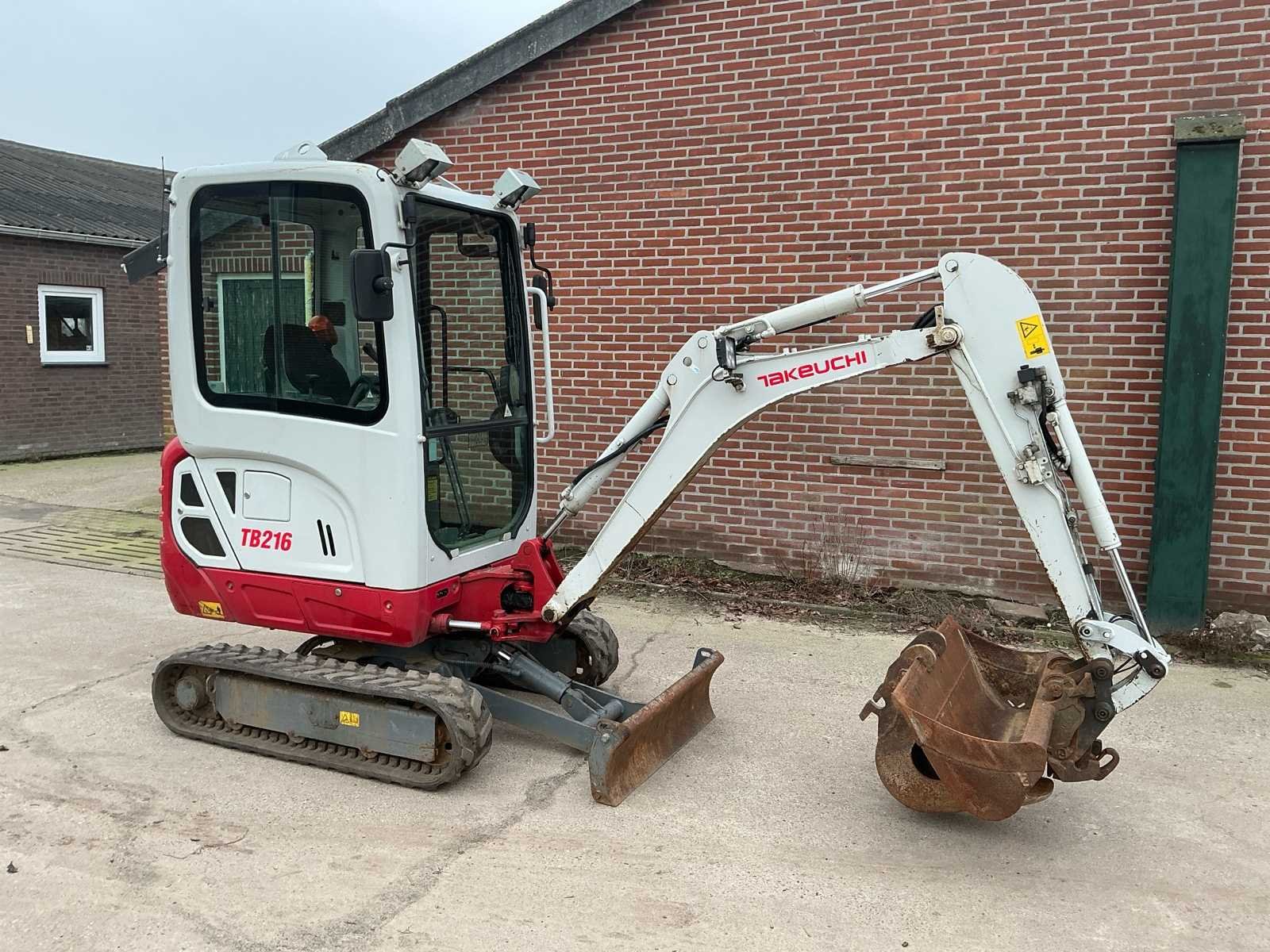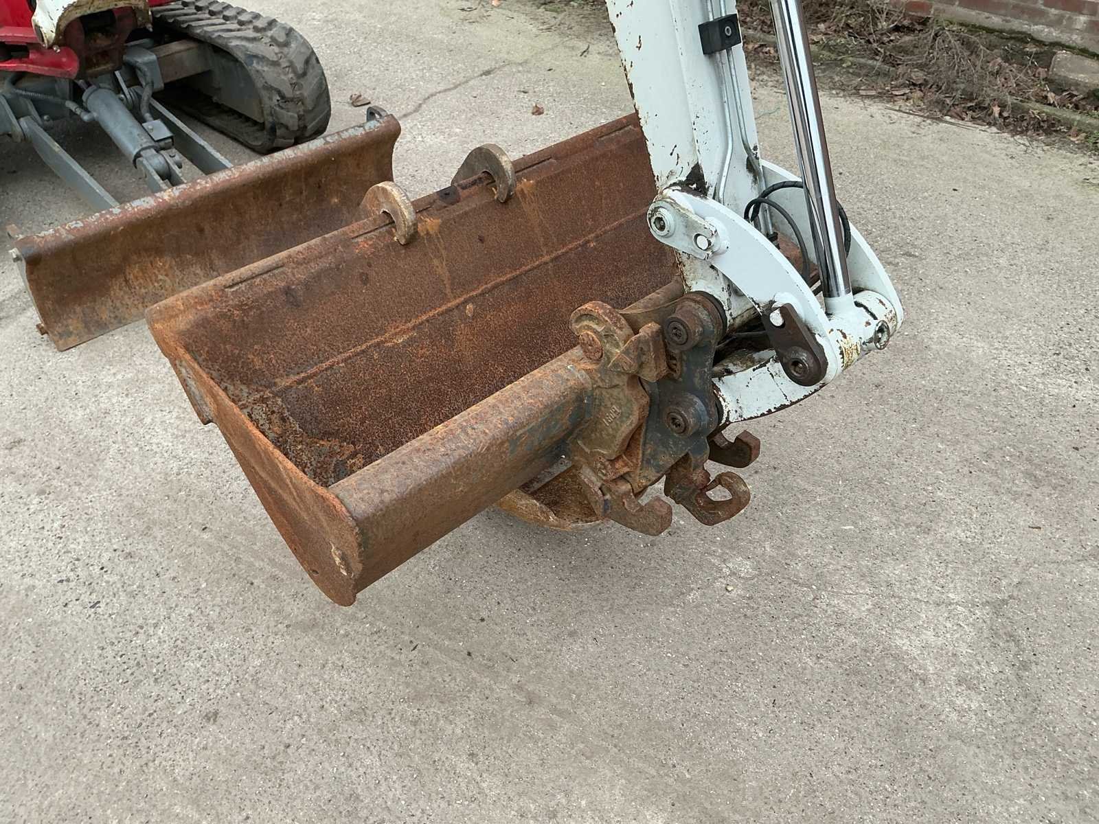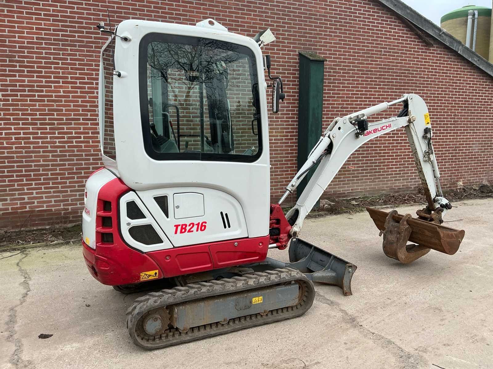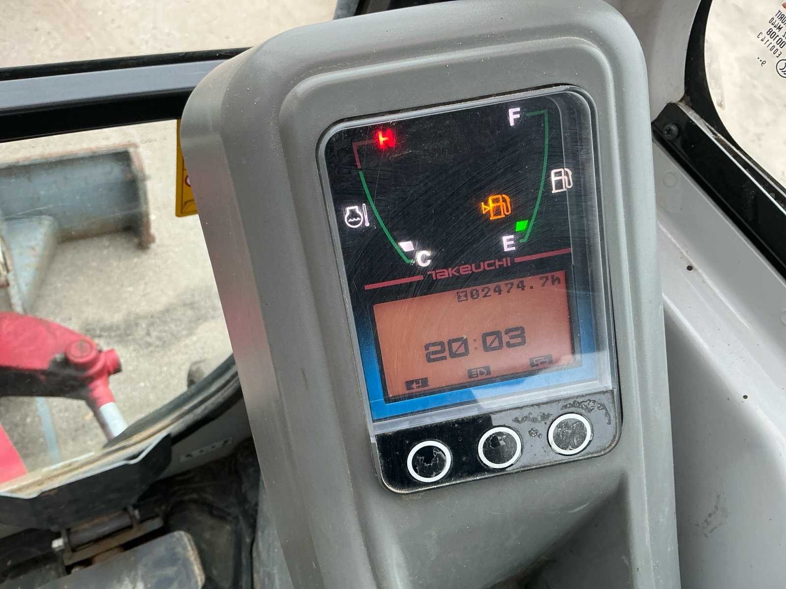 Voorzien van: hydraulische snel wissel VW05, opschoonbak 1000mm, sleuvenbak 220mm, met omkeerbare oren, hijshaak, werklampen, onderlagen te verbreden, zwaailicht, offset giek, radio, totale lengte 3.875 mm, totale hoogte (cabine / luifel) 2.360 mm, totale breedte bovenbouw (cabine / luifel) 1.055 mm, bodemvrijheid 205 mm, totale lengte rupsbanden 1.520 mm, totale breedte rupsbanden - rupsbanden ingetrokken 980 mm, totale breedte rupsbanden - rupsbanden uitgeschoven 1.300 mm. Nee Merk: Takeuchi Type: TB126 Bouwjaar: 2020 Serienummer: 216015387 Merk motor: Yamar Motorvermogen (kW): 11.5kW Aantal cilinders: 3 Brandstof: Diesel Bedrijfsgewicht: 1900kg Inclusief graafbak: Ja Graafbak afm. b: 1000mm Rups breedte: 230mm Afgelezen urenstand: 2474 Eigen gewicht: 1900kg Totale afmeting L: 3800mm Totale afmeting Breedte: 980mm Totale afmeting Hoogte: 2400mm