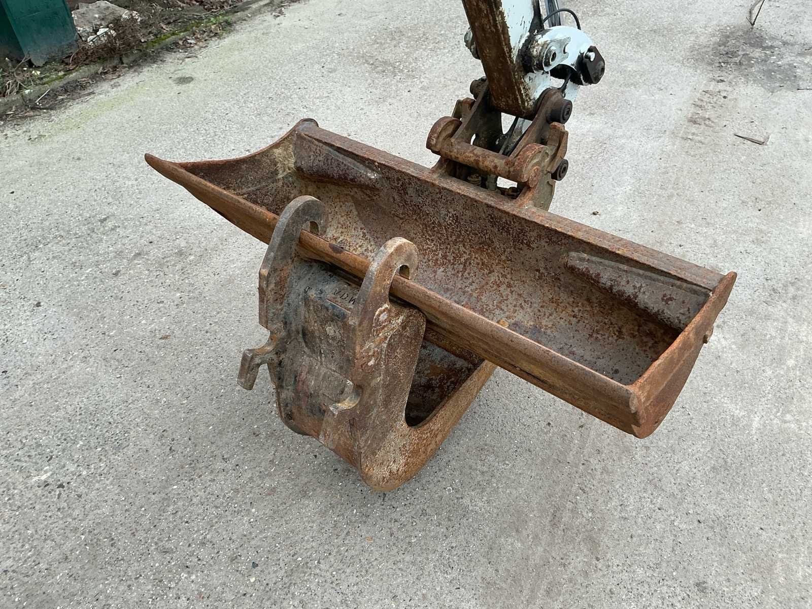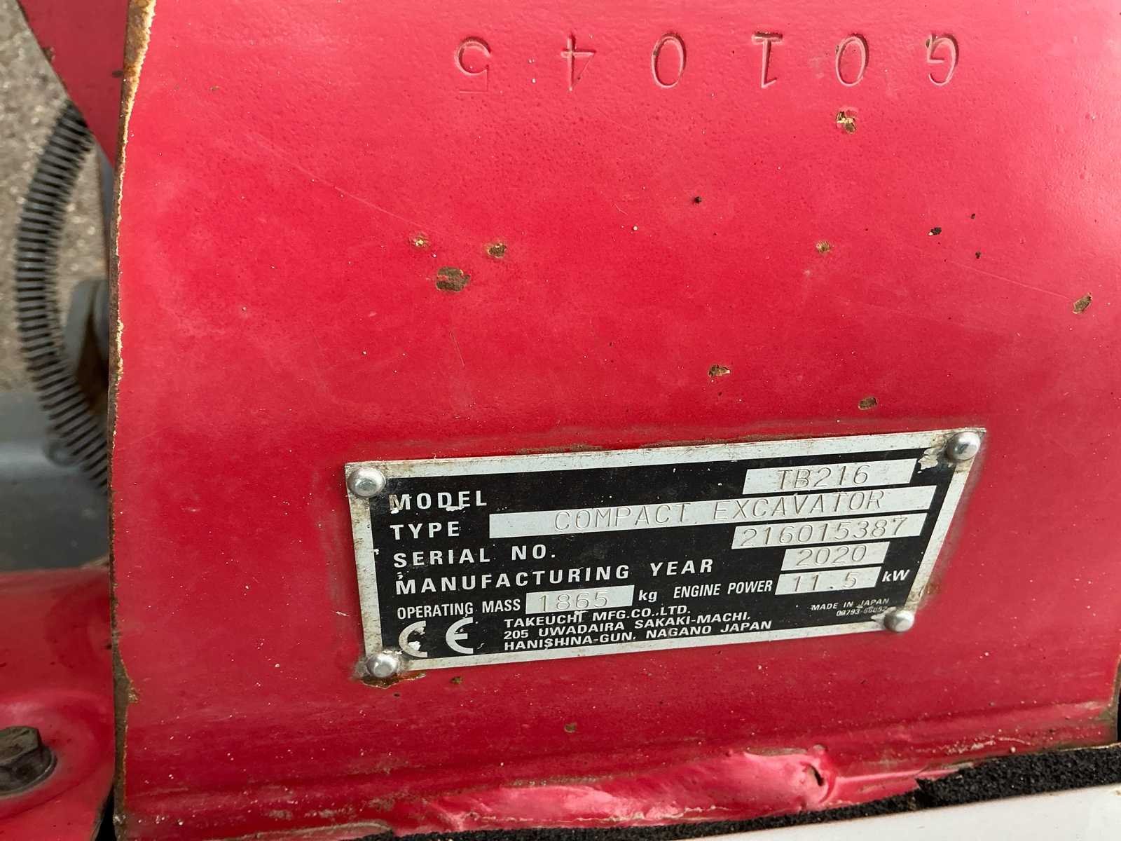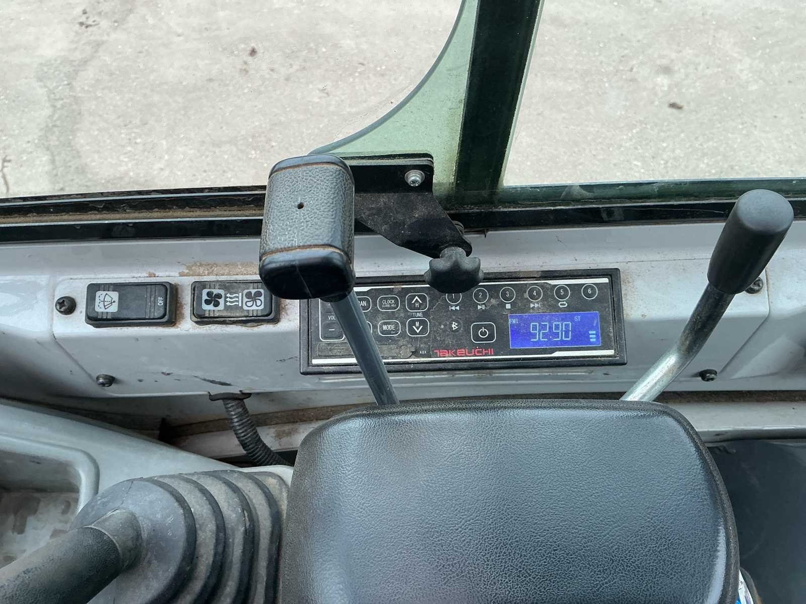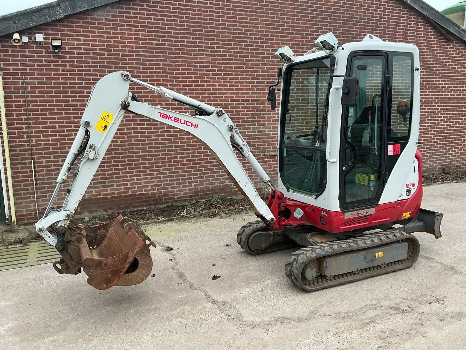 Voorzien van: hydraulische snel wissel VW05, opschoonbak 1000mm, sleuvenbak 220mm, met omkeerbare oren, hijshaak, werklampen, onderlagen te verbreden, zwaailicht, offset giek, radio, totale lengte 3.875 mm, totale hoogte (cabine / luifel) 2.360 mm, totale breedte bovenbouw (cabine / luifel) 1.055 mm, bodemvrijheid 205 mm, totale lengte rupsbanden 1.520 mm, totale breedte rupsbanden - rupsbanden ingetrokken 980 mm, totale breedte rupsbanden - rupsbanden uitgeschoven 1.300 mm. Nee Merk: Takeuchi Type: TB126 Bouwjaar: 2020 Serienummer: 216015387 Merk motor: Yamar Motorvermogen (kW): 11.5kW Aantal cilinders: 3 Brandstof: Diesel Bedrijfsgewicht: 1900kg Inclusief graafbak: Ja Graafbak afm. b: 1000mm Rups breedte: 230mm Afgelezen urenstand: 2474 Eigen gewicht: 1900kg Totale afmeting L: 3800mm Totale afmeting Breedte: 980mm Totale afmeting Hoogte: 2400mm