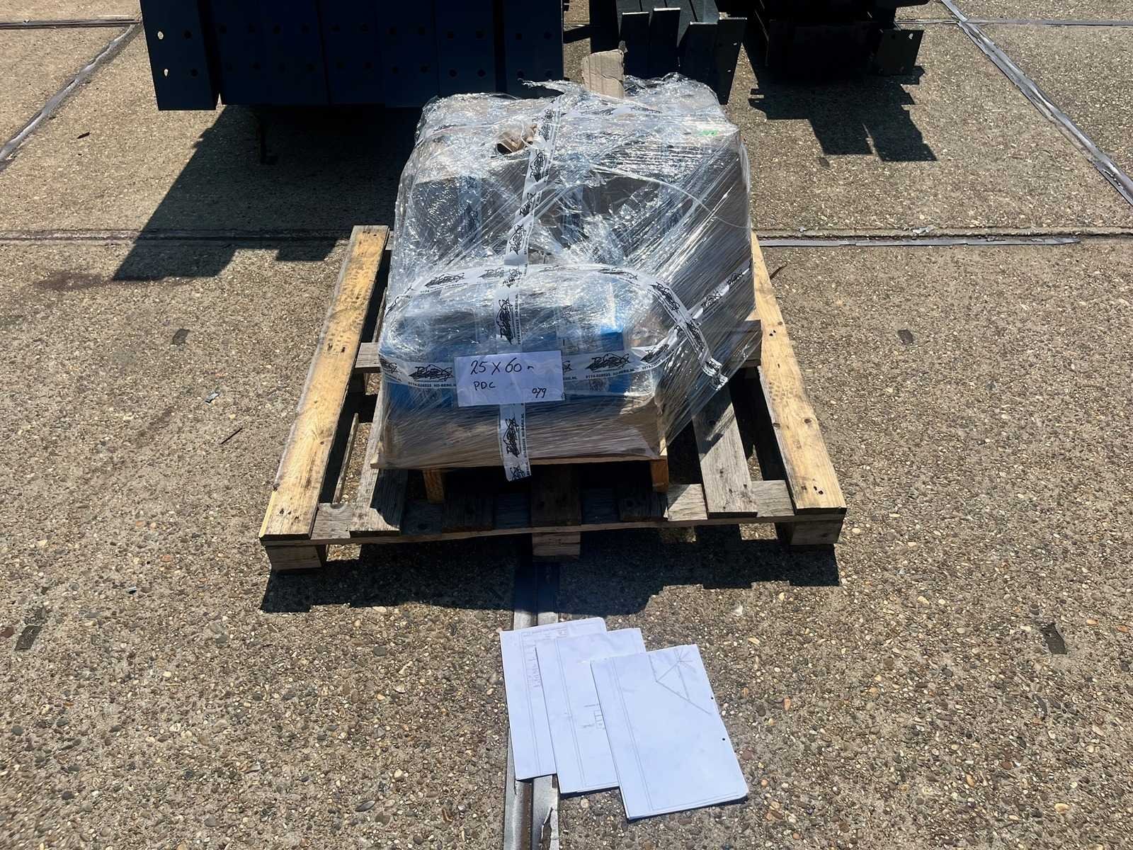 Nederlandse productie; vrije overspanning; spanten h.o.h. 5000mm; staalberekeningen; staaltekeningen; montagetekeningen; ankerplan; staal genummerd volgens montageplan; dakhelling 20 graden; 11 sets tussenspanten IPE360/300; 2 sets eindspanten IPE 200/180 met windstijlen waarvan 1 set voorzien is van een deursparing; voorzien van drukkokers; windverbanden; gordinglippen; bouten en moeren; meestort ankers; staalconstructie volgens productnorm EN1090 (Certificaat na aankoop verkrijgbaar); kavel ligt netjes transportklaar en dient met 2 trailers opgehaald te worden; kavel wordt gratis met een heftruck geladen No Materiaal: Gepoedercoat staal antraciet Bouwjaar: 2026 Totaal oppervlakte: 1500m² Nok hoogte: 9550mm Goot hoogte: 5000mm Totale afmeting L: 60000mm Totale afmeting Breedte: 25000mm