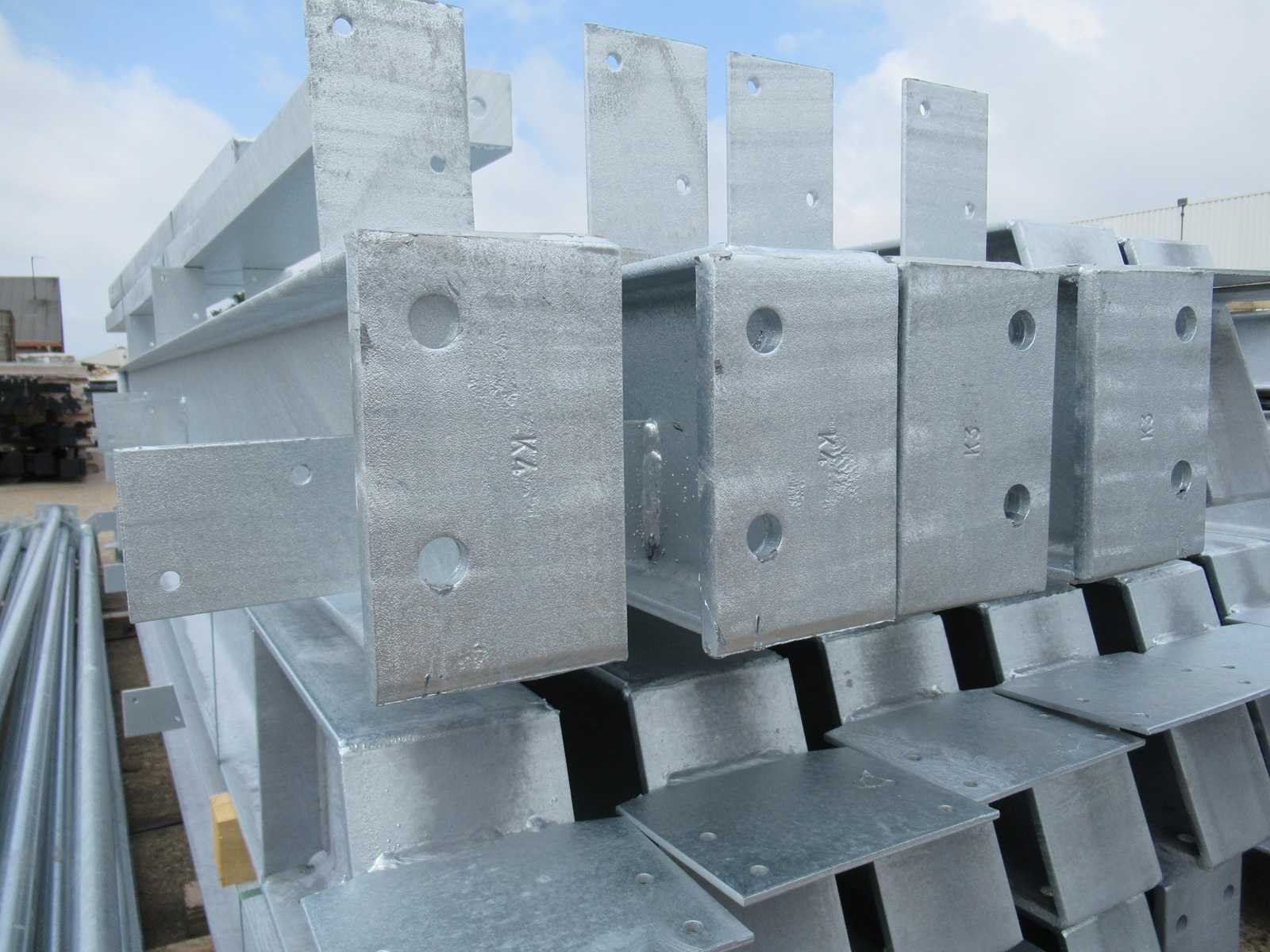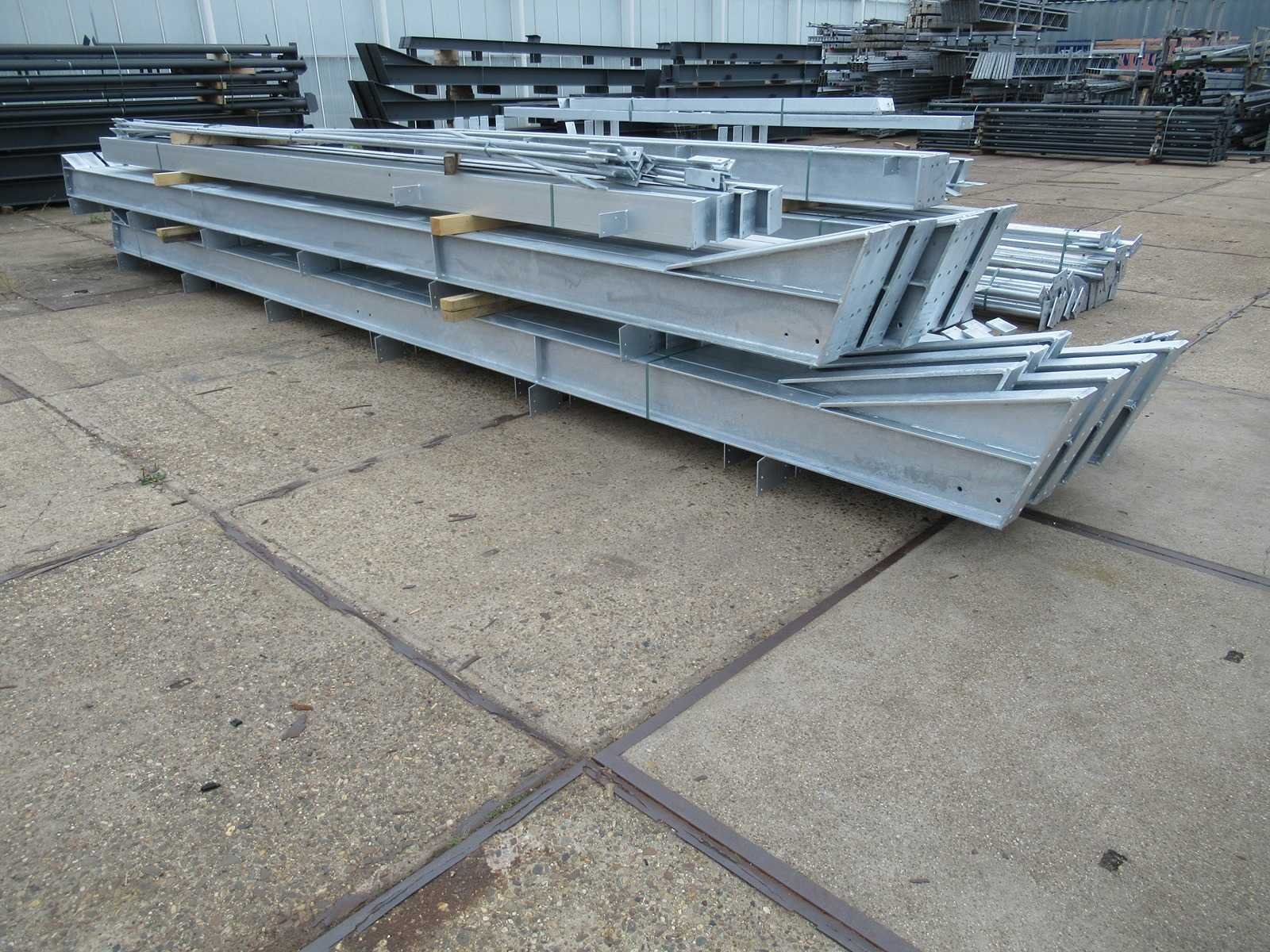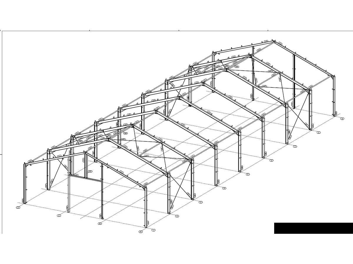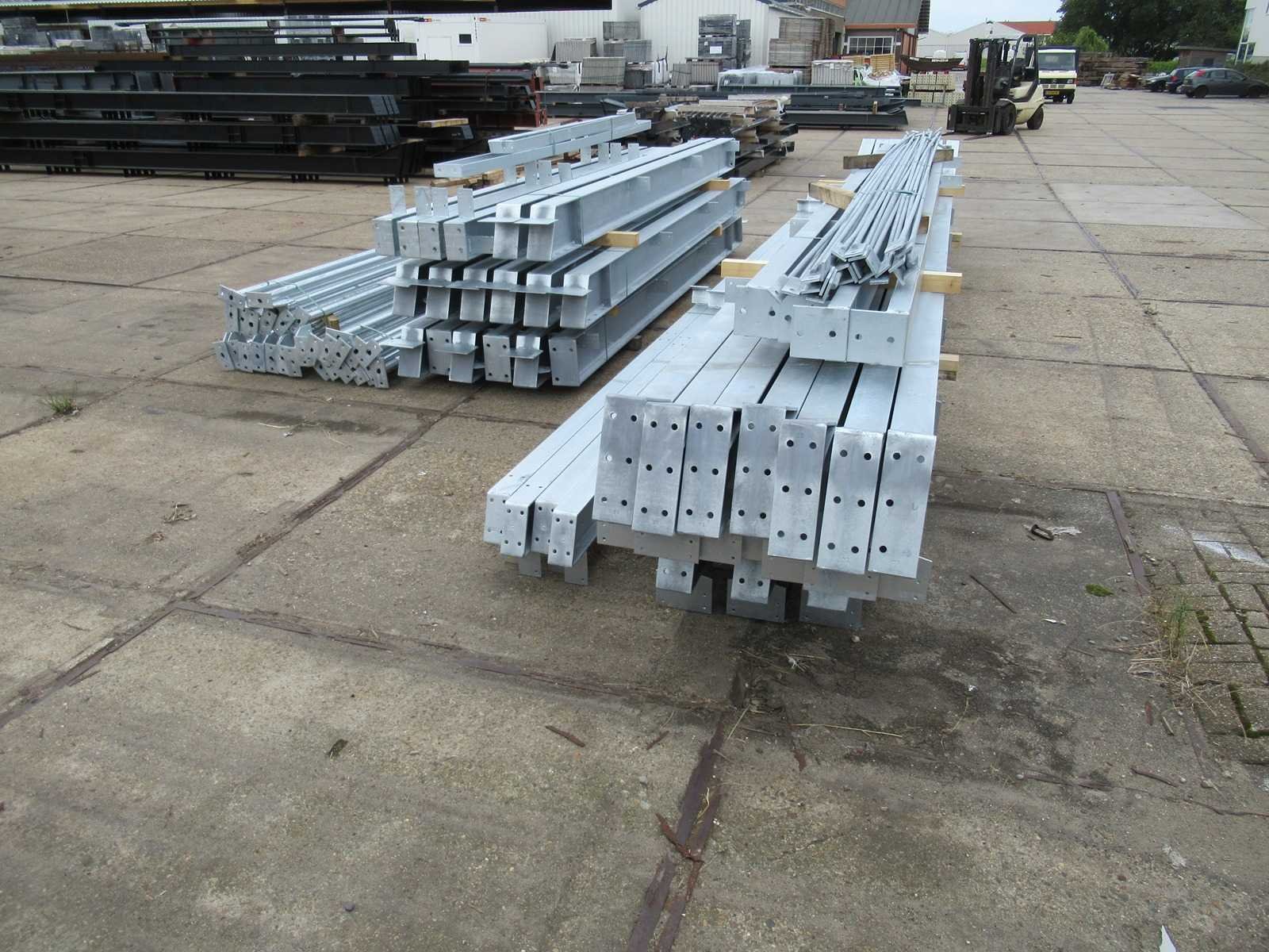 Nederlandse productie; vrije overspanning; spanten h.o.h. 5000mm; staalberekeningen; staaltekeningen; montagetekeningen; ankerplan; staal genummerd volgens montageplan; dakhelling 20 graden; 7 sets tussenspanten IPE 270/240; 2 sets eindspanten IPE 200/180 met windstijlen waarvan 1 set voorzien is van een deursparing; voorzien van drukkokers; windverbanden; gordinglippen; bouten en moeren; meestort ankers; staalconstructie volgens productnorm EN1090 (Certificaat na aankoop verkrijgbaar); kavel ligt netjes transportklaar en dient met 1 trailer opgehaald te worden; kavel wordt gratis met een heftruck geladen No Materiaal: Thermisch verzinkt staal Bouwjaar: 2026 Totaal oppervlakte: 600m² Nok hoogte: 7230mm Goot hoogte: 4500mm Totale afmeting L: 40000mm Totale afmeting Breedte: 15000mm