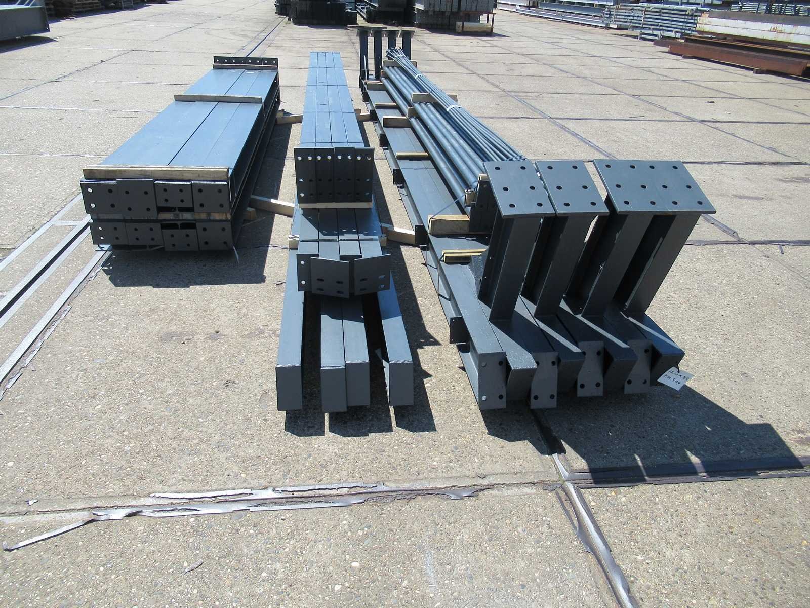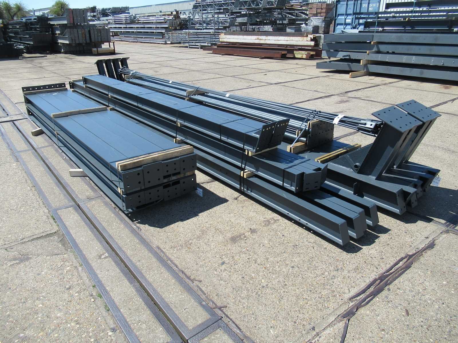 Vrije overspanning; spanten h.o.h. 5000mm; dakhelling 20 graden; 4 sets tussenspanten HEA180 staanders en IPE180 spanten; 2 sets kopgevelspanten IPE160 met windstijlen; staaltekening; 3D-tekening; voorzien van drukkokers; windverbanden; gordinglippen tussen de spanten; kavel ligt netjes transportklaar en dient met 1 trailer opgehaald te worden; kavel wordt gratis met een heftruck geladen No Materiaal: Geschilderd staal kleur antraciet Totaal oppervlakte: 327m² Nok hoogte: 7400mm Goot hoogte: 5000mm Totale afmeting L: 25000mm Totale afmeting Breedte: 13100mm