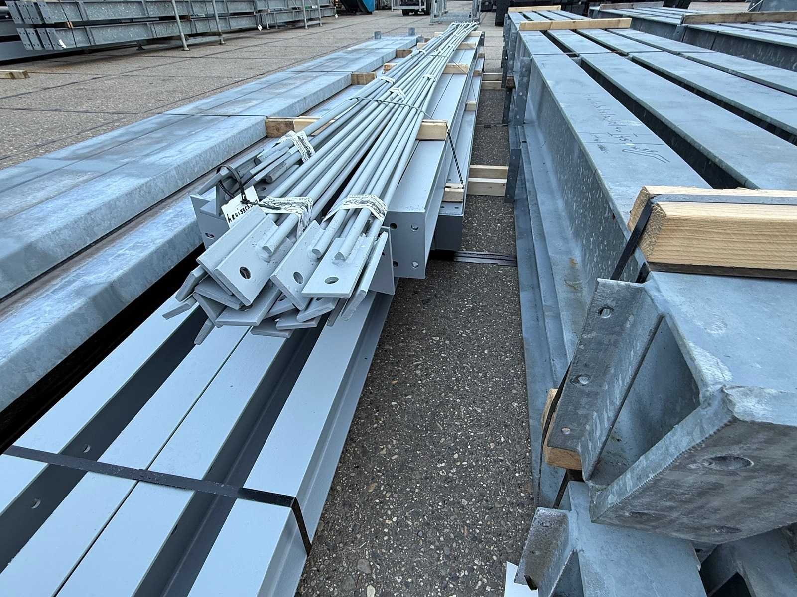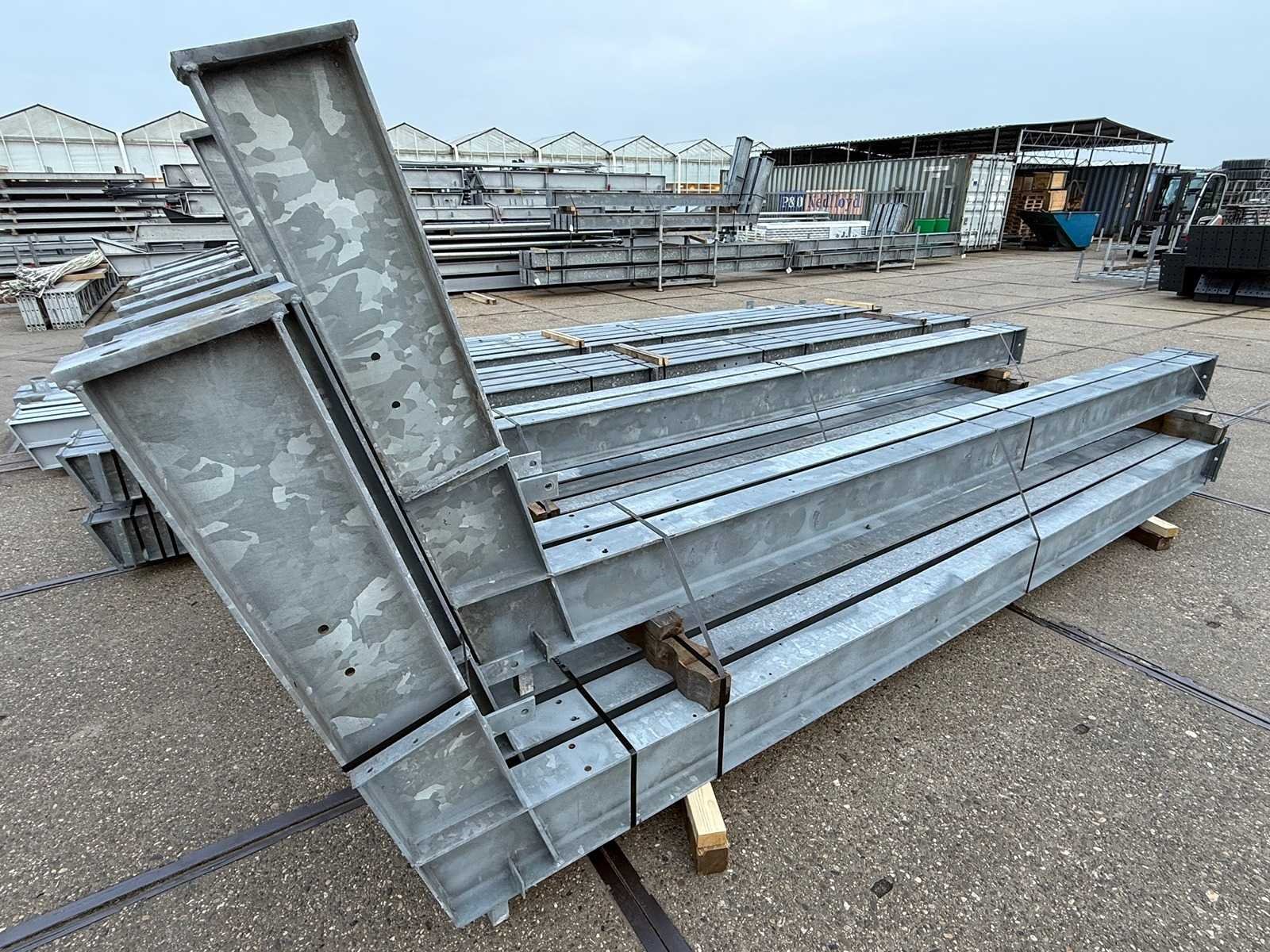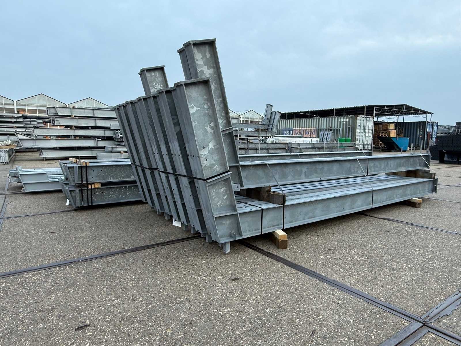 Vrije overspanning; spanten h.o.h. 5.00 meter; dakhelling 15 graden; bestaat uit 8 sets tussenspanten met IPE240 staanders en spanten; 2 sets eindspanten met windstijlen in IPE160; inclusief staaltekening; 3D-tekening; voorzien van stalen goten; 31 stuks drukkokers; 2 vakken windverbanden; 2 vakken kruisschoren; gordinglippen tussen de spanten; kavel ligt netjes transportklaar en dient met 1 trailer opgehaald te worden; kavel wordt gratis met een heftruck geladen No Materiaal: Gegalvaniseerd en geschilderd staal Totaal oppervlakte: 666m² Nok hoogte: 6330mm Goot hoogte: 4350mm Totale afmeting L: 45000mm Totale afmeting Breedte: 14800mm