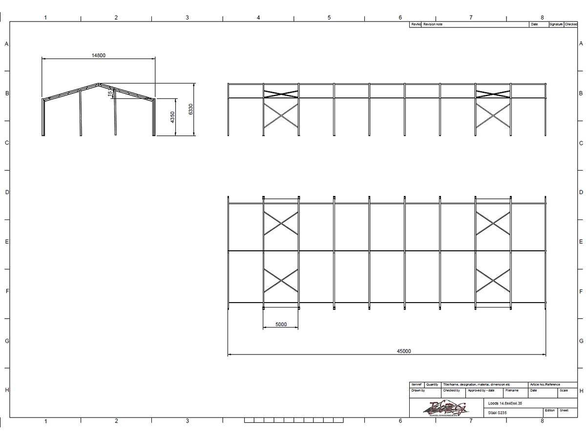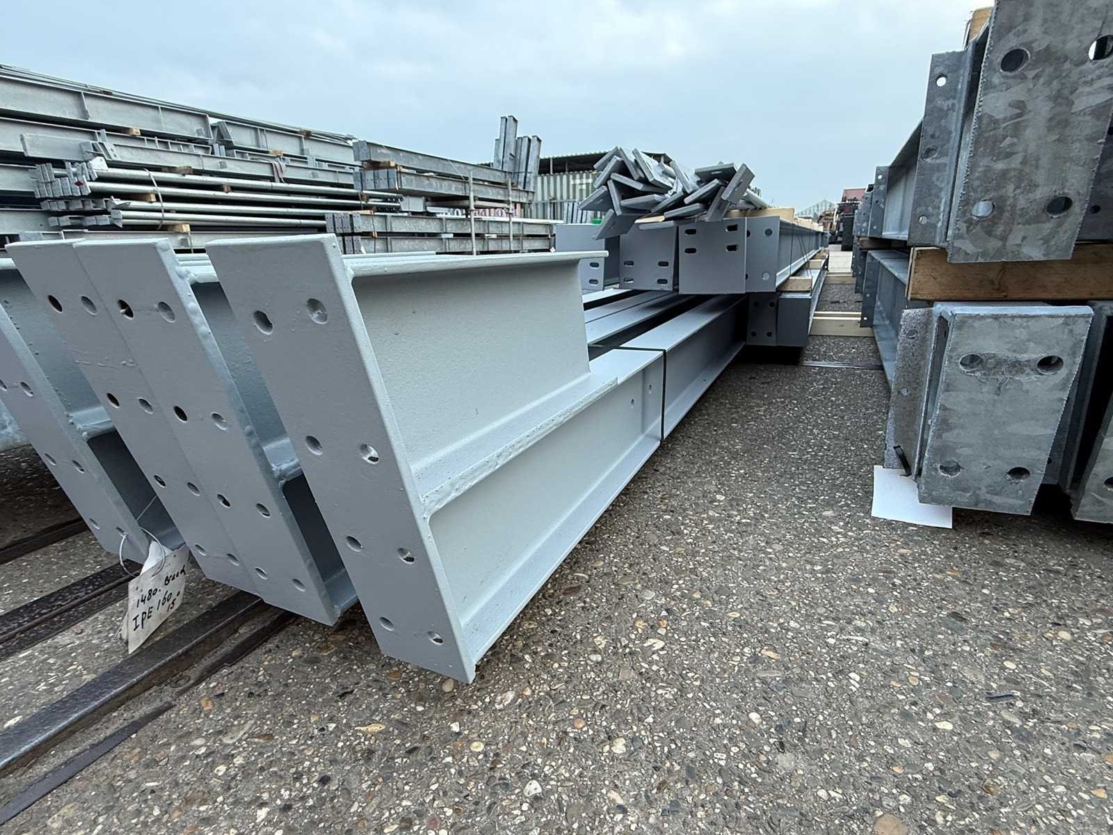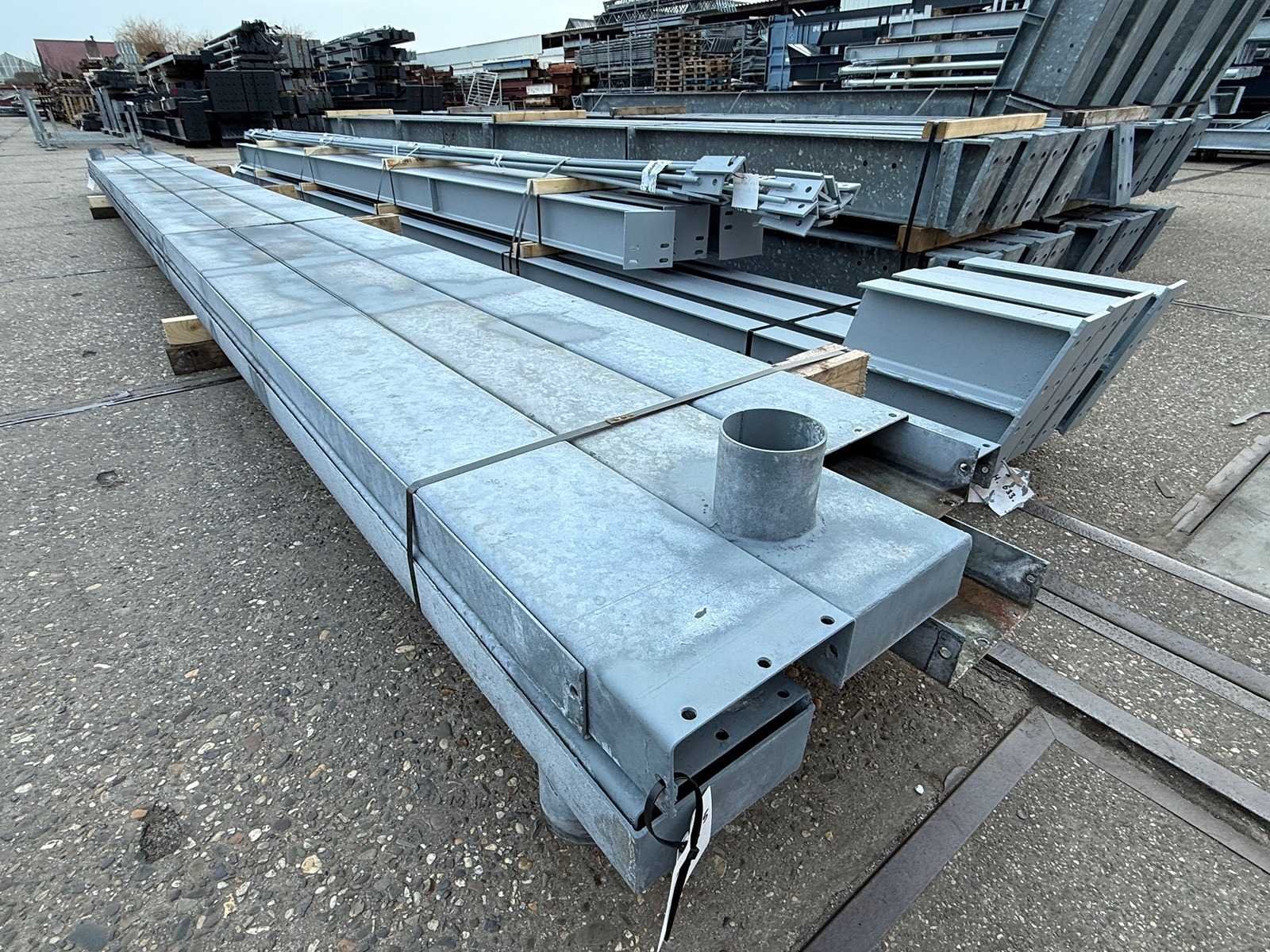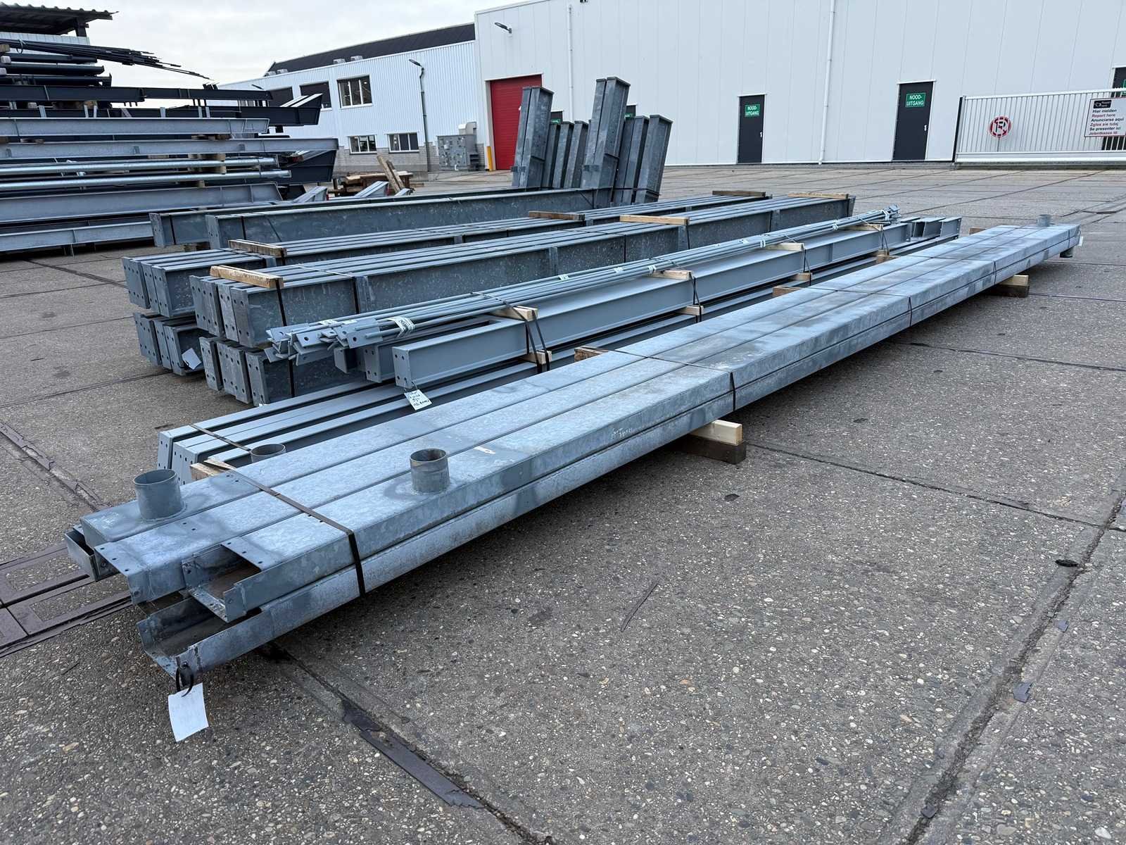 Vrije overspanning; spanten h.o.h. 5.00 meter; dakhelling 15 graden; bestaat uit 8 sets tussenspanten met IPE240 staanders en spanten; 2 sets eindspanten met windstijlen in IPE160; inclusief staaltekening; 3D-tekening; voorzien van stalen goten; 31 stuks drukkokers; 2 vakken windverbanden; 2 vakken kruisschoren; gordinglippen tussen de spanten; kavel ligt netjes transportklaar en dient met 1 trailer opgehaald te worden; kavel wordt gratis met een heftruck geladen No Materiaal: Gegalvaniseerd en geschilderd staal Totaal oppervlakte: 666m² Nok hoogte: 6330mm Goot hoogte: 4350mm Totale afmeting L: 45000mm Totale afmeting Breedte: 14800mm