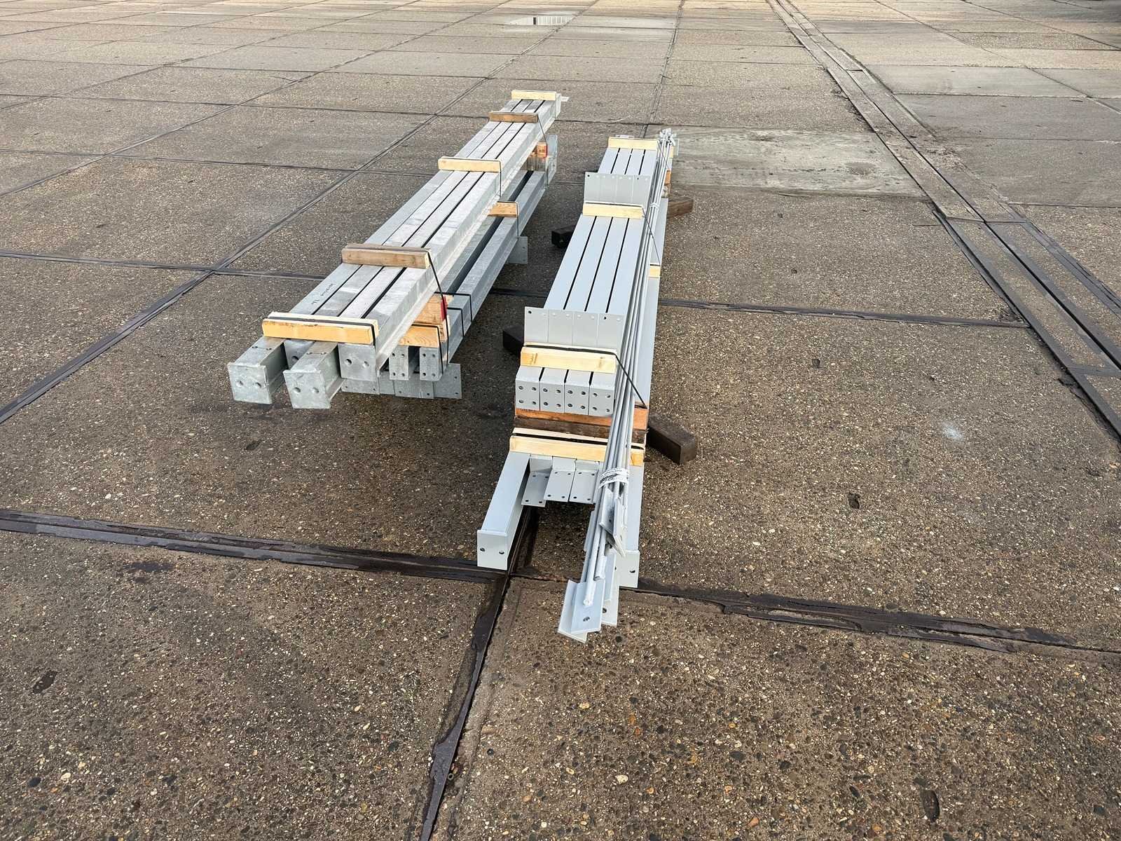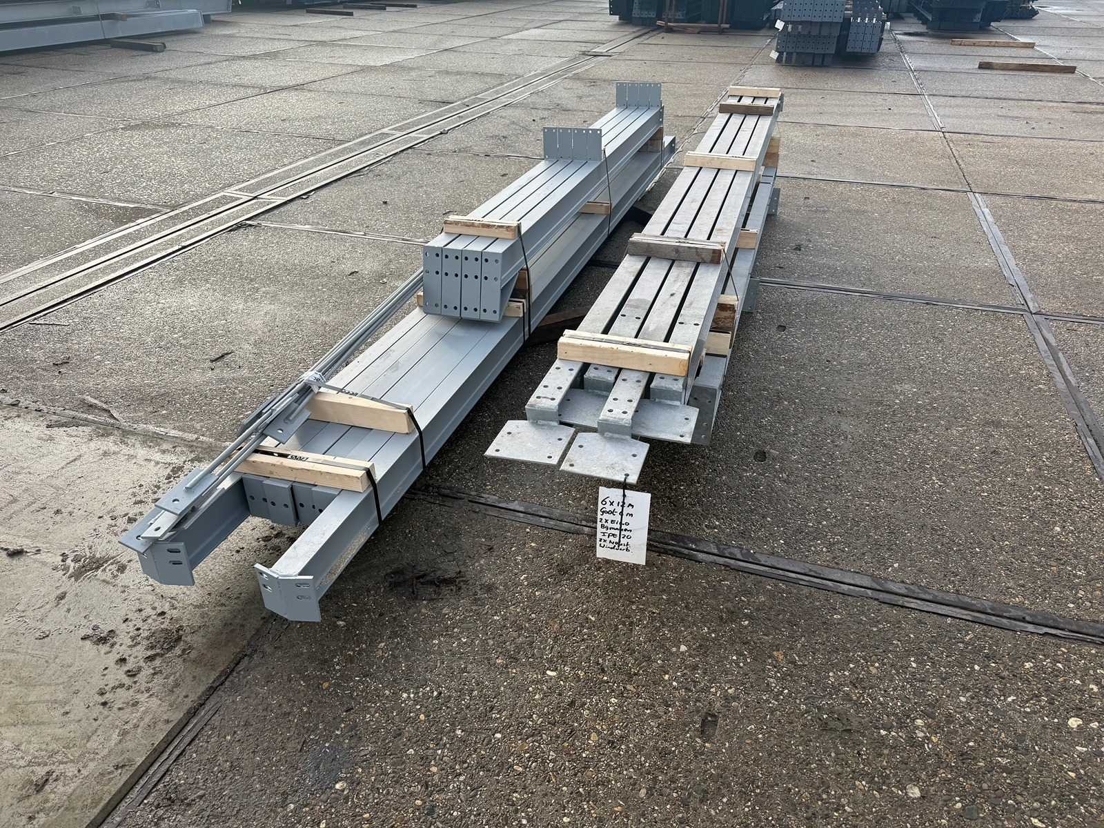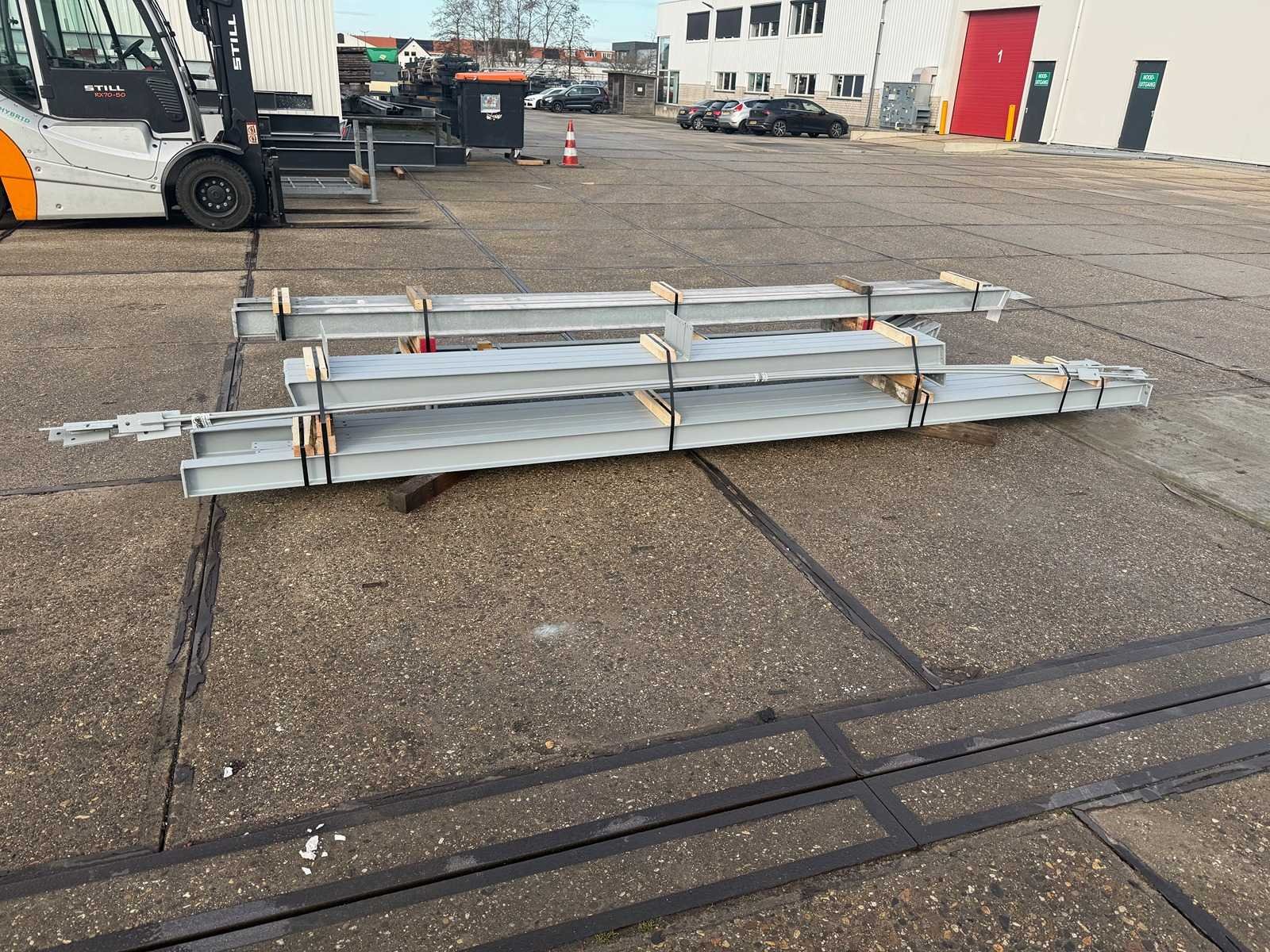 Vrije overspanning, spanten h.o.h. 4000mm, bestaande uit 2 sets tussenspanten IPE120, 2 sets eindspanten met windstijlen IPE120, voorzien van windverbanden, gordinglippen op de spanten, detailtekening tussenspanten, staalconstructie ligt netjes transportklaar en dient met 1 trailer opgehaald te worden, kavel wordt gratis geladen met een heftruck No Materiaal: Thermisch verzinkt en geschilderd staal Totaal oppervlakte: 72m² Nok hoogte: 4850mm Goot hoogte: 4000mm Totale afmeting L: 12000mm Totale afmeting Breedte: 6000mm