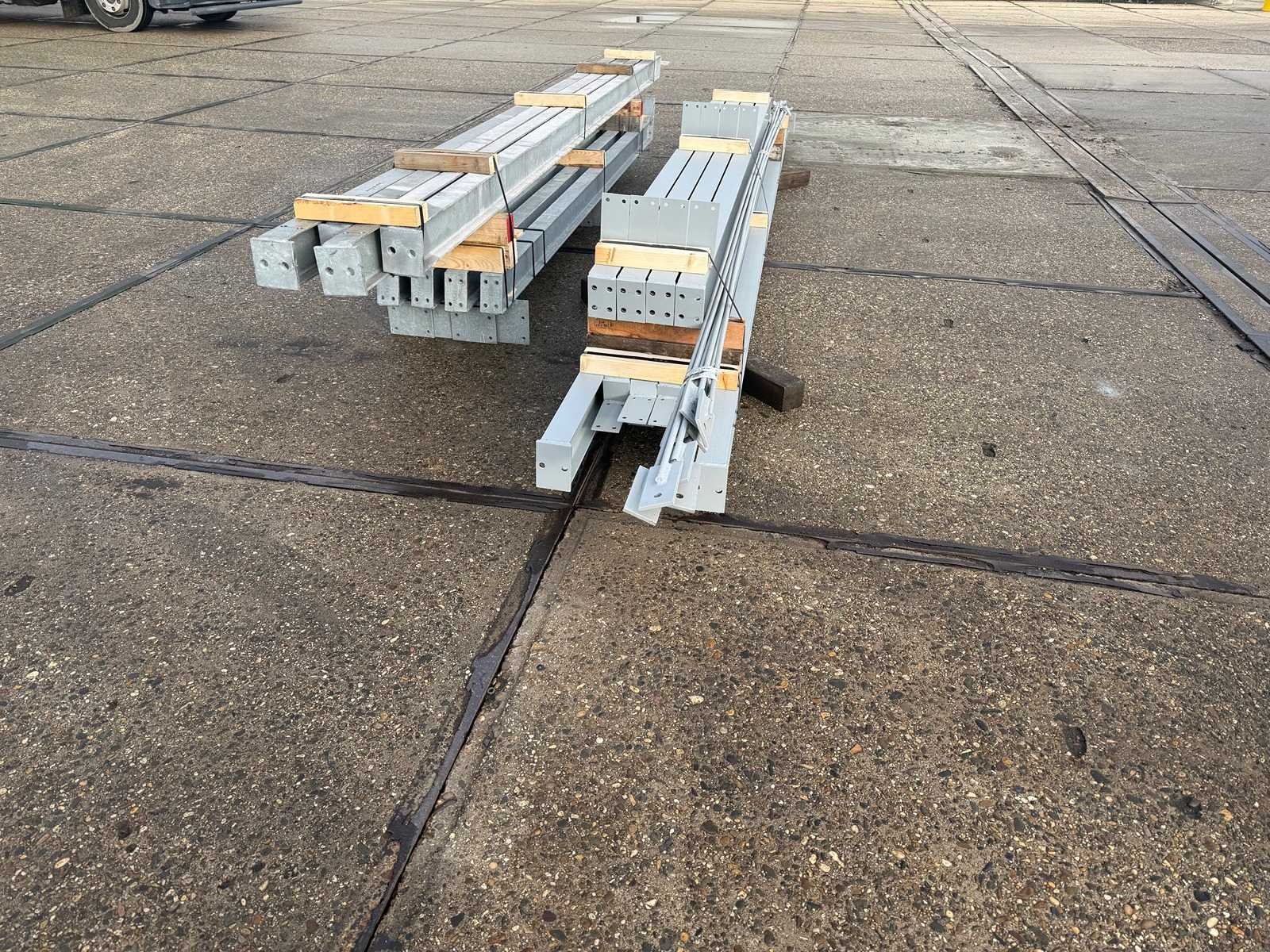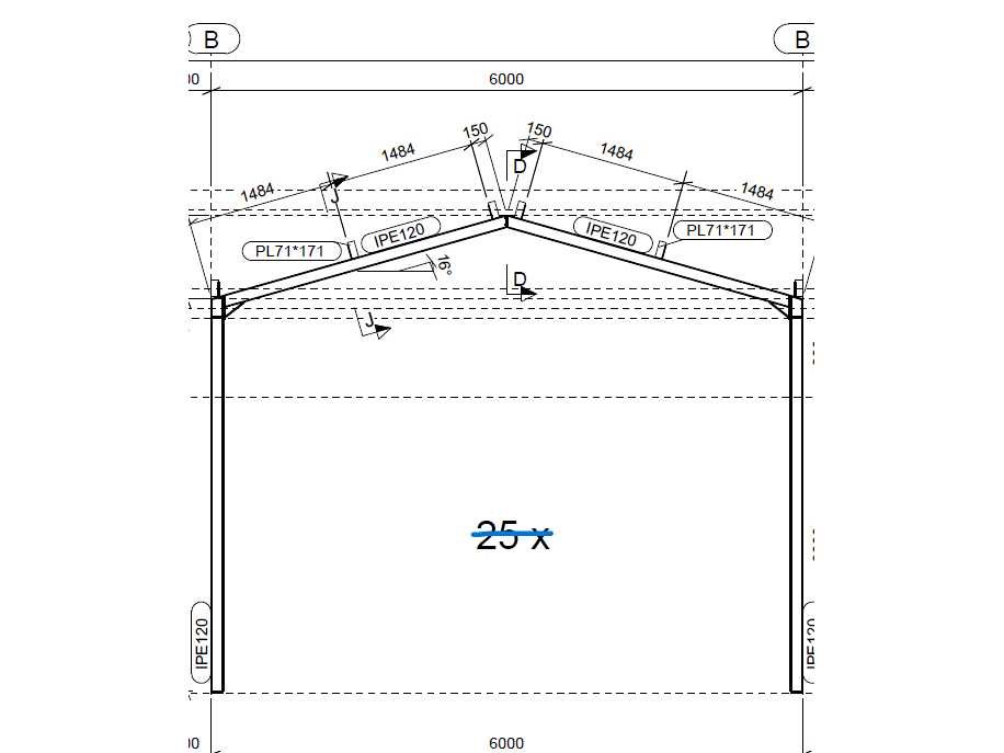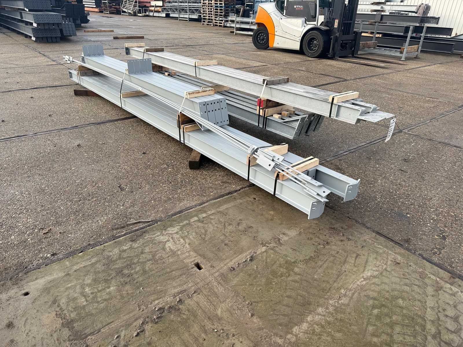 Vrije overspanning, spanten h.o.h. 4000mm, bestaande uit 2 sets tussenspanten IPE120, 2 sets eindspanten met windstijlen IPE120, voorzien van windverbanden, gordinglippen op de spanten, detailtekening tussenspanten, staalconstructie ligt netjes transportklaar en dient met 1 trailer opgehaald te worden, kavel wordt gratis geladen met een heftruck No Materiaal: Thermisch verzinkt en geschilderd staal Totaal oppervlakte: 72m² Nok hoogte: 4850mm Goot hoogte: 4000mm Totale afmeting L: 12000mm Totale afmeting Breedte: 6000mm