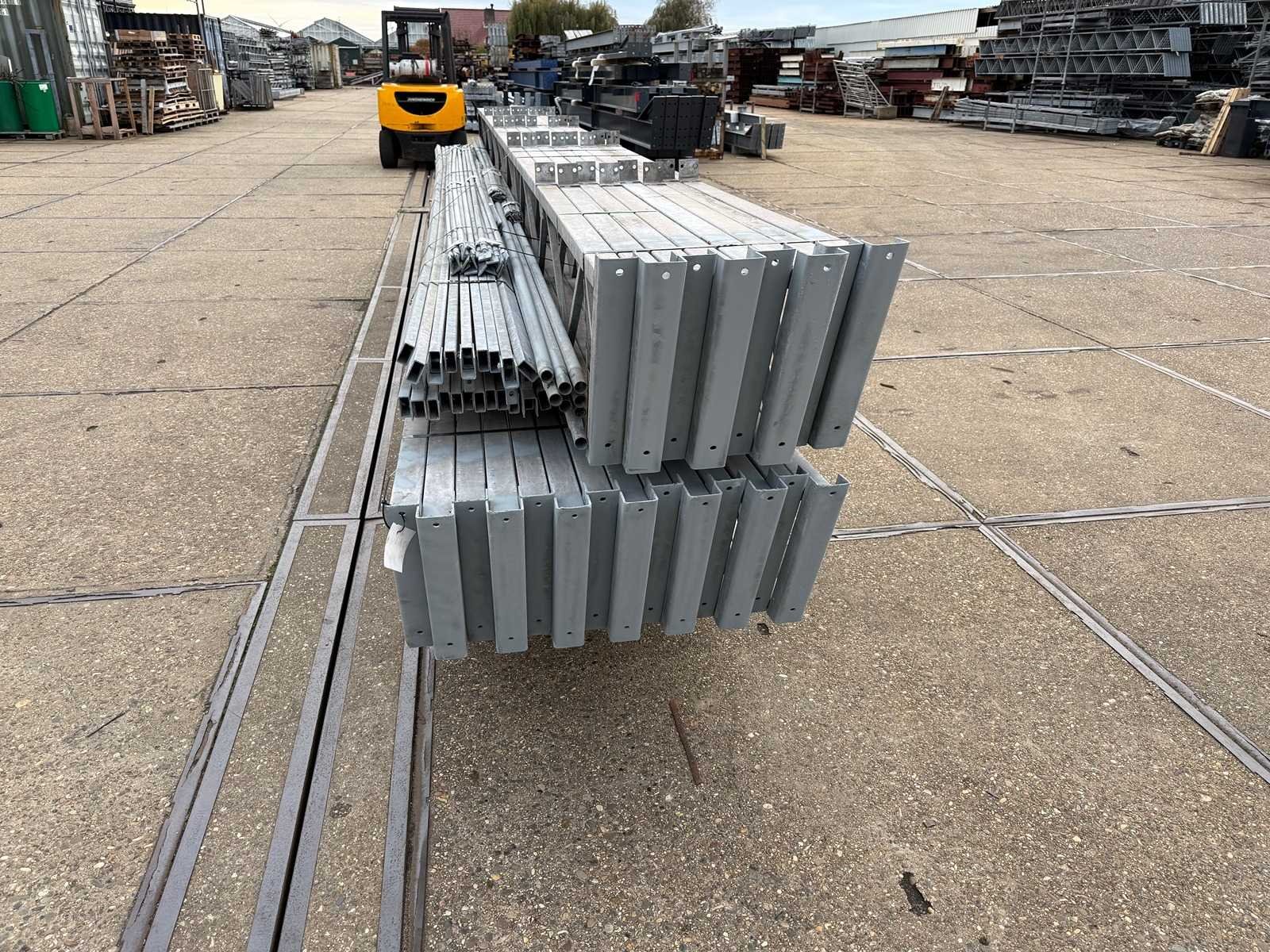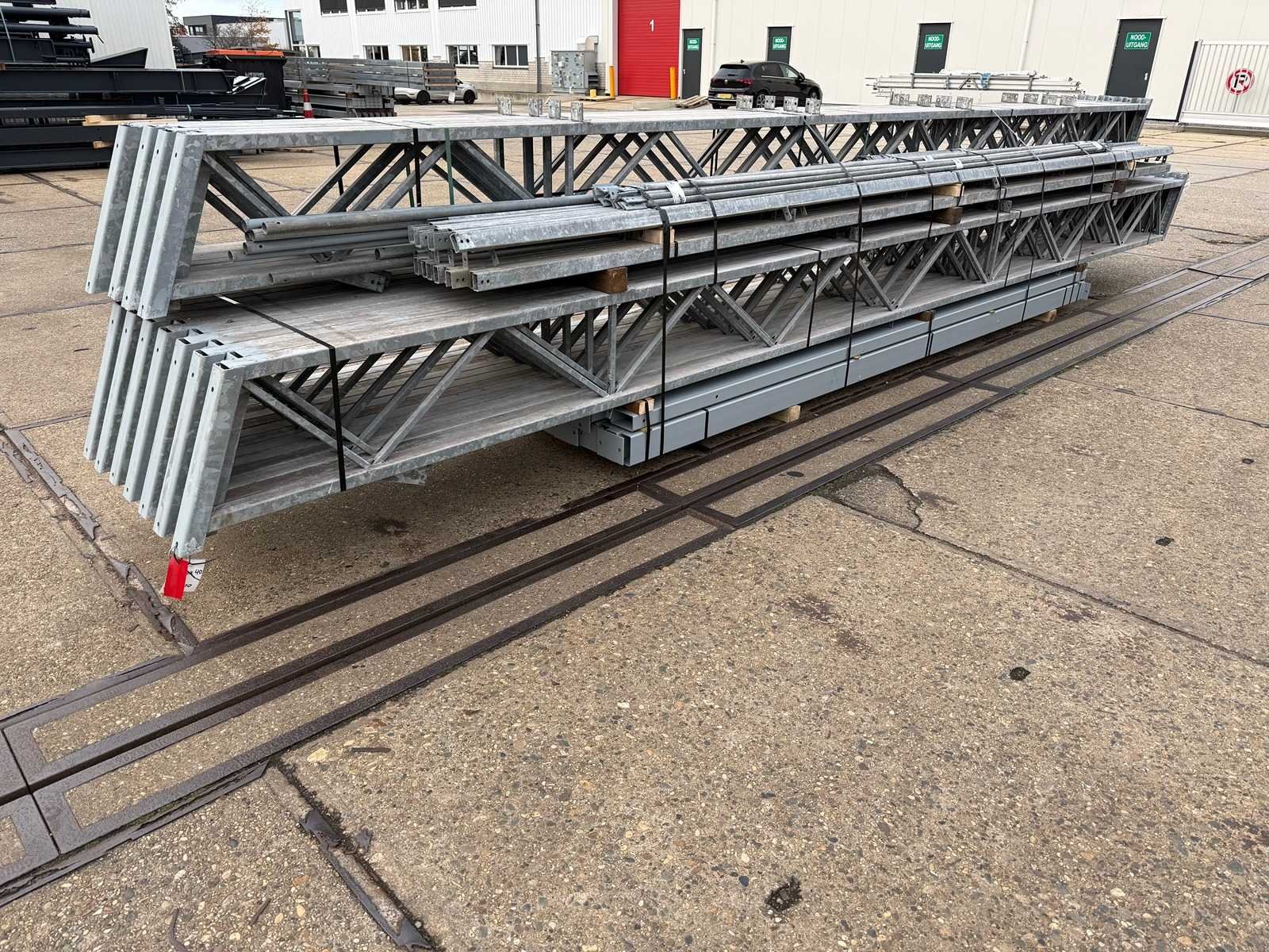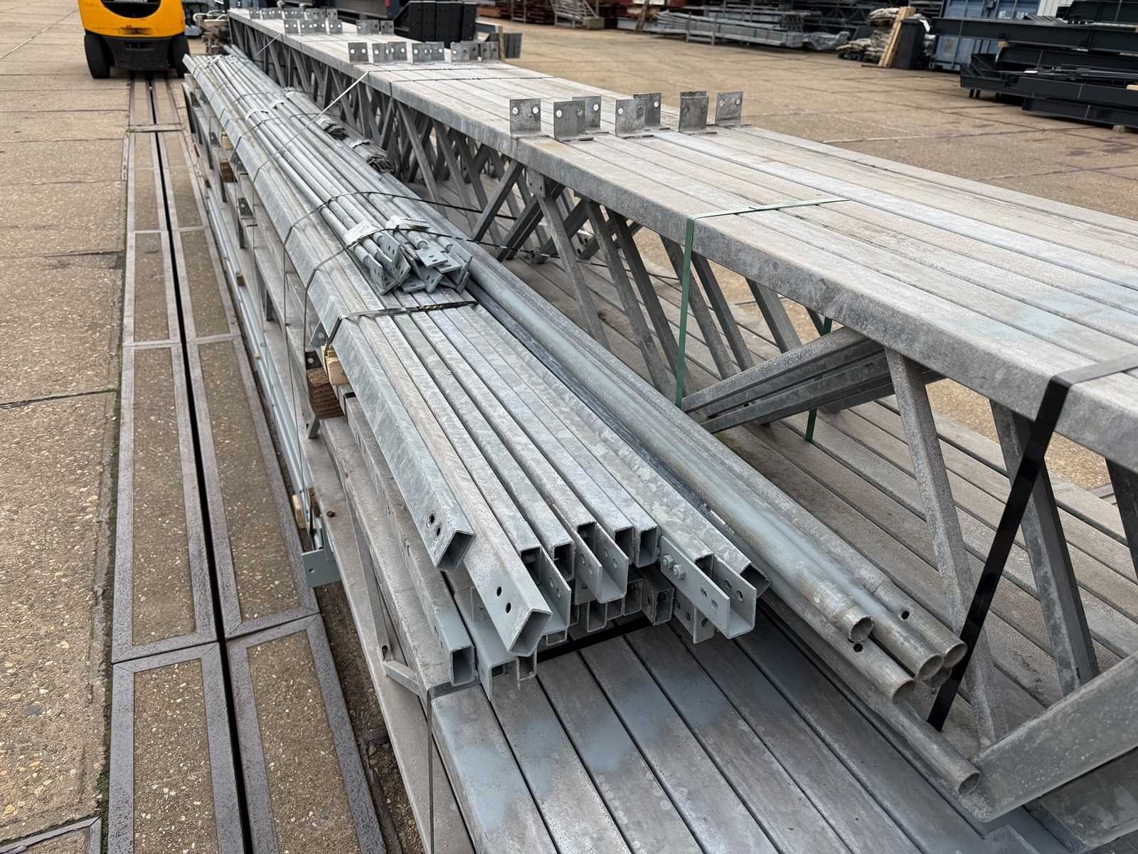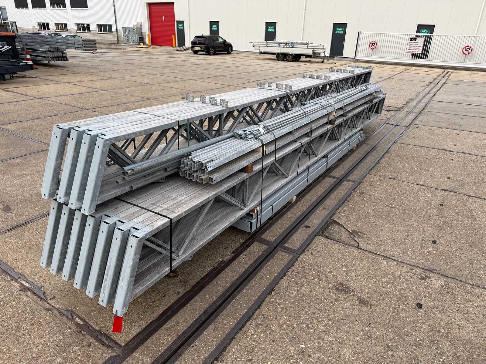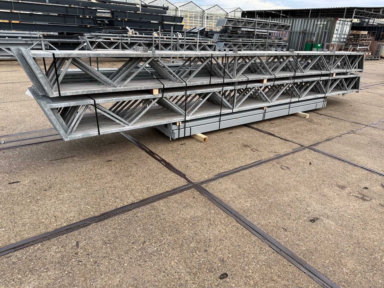 Overspanning trekstang tussen de spanten; spanten h.o.h. 4000mm; kokerprofiel als staanders en traliespanten; staaltekening; 3D-tekening; dakhelling 25 graden; 11 sets tussenspanten; voorzien van trekstangen met ophangstrips; windverbanden en kruisschoren; kavel ligt netjes transportklaar en dient met 1 trailer opgehaald te worden; kavel wordt gratis met een heftruck geladen No Materiaal: Gegalvaniseerd en geschilderd staal Totaal oppervlakte: 512m² Nok hoogte: 7000mm Goot hoogte: 4500mm Totale afmeting L: 40000mm Totale afmeting Breedte: 12800mm