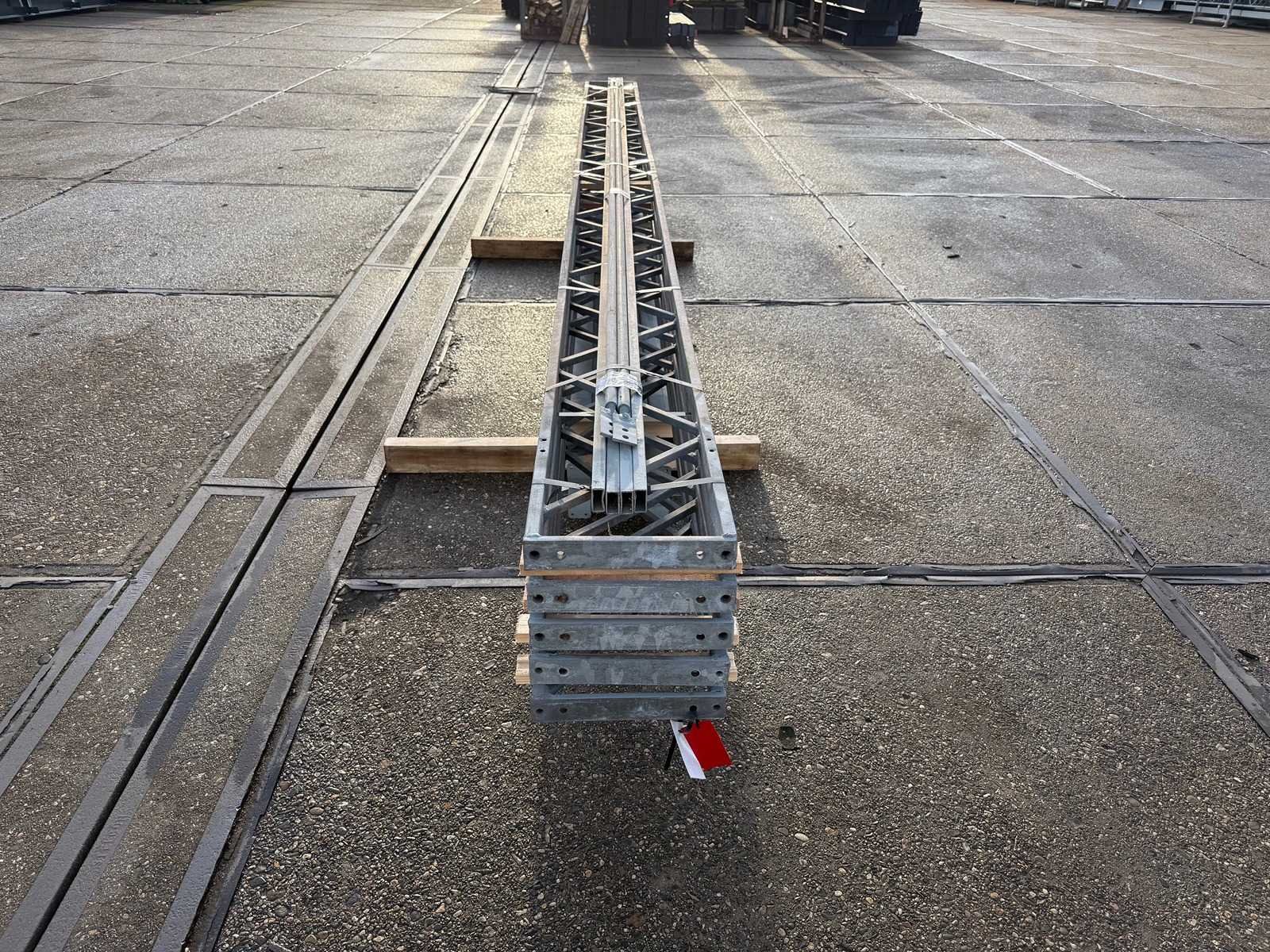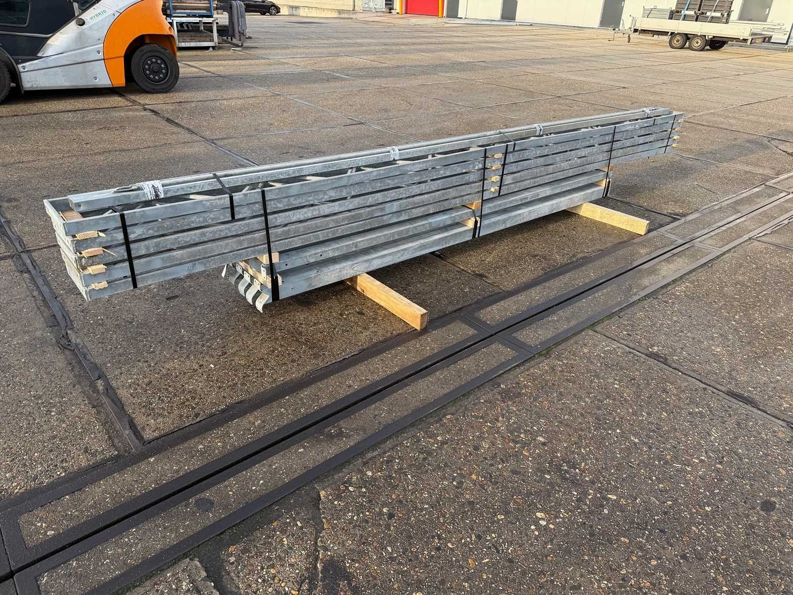 Platdak staalconstructie; vrije overspanning; spanten h.o.h. 4000mm; bestaande uit 5 sets tralieliggers met kokers als staanders; voorzien van windverbanden en kruisschoren; staalconstructie ligt netjes transportklaar en dient met 1 trailer opgehaald te worden; kavels wordt gratis met een heftruck geladen No Materiaal: Gegalvaniseerd staal Type: Platdak Totaal oppervlakte: 78m² Nok hoogte: 3000mm Goot hoogte: 3000mm Totale afmeting L: 16000mm Totale afmeting Breedte: 4900mm